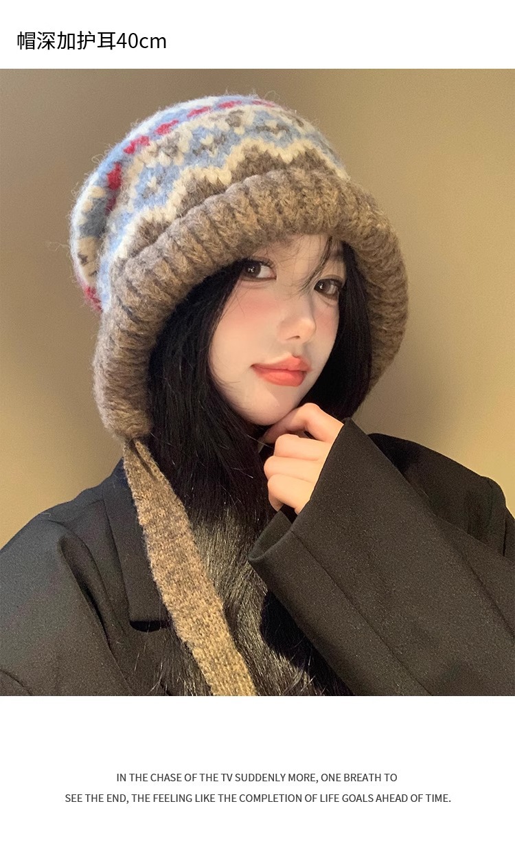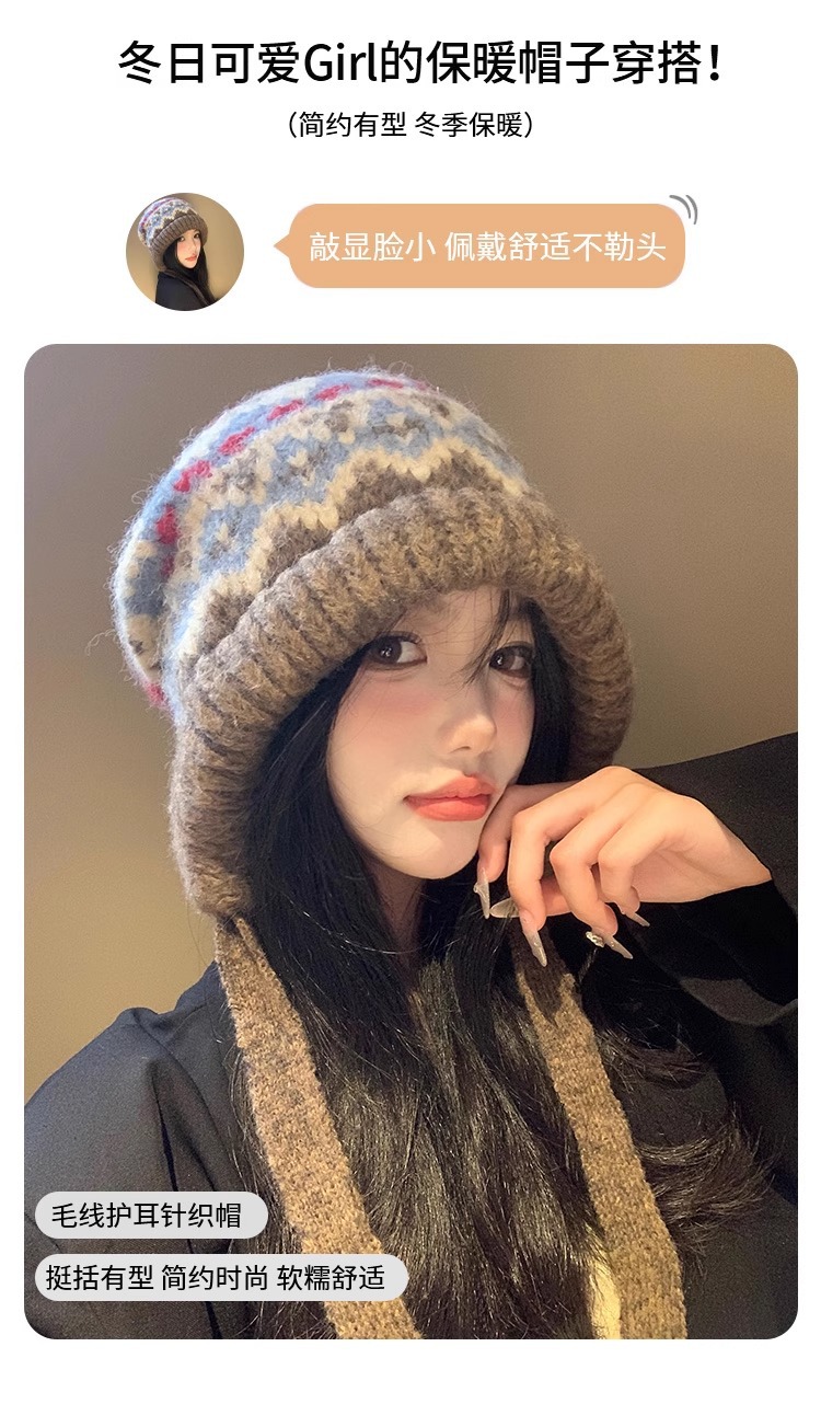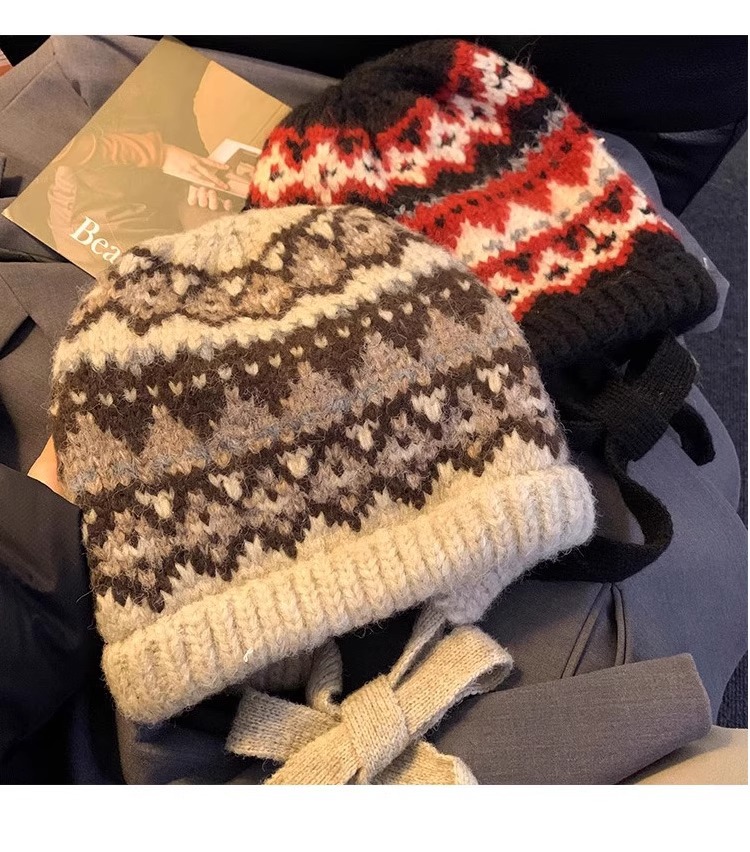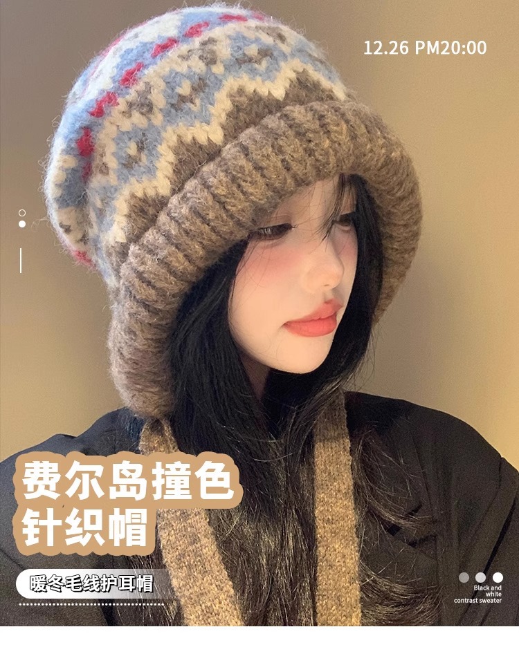 가을 겨울 여성용 페어 아일 스타일 자카드 가방 모자, 고급 컬러 니트 모자, 두껍고 따뜻한 귀 보호 모직 모자스토어 가기