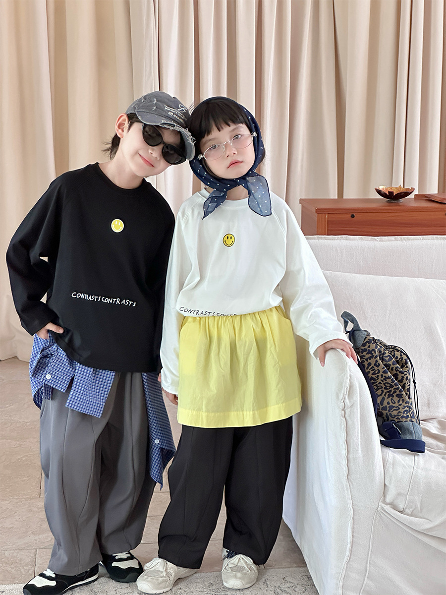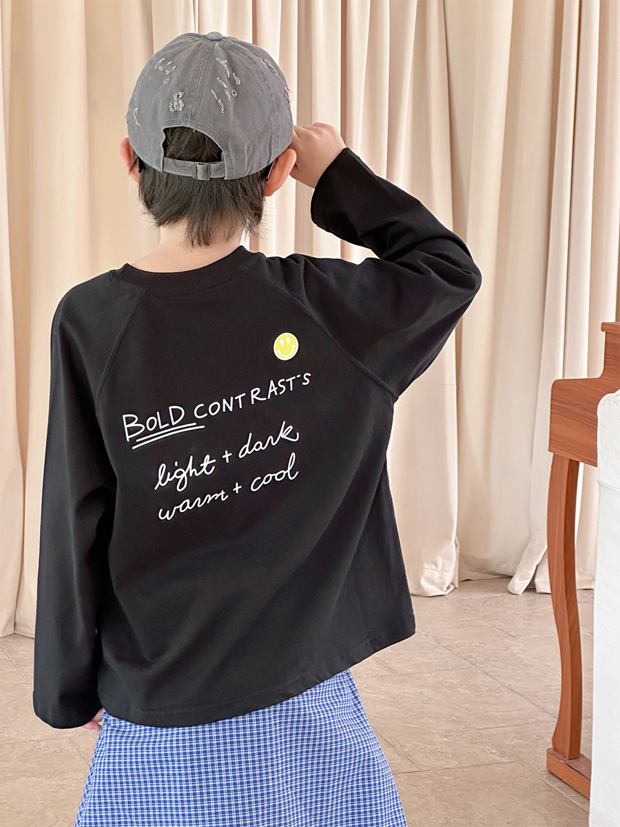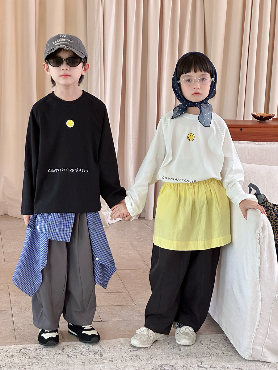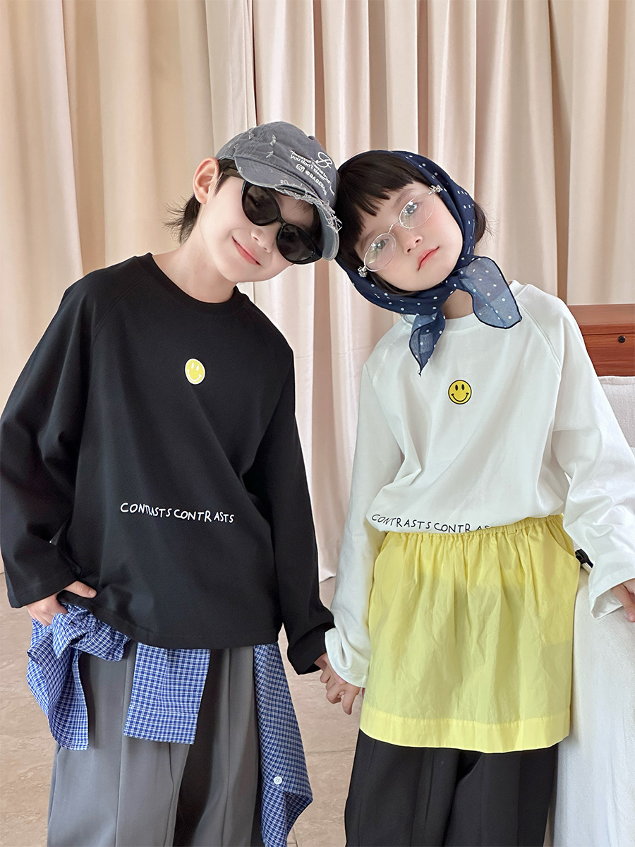 아동 티셔츠 2025 가을 새로운 한국어 버전 아동용 앞면과 뒷면 웃는 얼굴 프린트 긴팔 소년 다용도 라운드 넥 바닥 셔츠