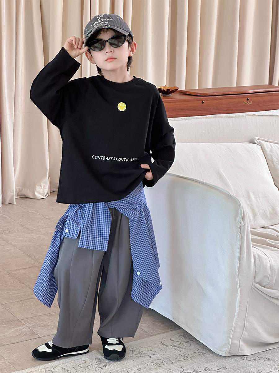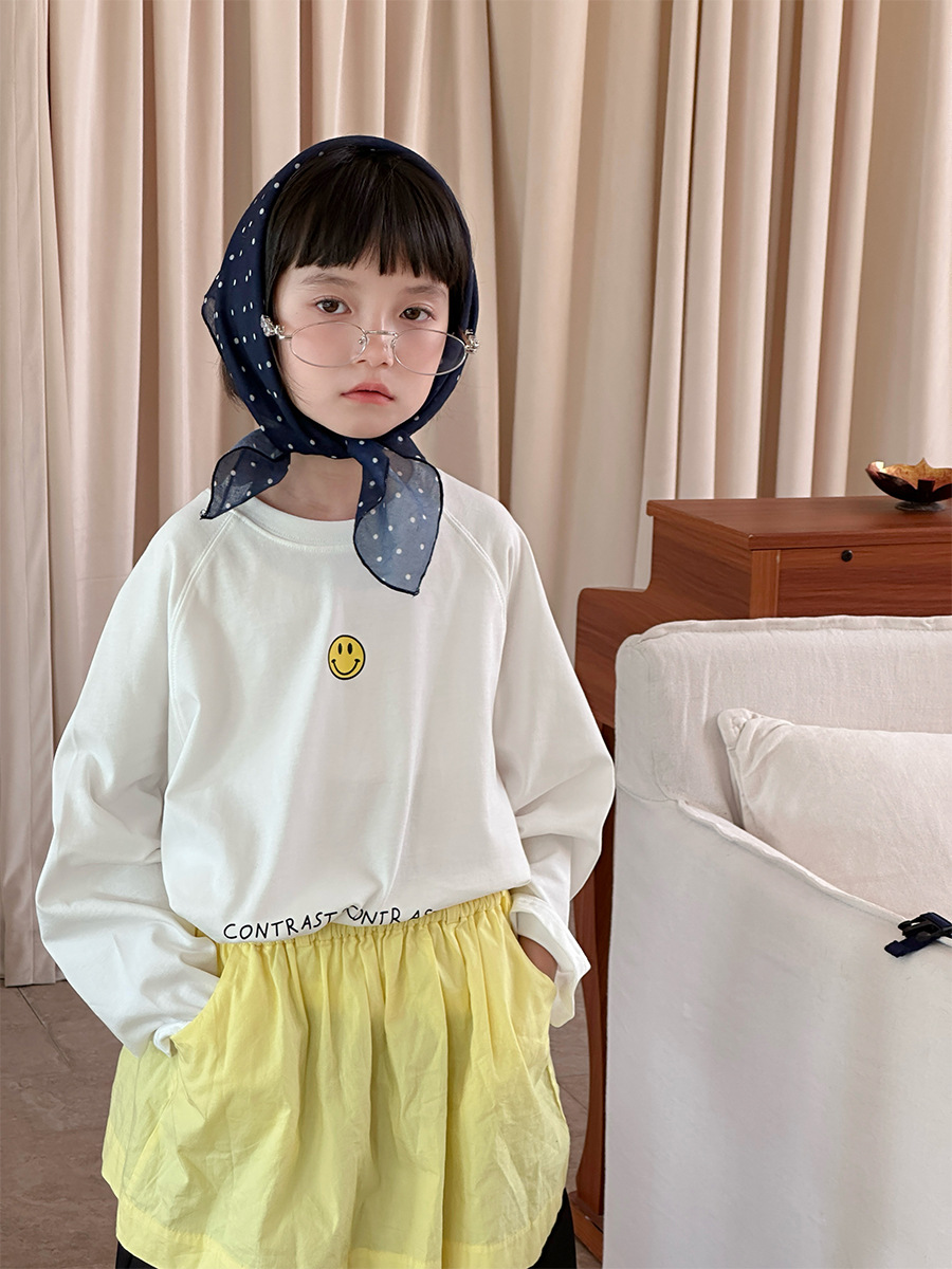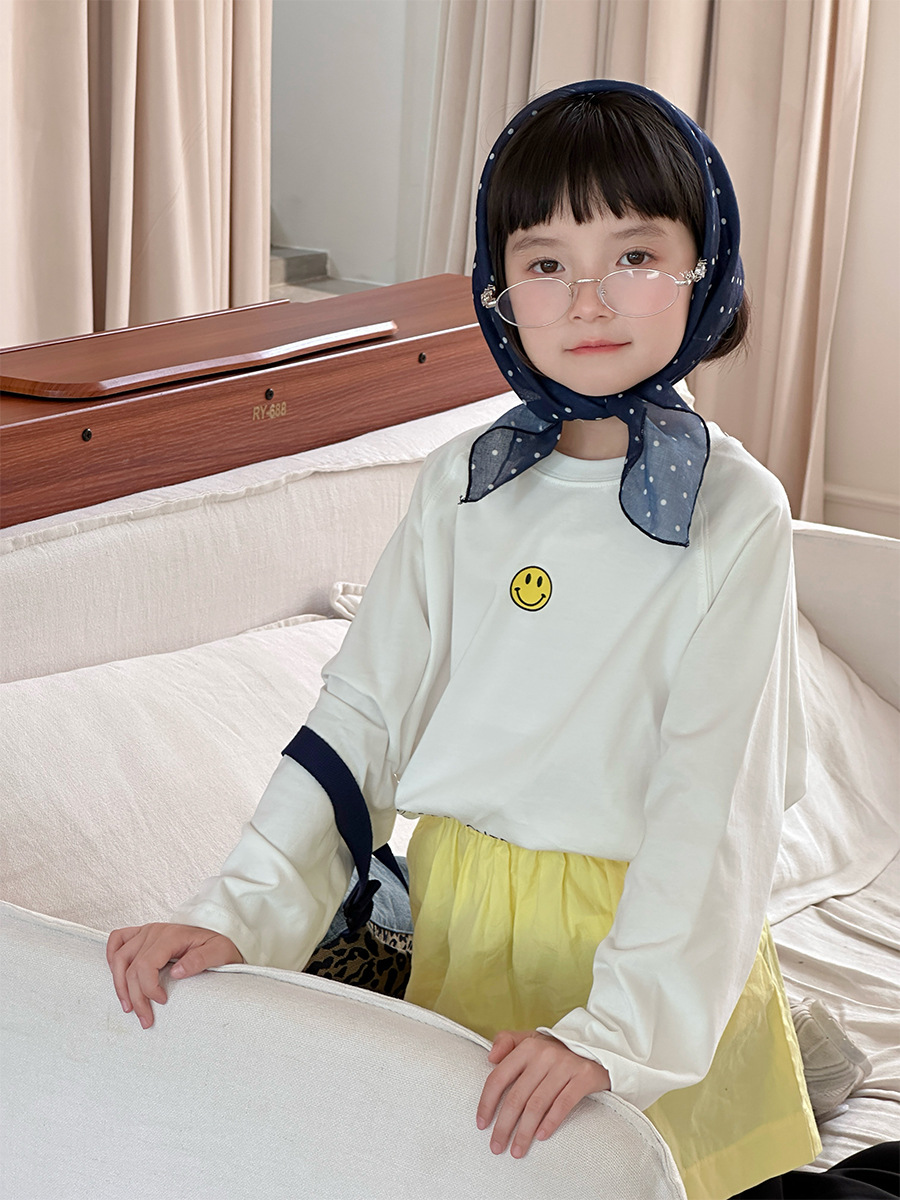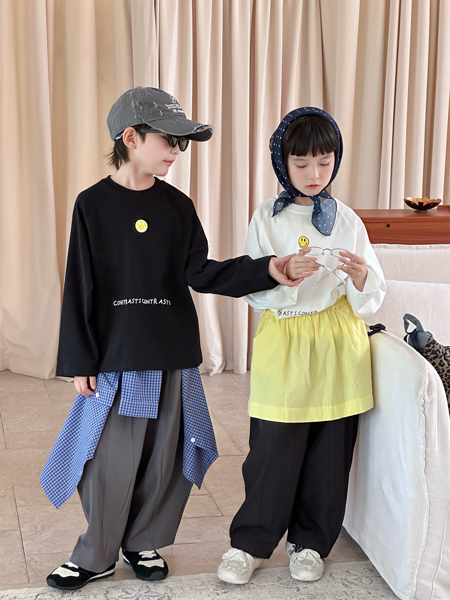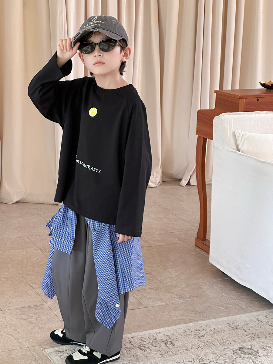 아동 티셔츠 2025 가을 새로운 한국어 버전 아동용 앞면과 뒷면 웃는 얼굴 프린트 긴팔 소년 다용도 라운드 넥 바닥 셔츠