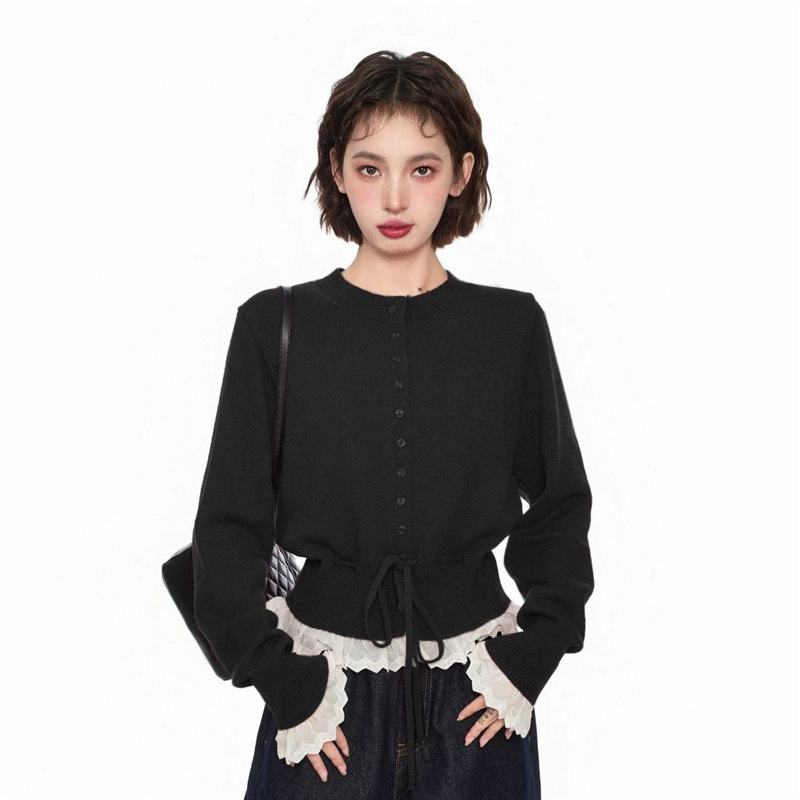 韩系红色假两件圆领拼接针织开衫女秋冬季收腰设计感抽绳内搭上衣
