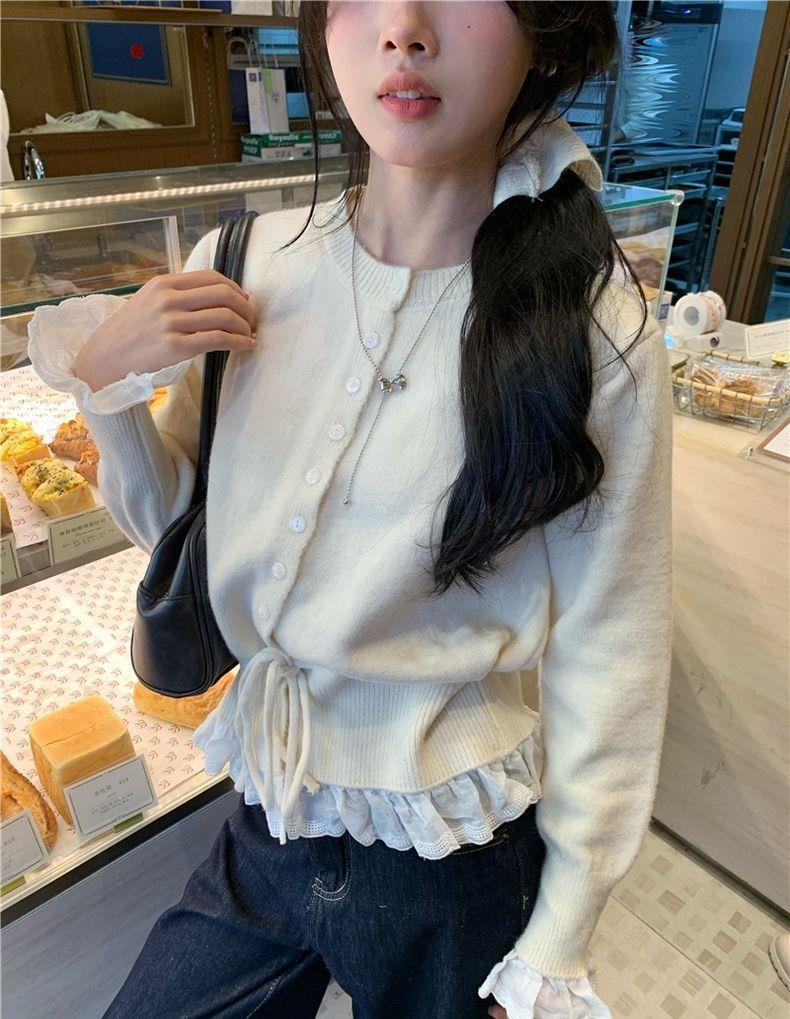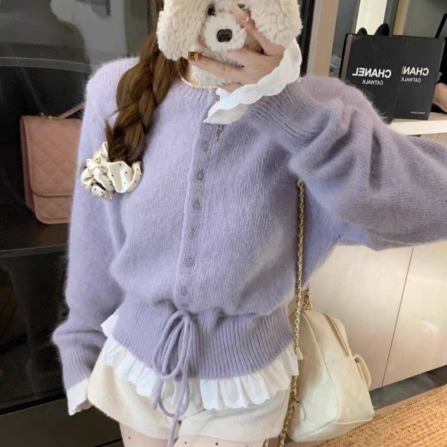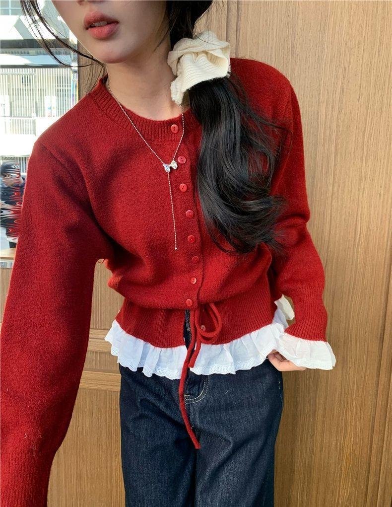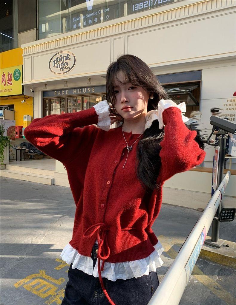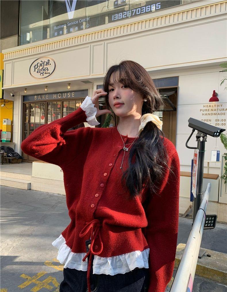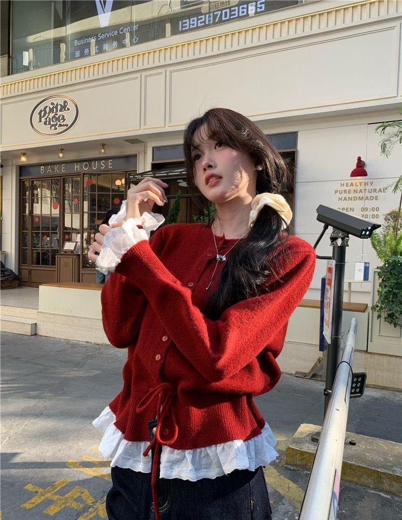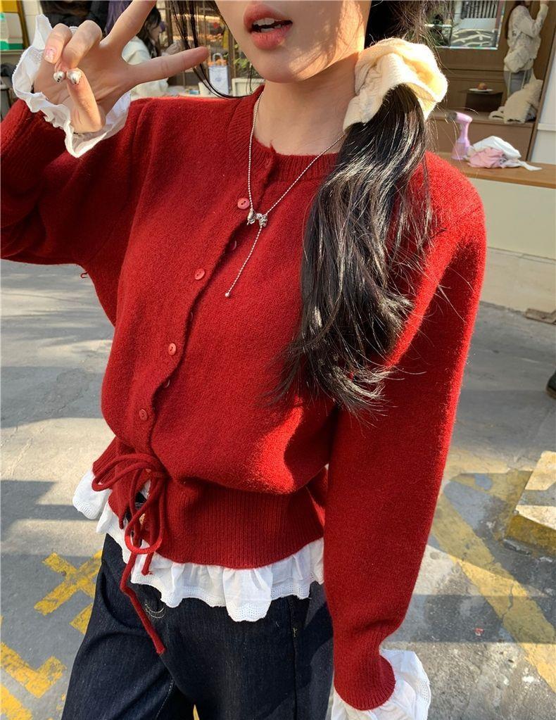 韩系红色假两件圆领拼接针织开衫女秋冬季收腰设计感抽绳内搭上衣스토어 가기