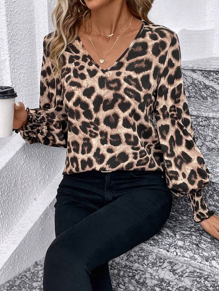 Spot 유럽 및 미국 국경 간 Amazon AliExpress 2025 봄, 가을 클래식 레오파드 프린트 V 넥 랜턴 슬리브 긴팔 셔츠스토어 가기