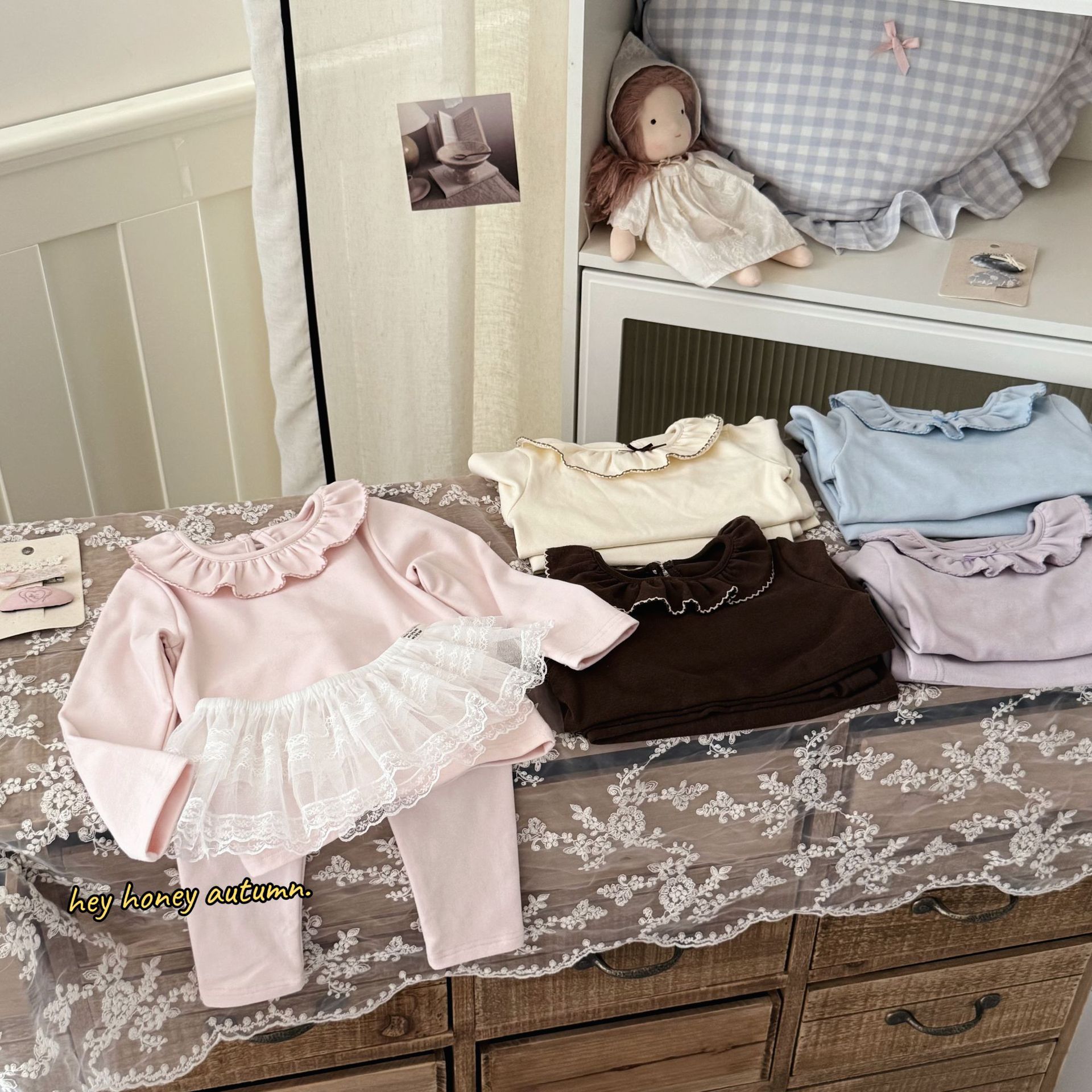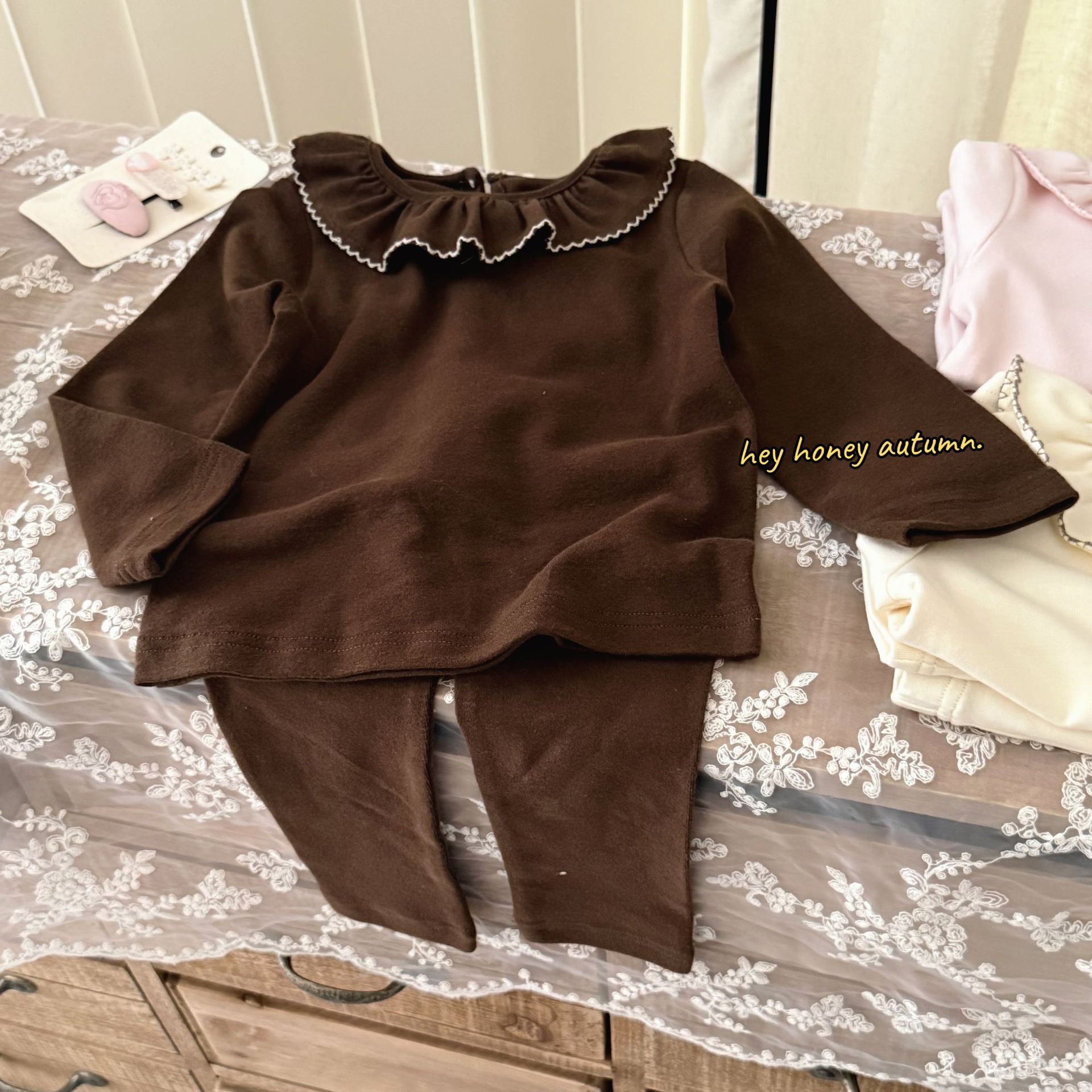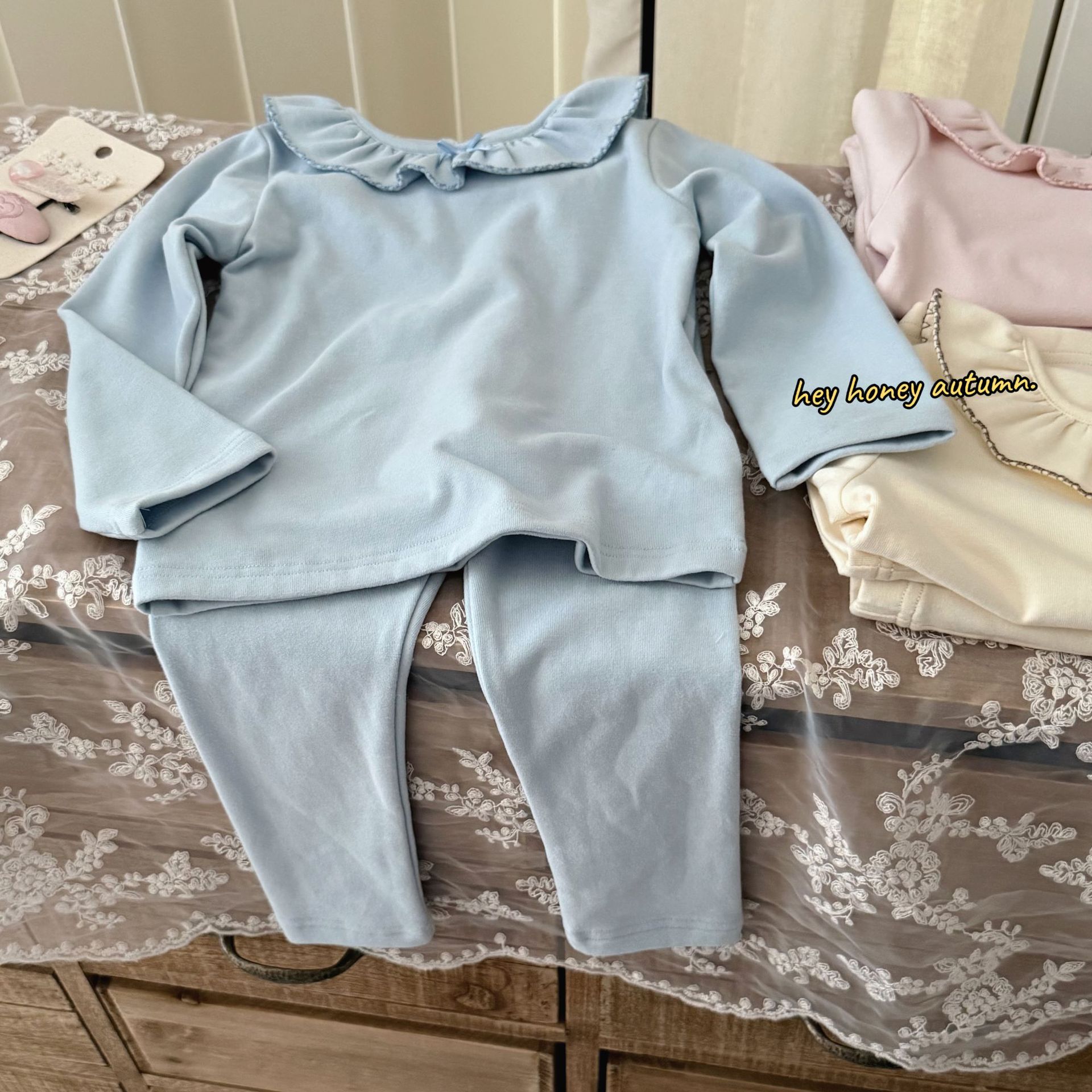크고 작은 롤 스타일 한국 스타일 봄, 가을 소녀 홈웨어 세트 레이스 칼라 서양식 잠옷 및 잠옷 투피스 세트스토어 가기