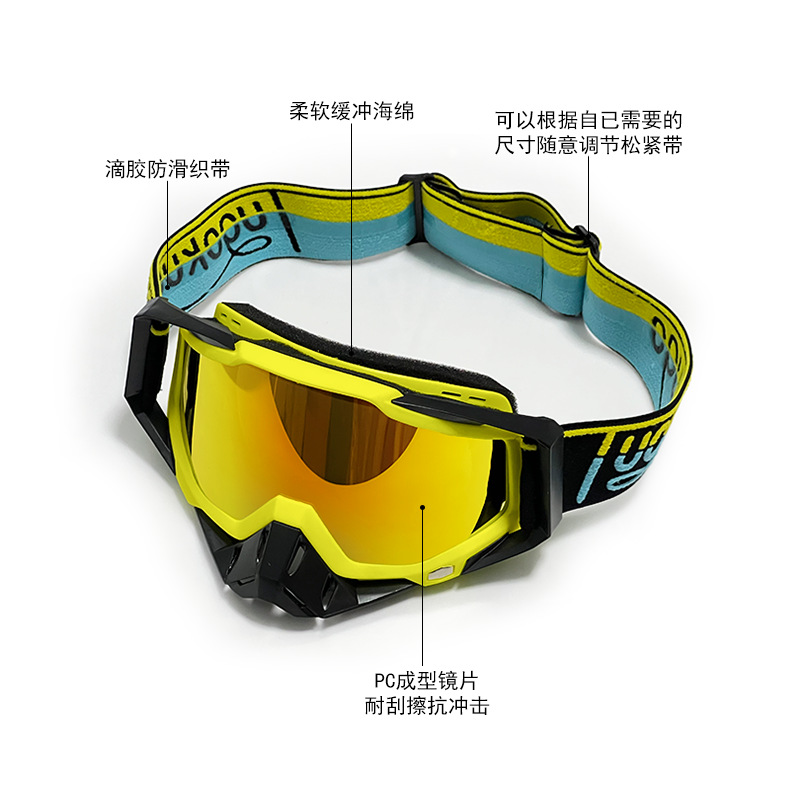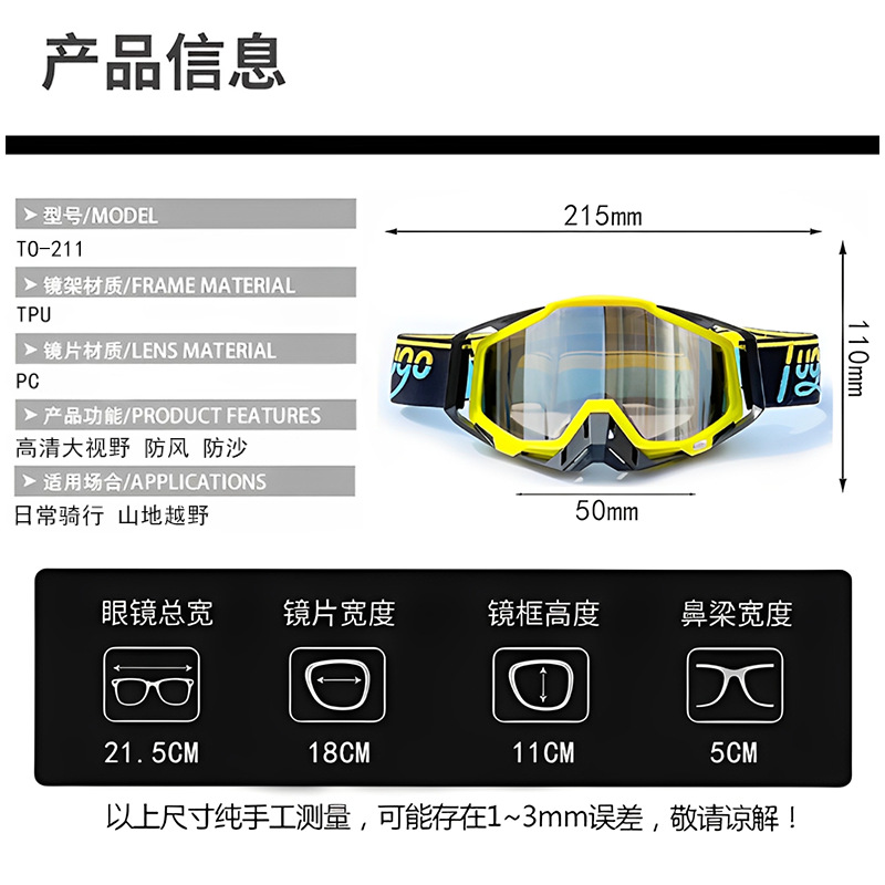 炫酷外观,高清大视野,内部可卡近视眼镜;可适应越野,骑行等场景;内置柔软海绵透气舒适;PC成型镜片更抗冲击耐刮擦,防风沙;