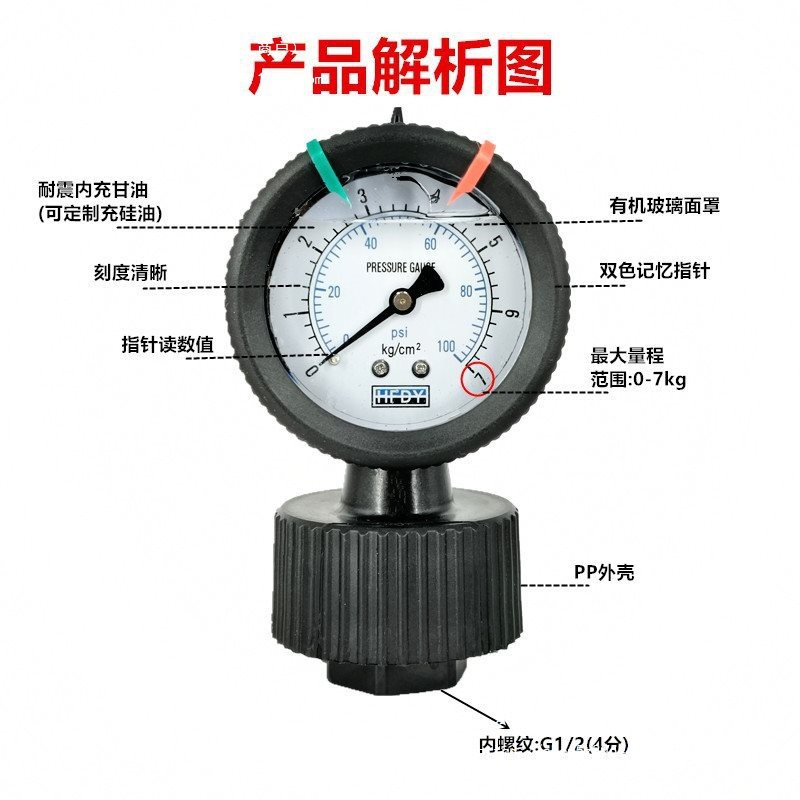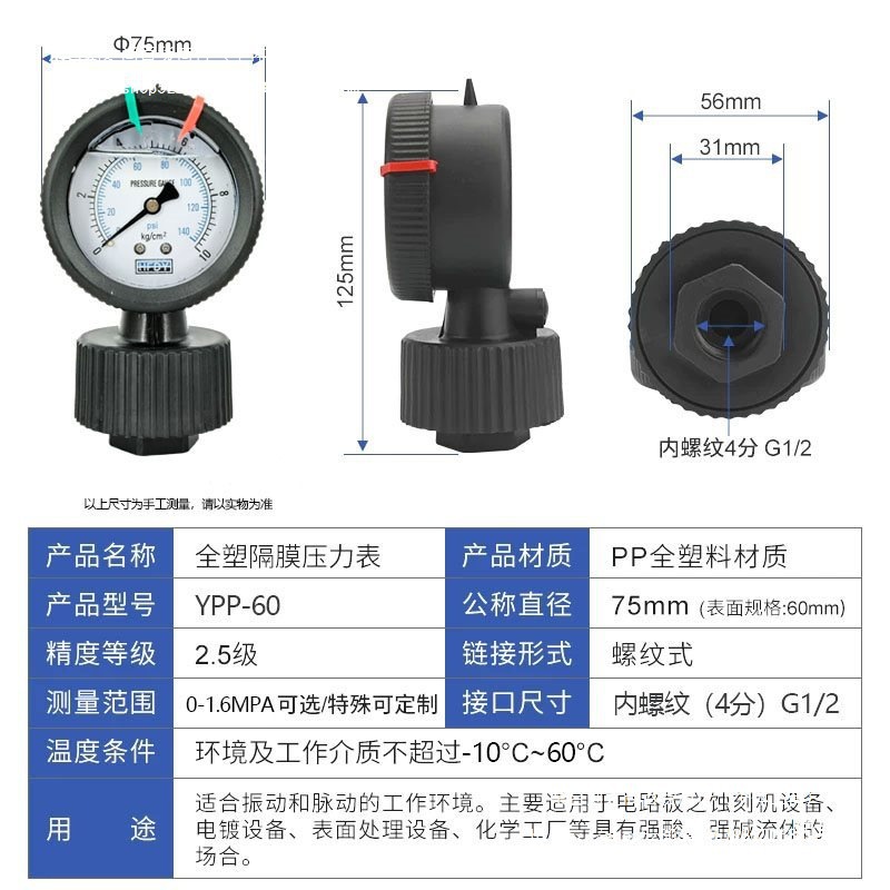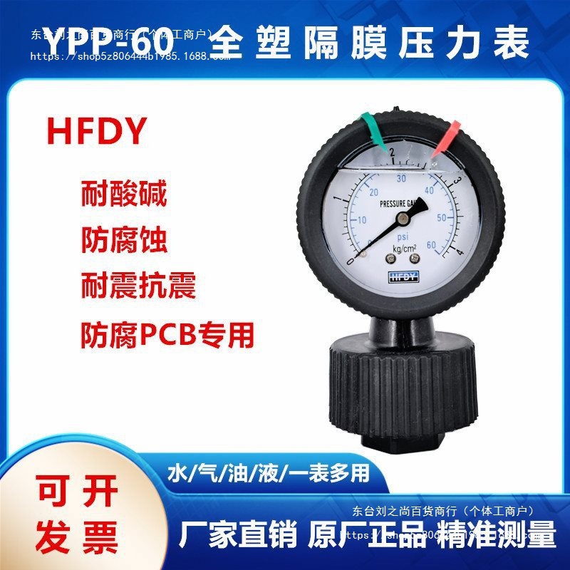 HFDY 수처리 PP 전체 플라스틱 다이어프램 압력계 PCBYNPP-60 산 및 알칼리 내식성 10KG Leidezhu스토어 가기