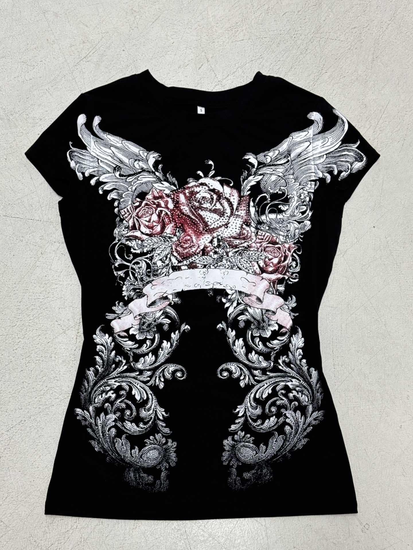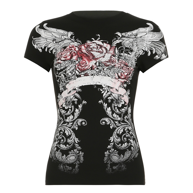 Y2K 고딕 스타일 프린트 라운드 넥 티셔츠 여성 2025 유럽 스테이션 맞춤형 핫 소녀 트렌디 여성 슬림 반팔 탑