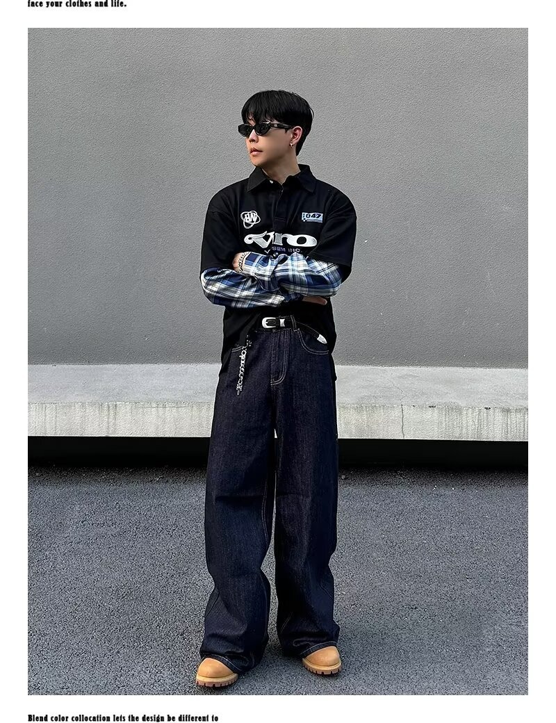 아메리칸 트렌디 브랜드 남성용 다크 블루 청바지, 레트로 스트레이트 레그 루즈 캐주얼 틈새 디자인, 남성용 핸섬 와이드 레그 팬츠스토어 가기