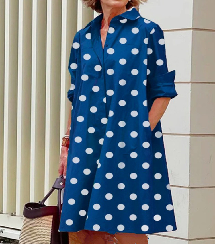 2022 Amazon 가을 신상품 패셔너블한 폴카 도트 프린트 셔츠 칼라 긴팔 미디 드레스
