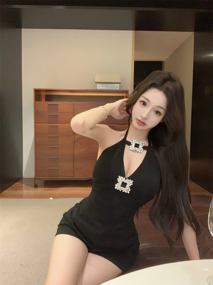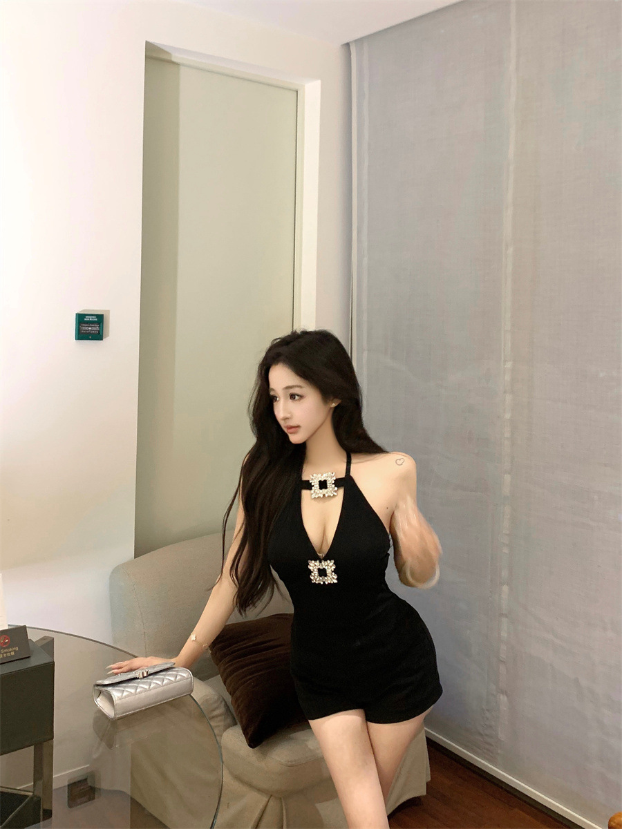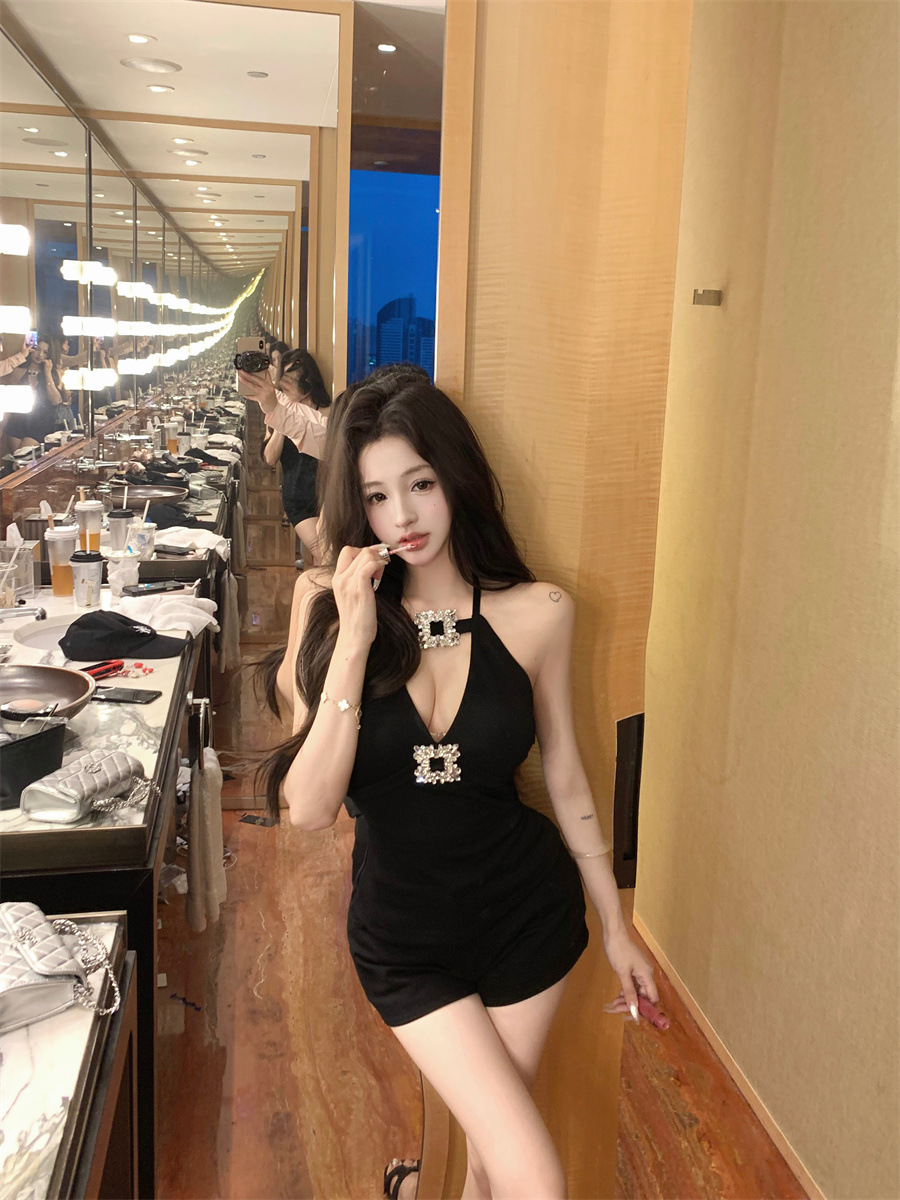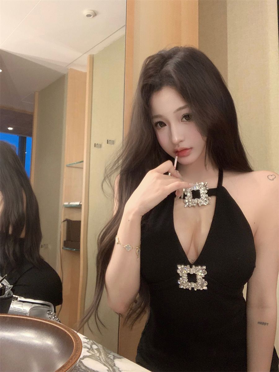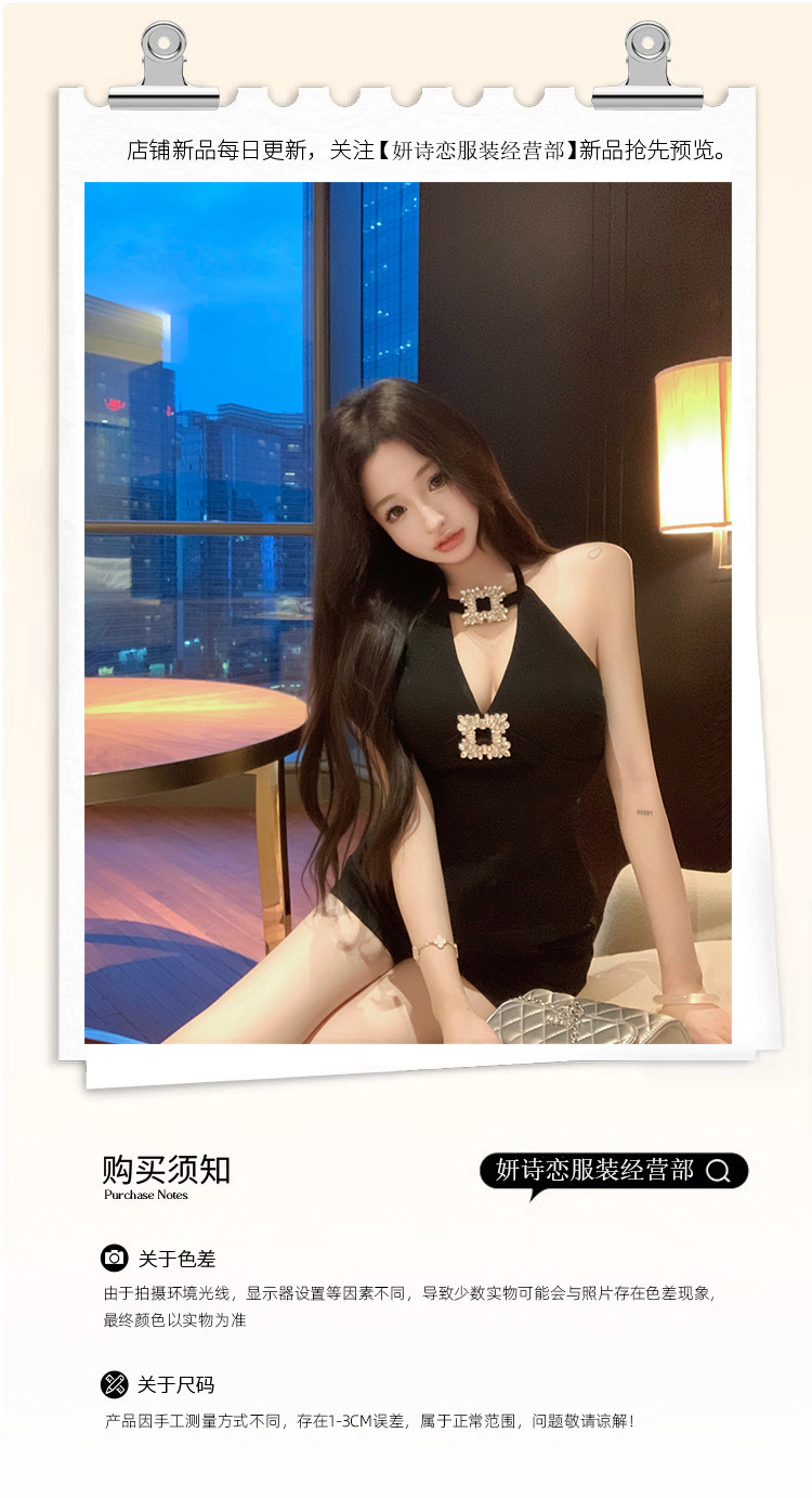 带胸垫镶钻露背挂脖吊带背心女夏季修身内搭纯欲辣妹黑色上衣外穿스토어 가기
