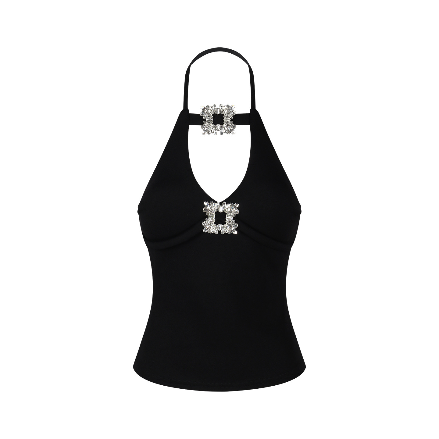 带胸垫镶钻露背挂脖吊带背心女夏季修身内搭纯欲辣妹黑色上衣外穿