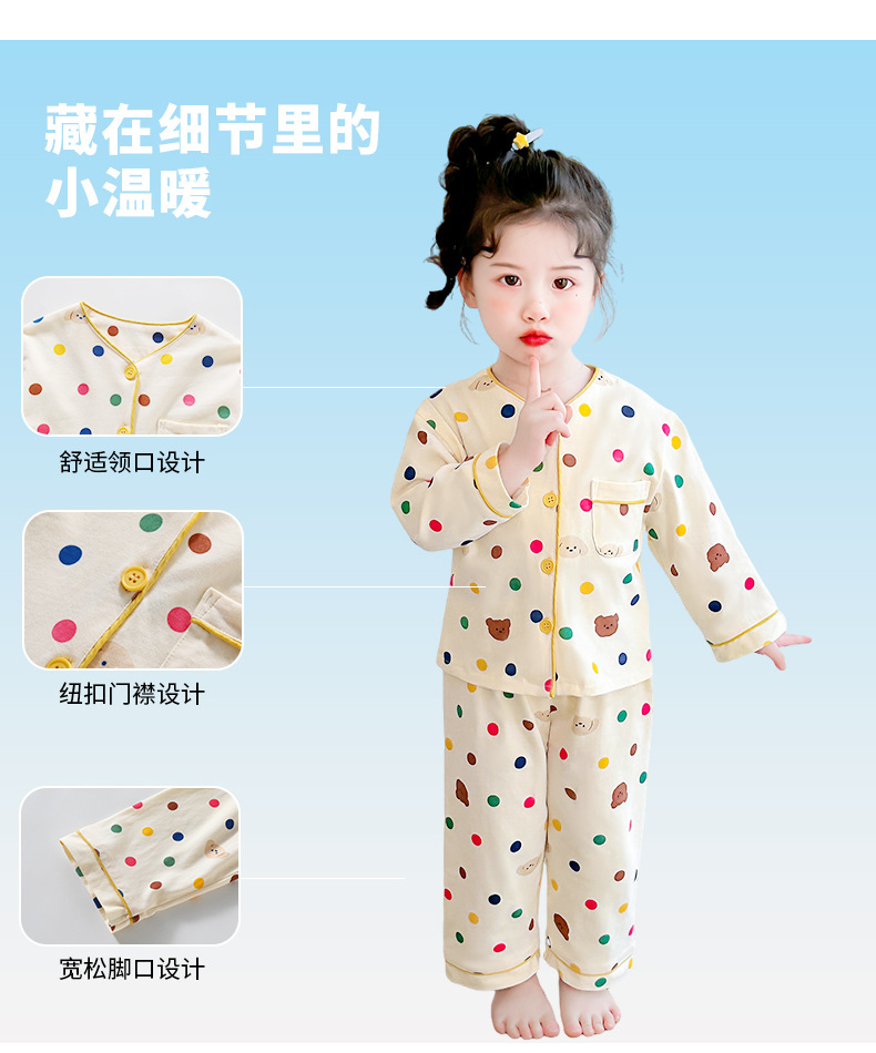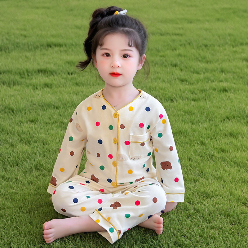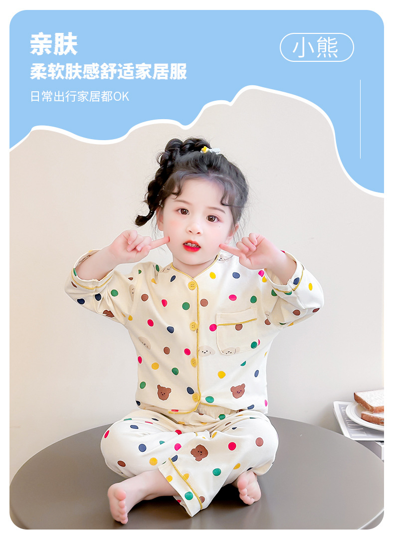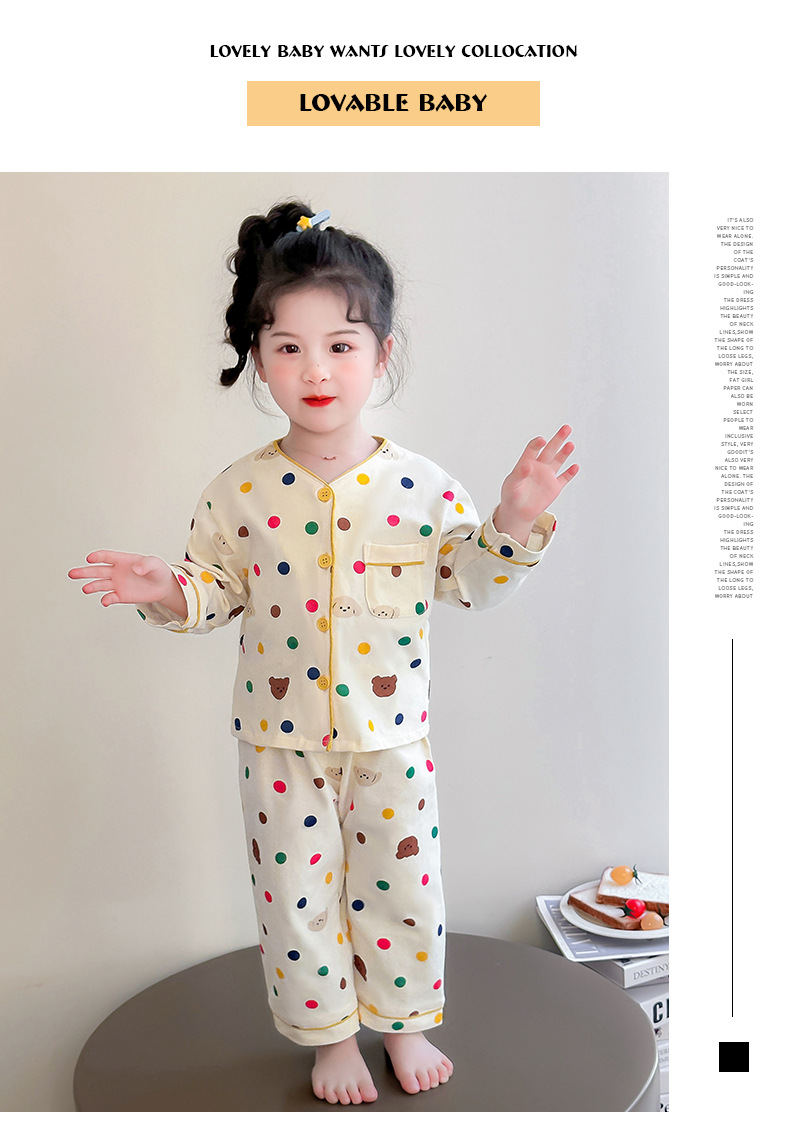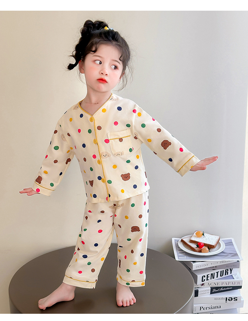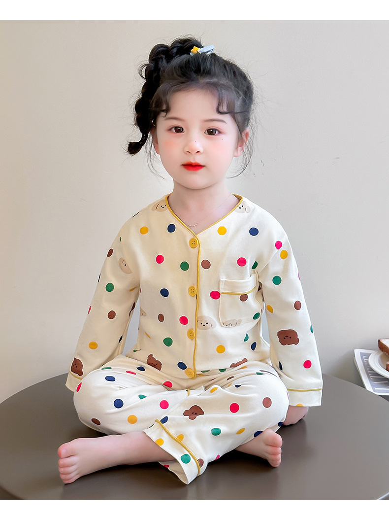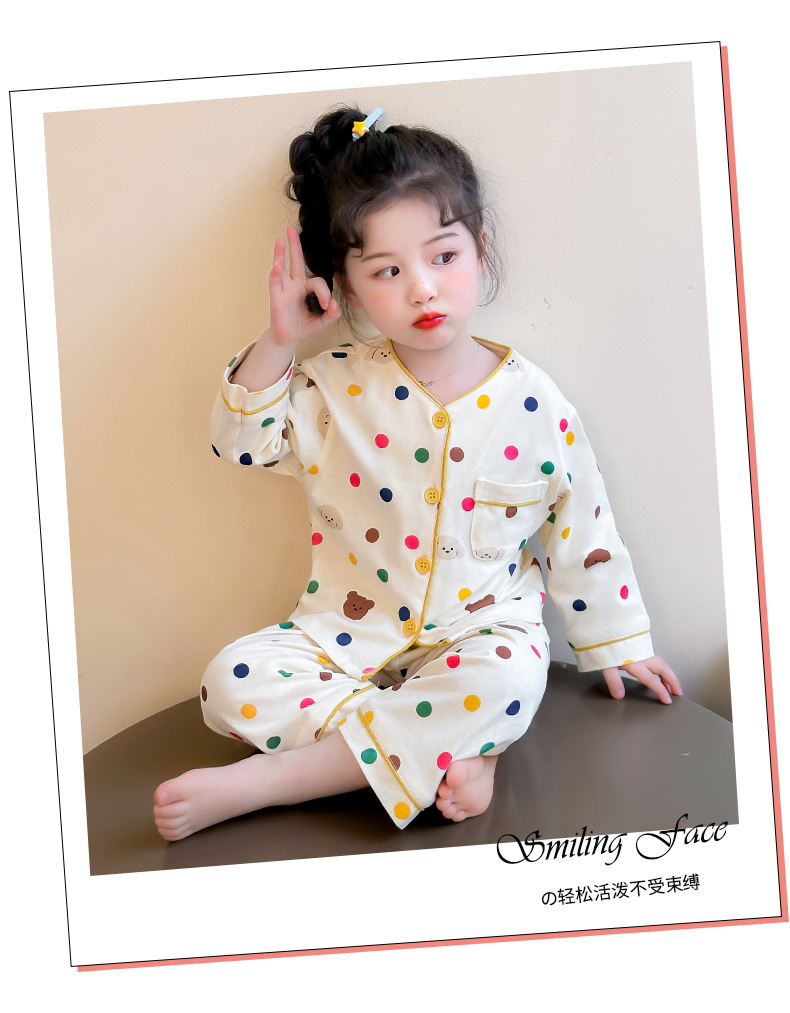 여자 가을 잠옷 2025 새로운 스타일 어린 소녀 세련되고 귀여운 폴카 도트 가정 의류 어린이 봄, 가을 홈 슈트스토어 가기