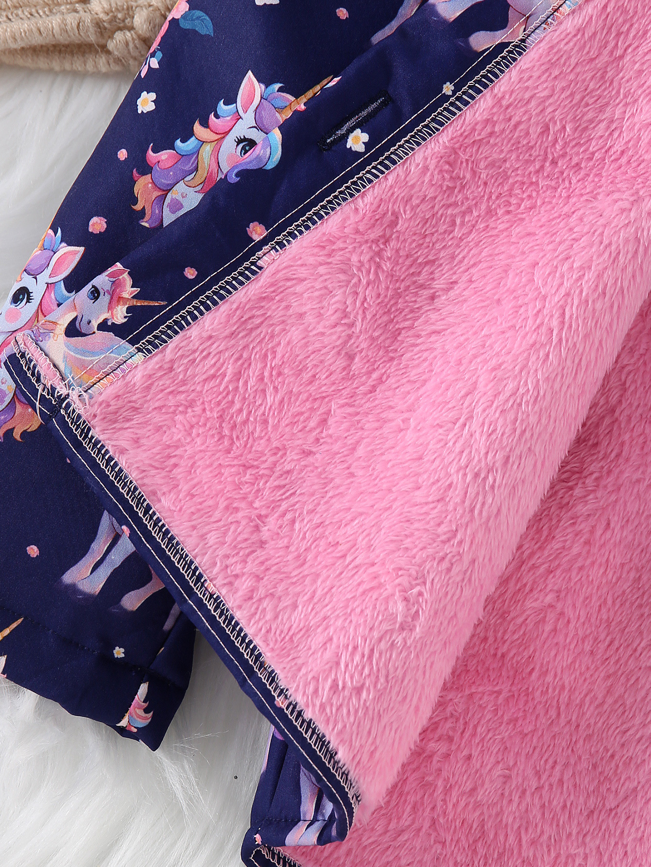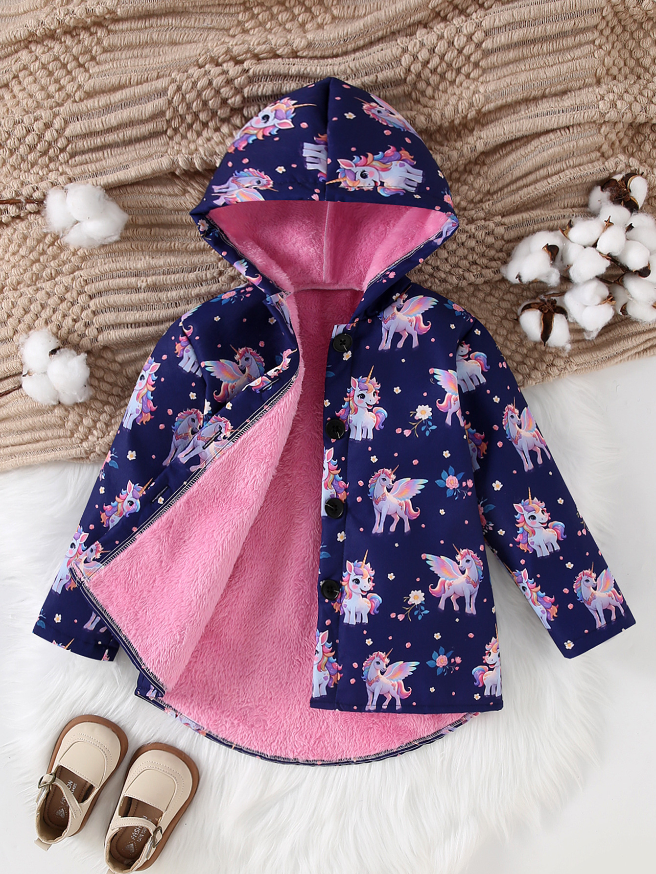 가을, 겨울 소녀의 귀여운 무지개 유니콘 전체 인쇄 벨벳 따뜻한 긴팔 싱글 브레스트 후드 재킷