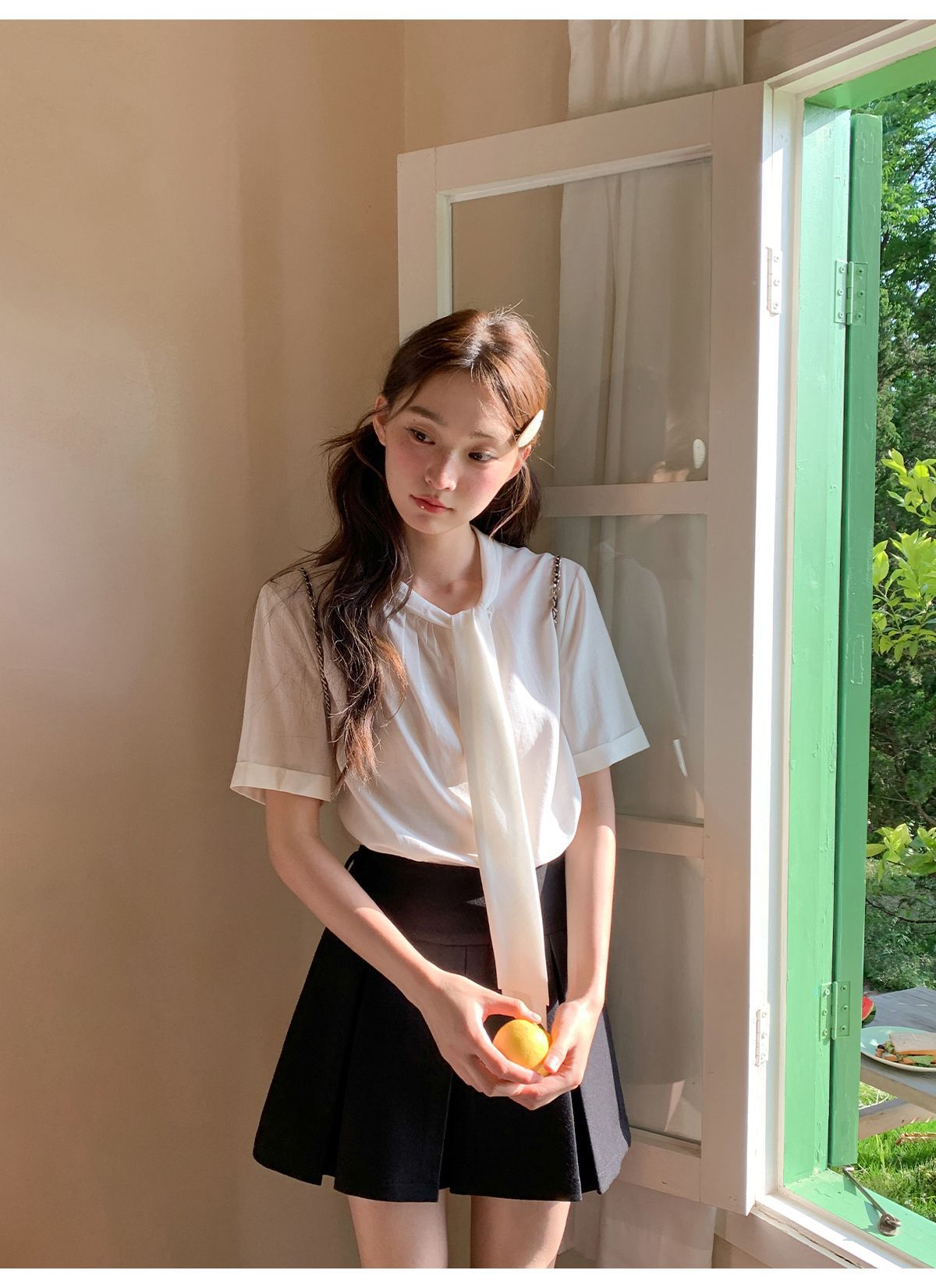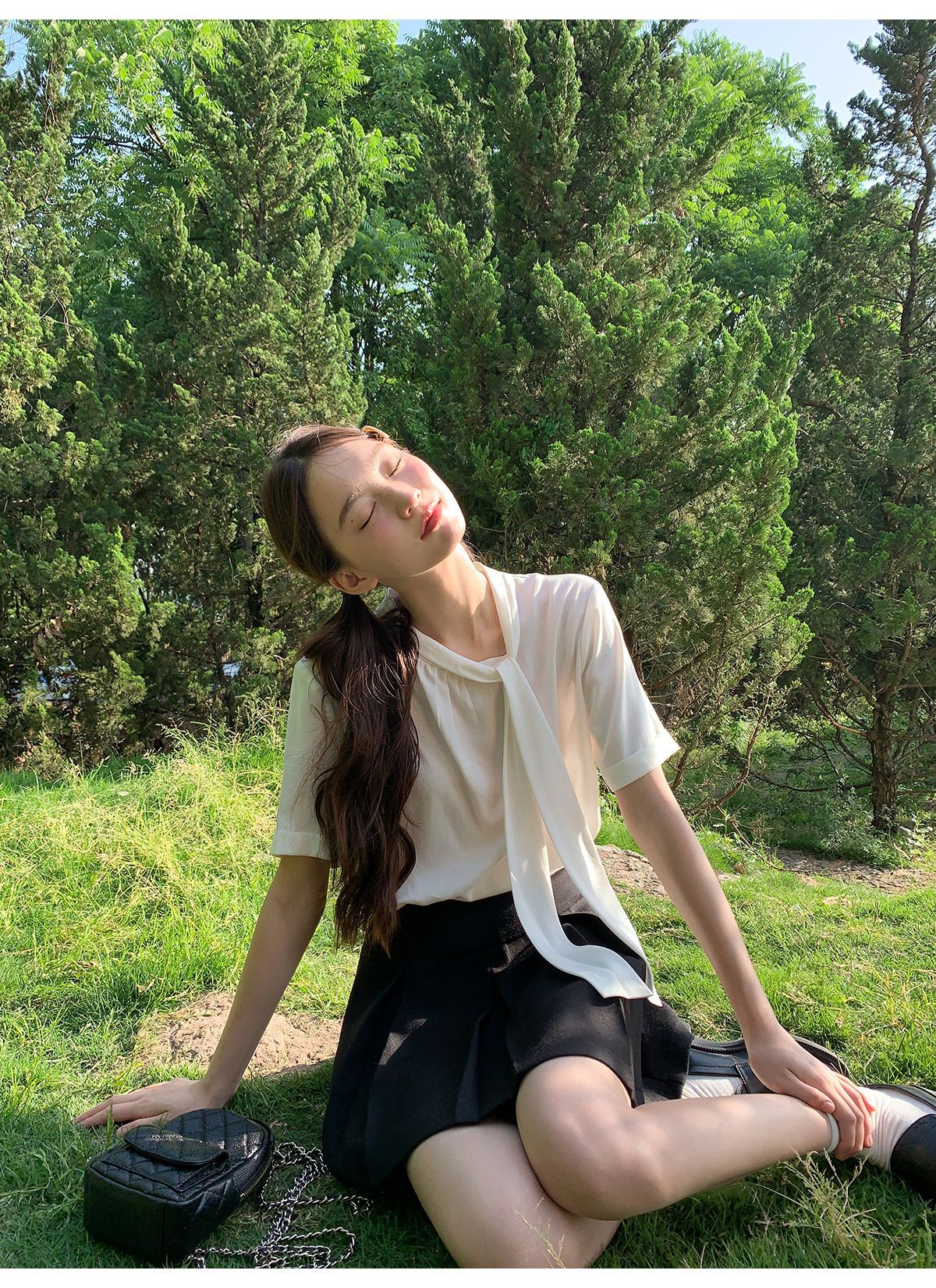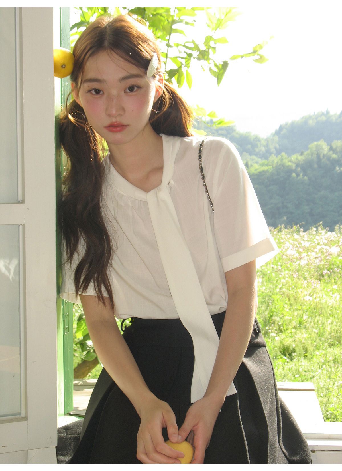 흰색 넥타이 반팔 셔츠 여성 여름 여성 셔츠 간단한 통근 리본 탑