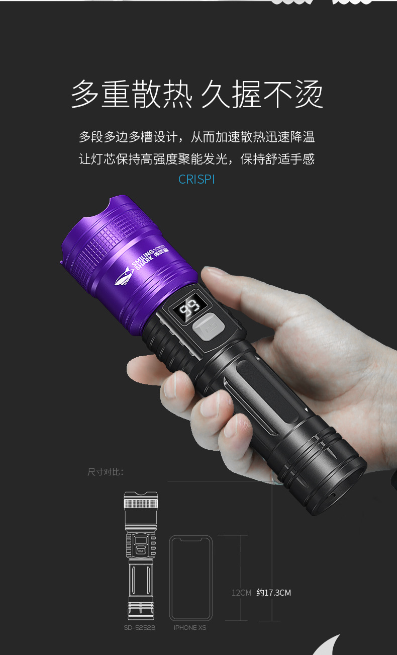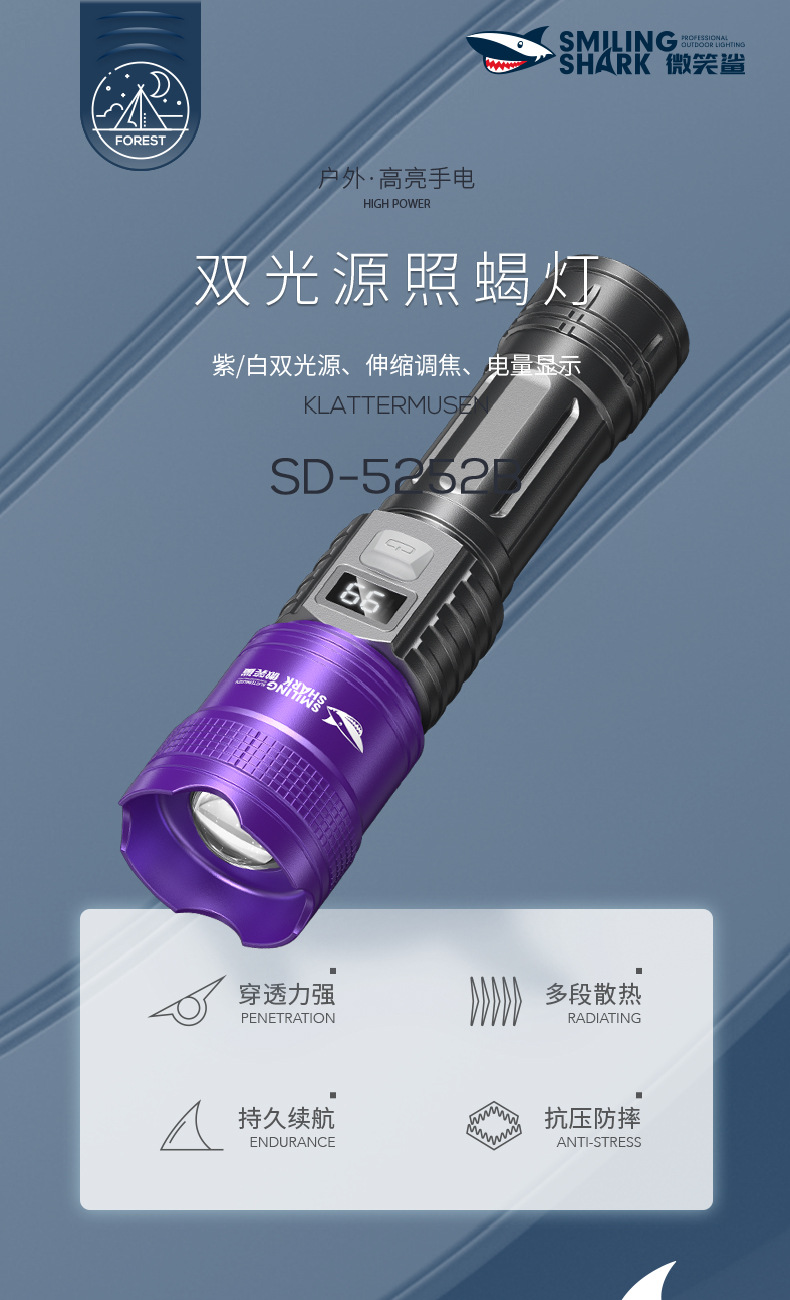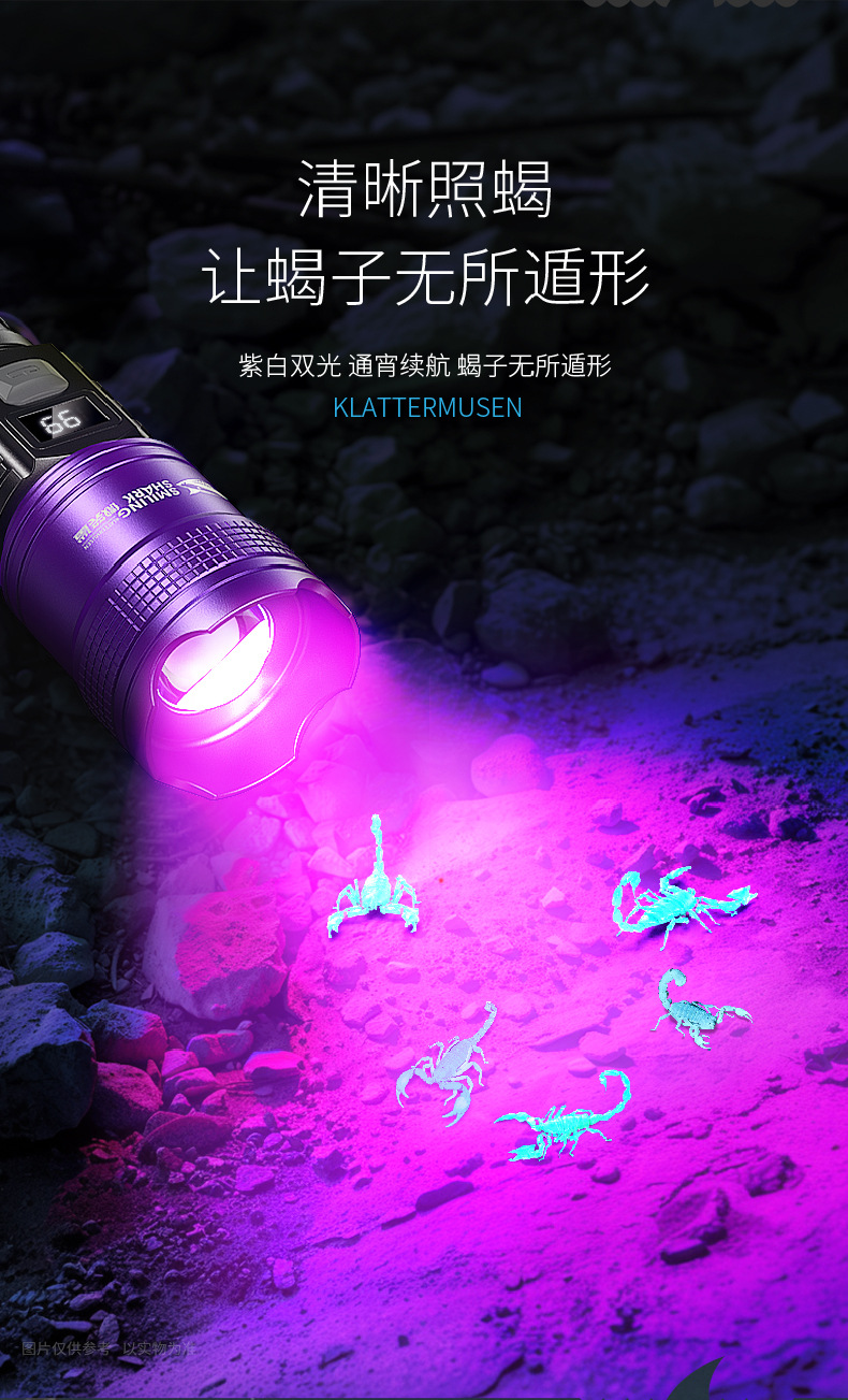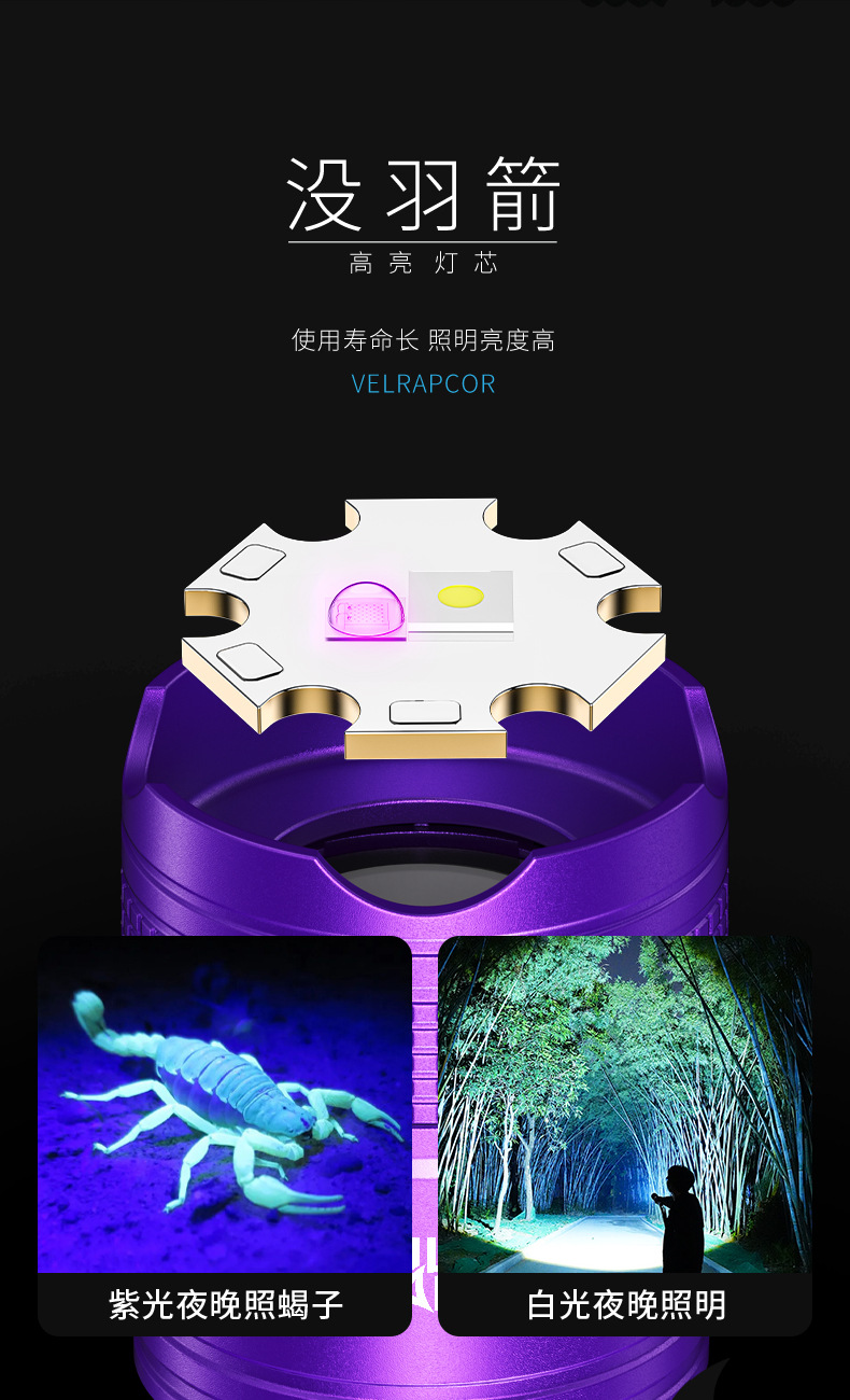 새로운 야외 스콜피온 특수 손전등 보라색 빛 이중 광원 충전식 디지털 전기 디스플레이 강한 빛 손전등