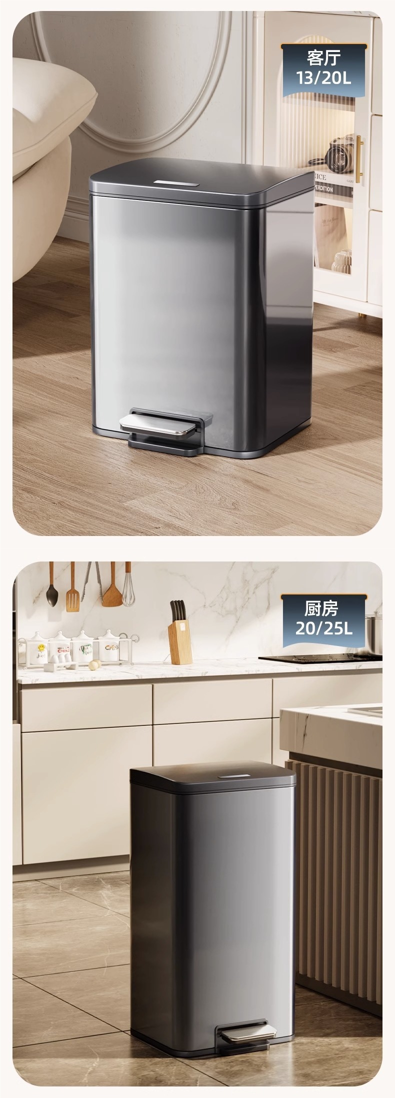 • 스퀘어-문라이트 실버 13L [이너통/저소음감속] 거실 및 주방 [스테인리스 커버]