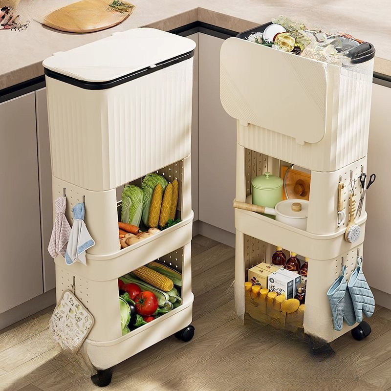 주방 쓰레기통 가정용 대용량 이동식 이중층 수납 뚜껑이 있는 일본식 다층 수납 선반스토어 가기