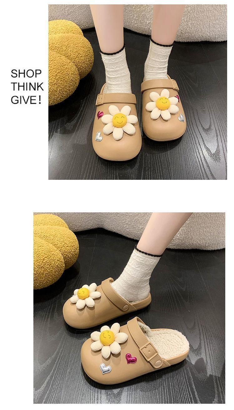 여성용 홈 실내 벨벳 따뜻한 면 슬리퍼 2025 가을 겨울 새로운 스타일을위한 세련된 해바라기 다목적 바오 터우 하프 슬리퍼스토어 가기