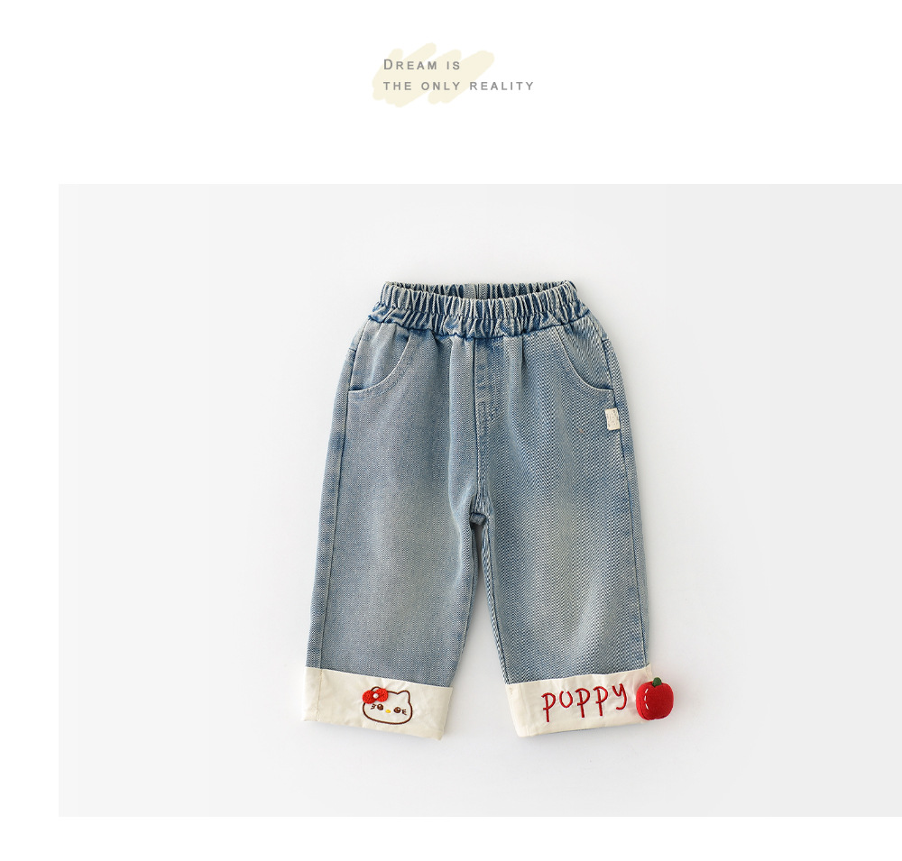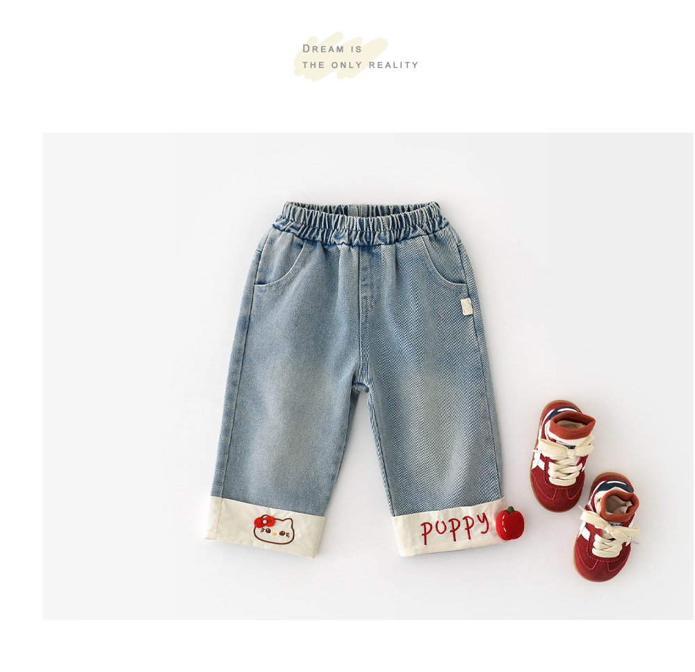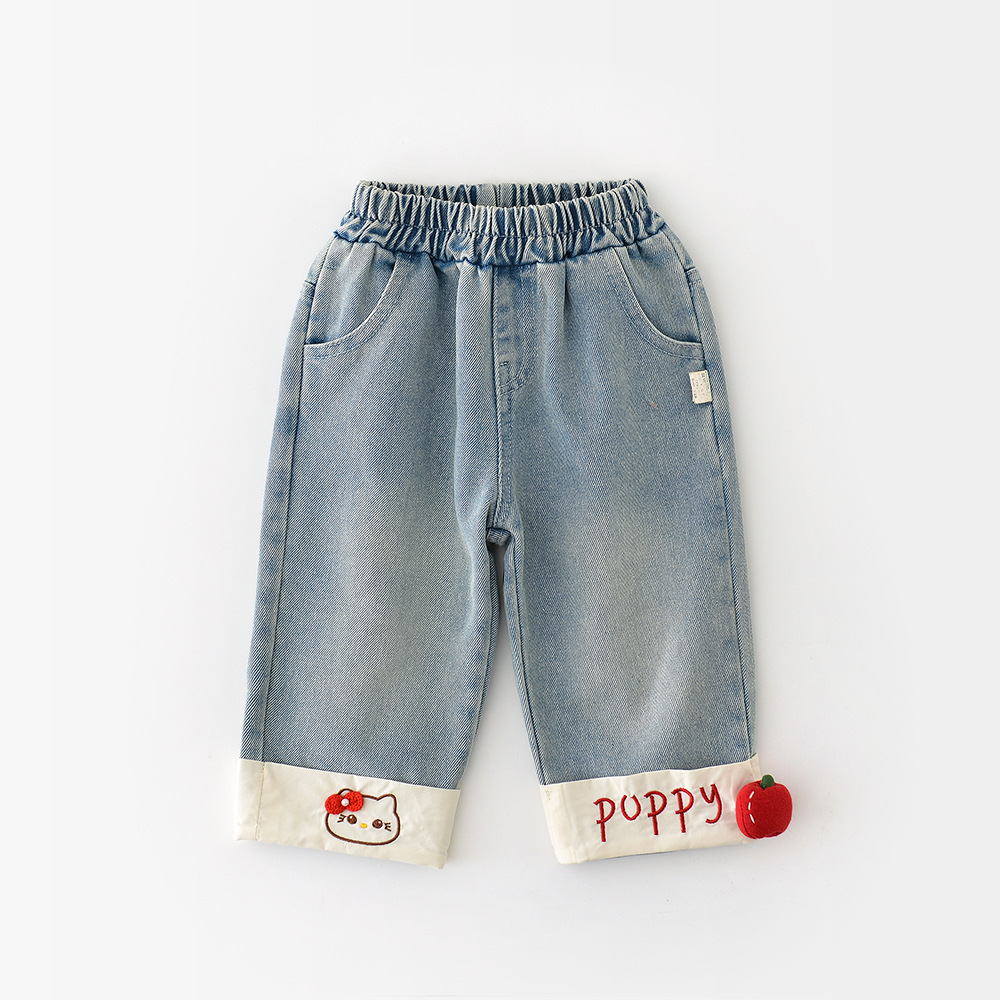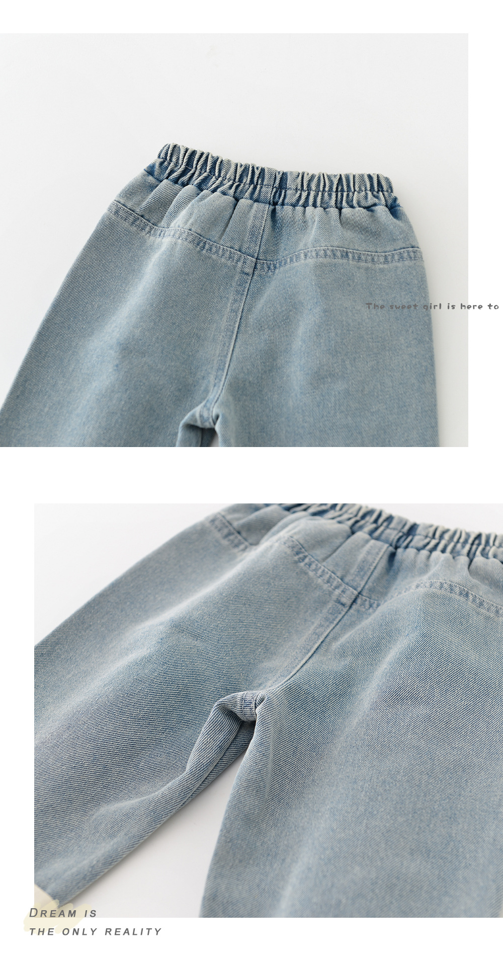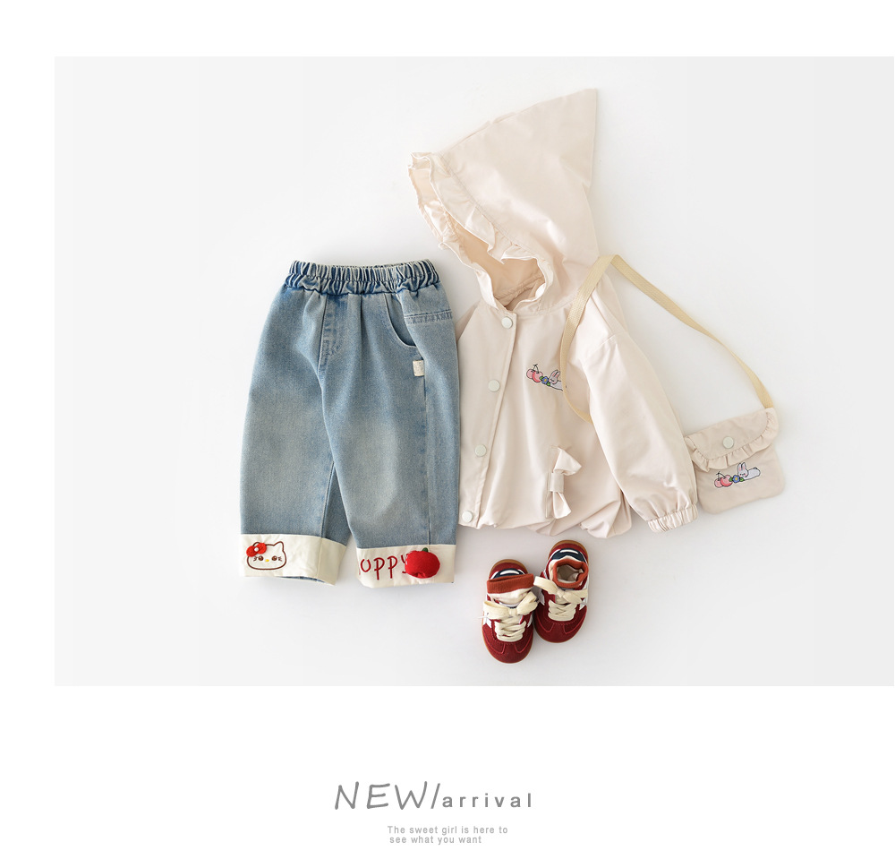2025 새로운 가을 한국 스타일 소녀 만화 고양이 데님 바지 유아 및 어린이 중간 허리 스플 라이스 바지 53521