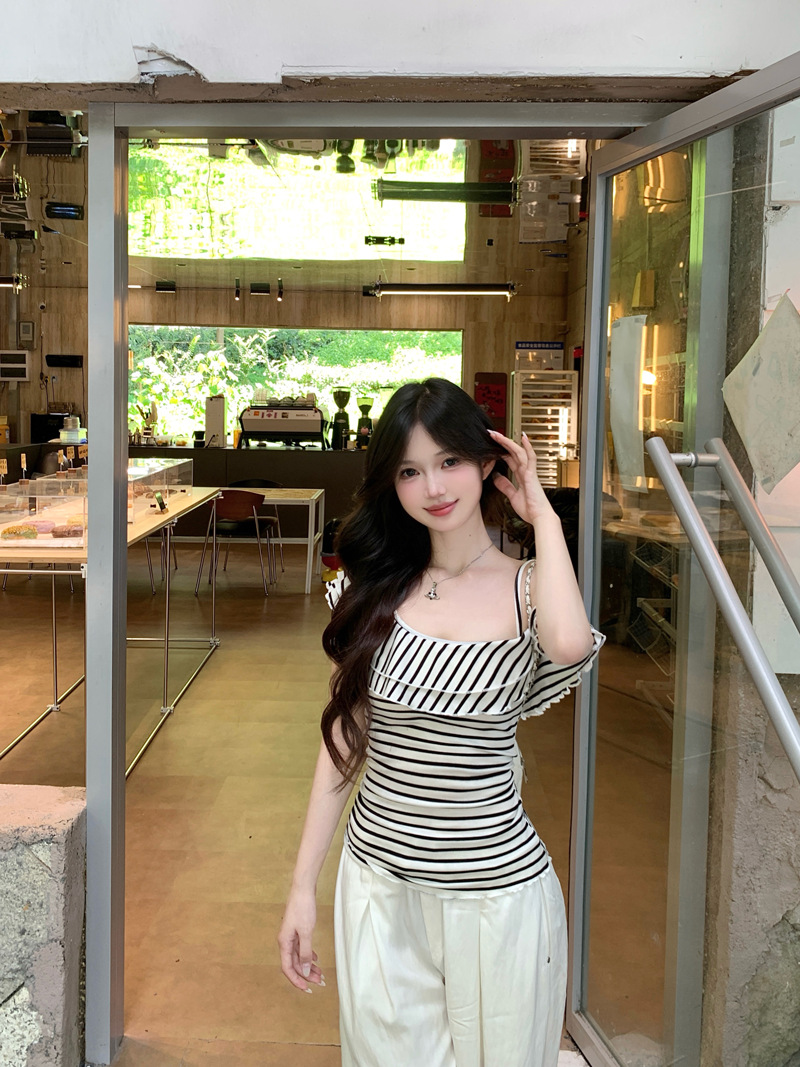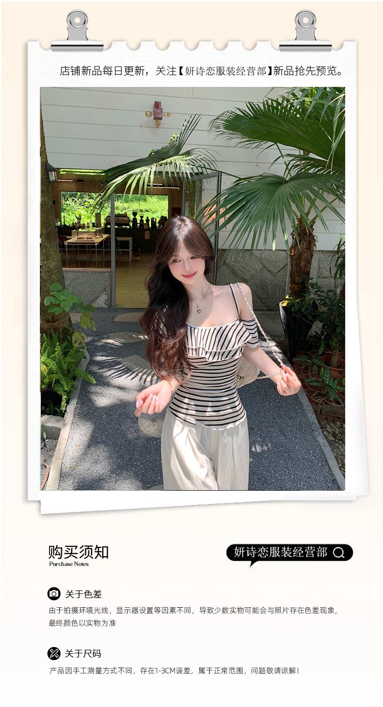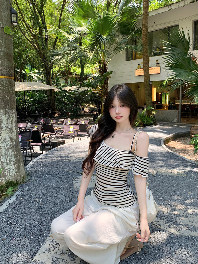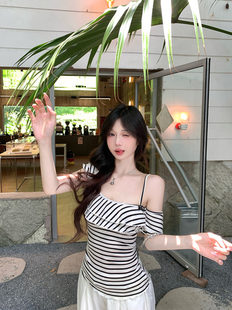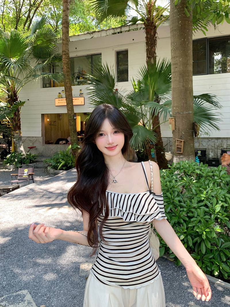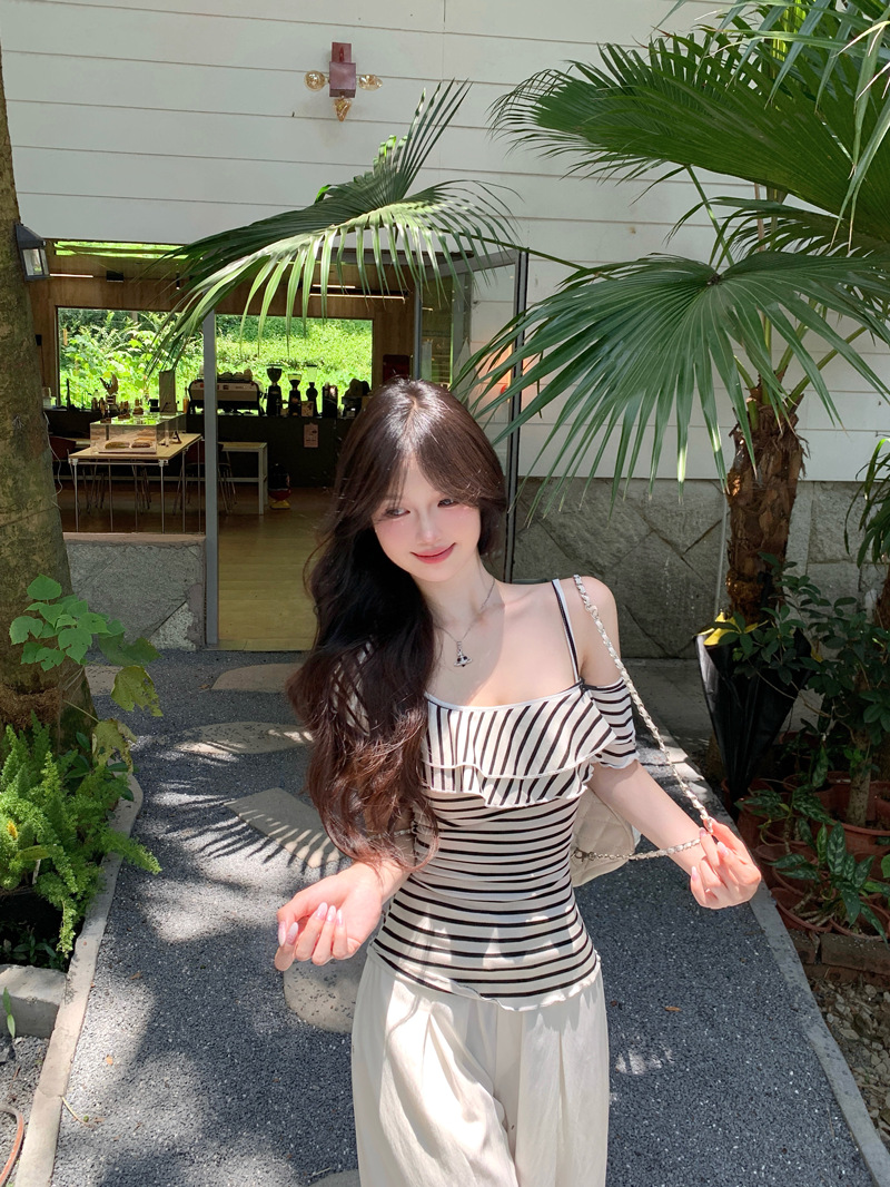 대비색 스트라이프 오프숄더 반팔 티셔츠 여성 여름 러플 슬림 웨이스트 퓨어 디자인 슬리밍 탑스토어 가기