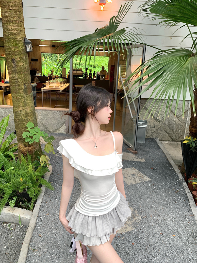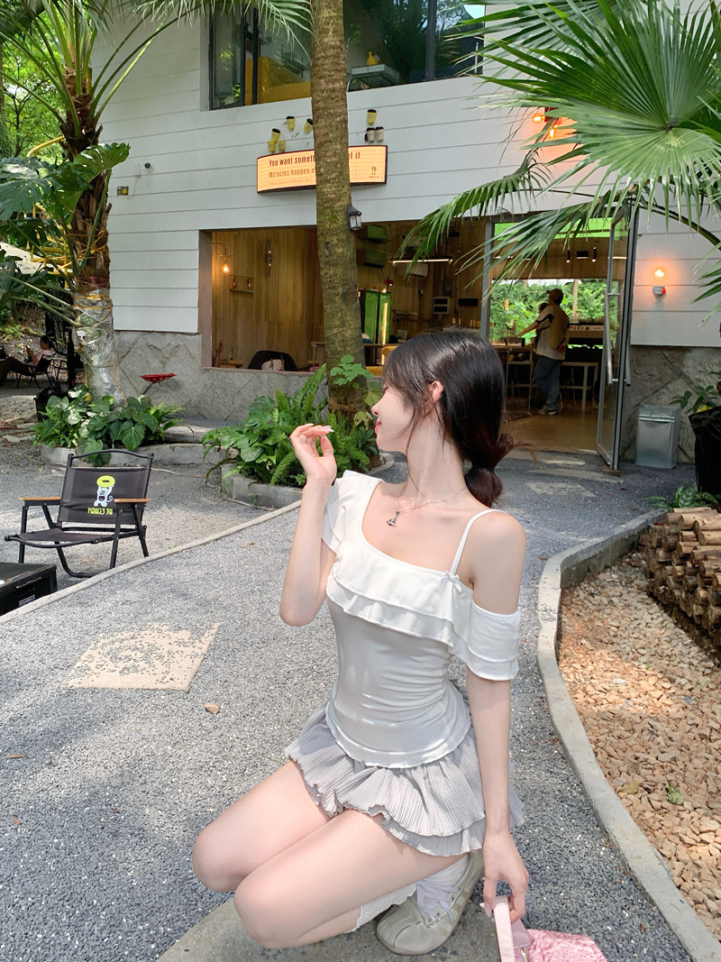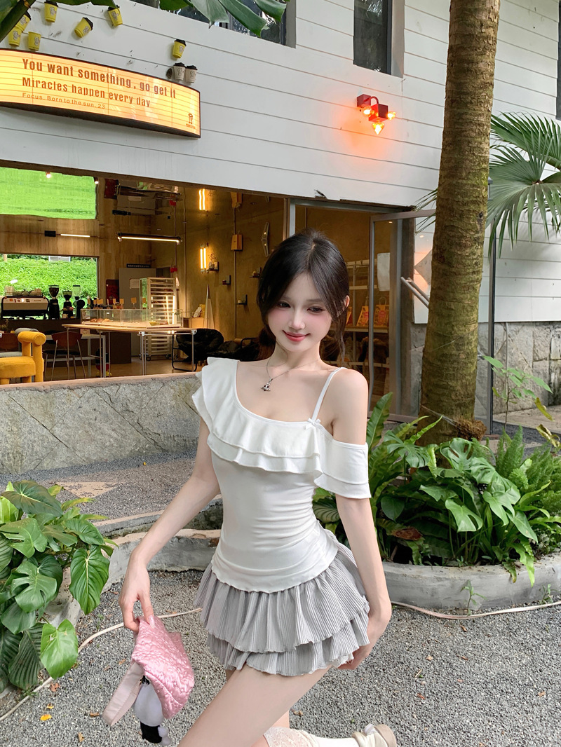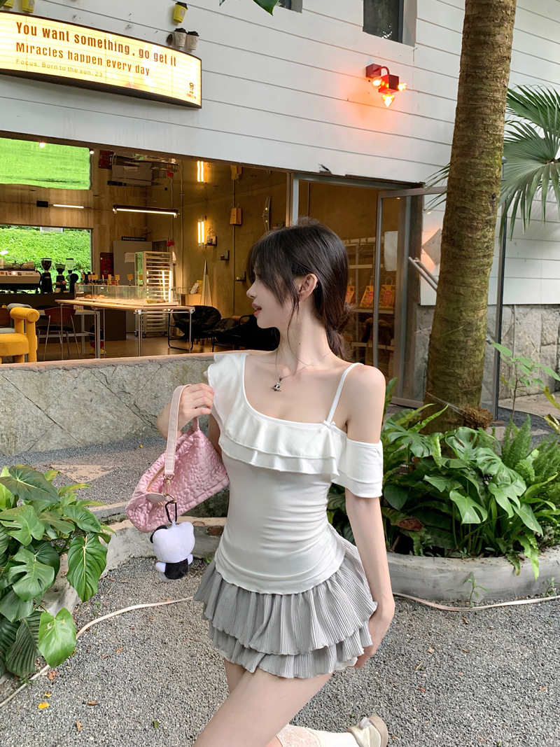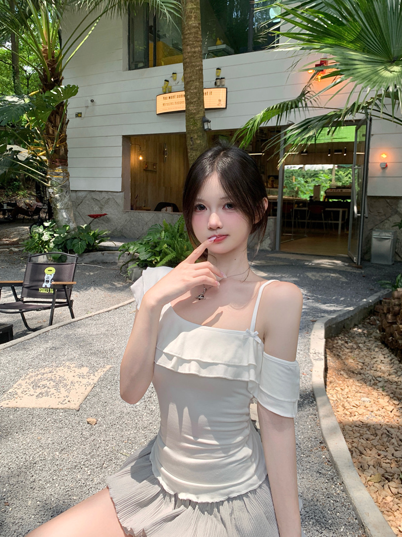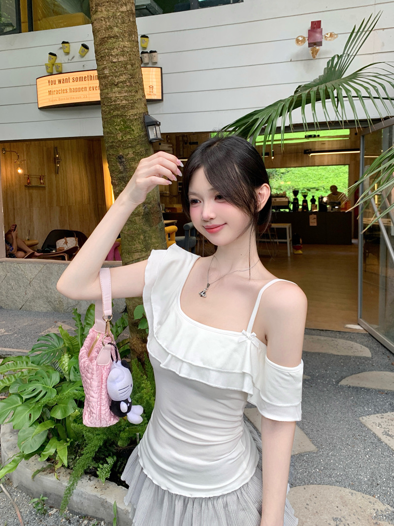 대비색 스트라이프 오프숄더 반팔 티셔츠 여성 여름 러플 슬림 웨이스트 퓨어 디자인 슬리밍 탑스토어 가기