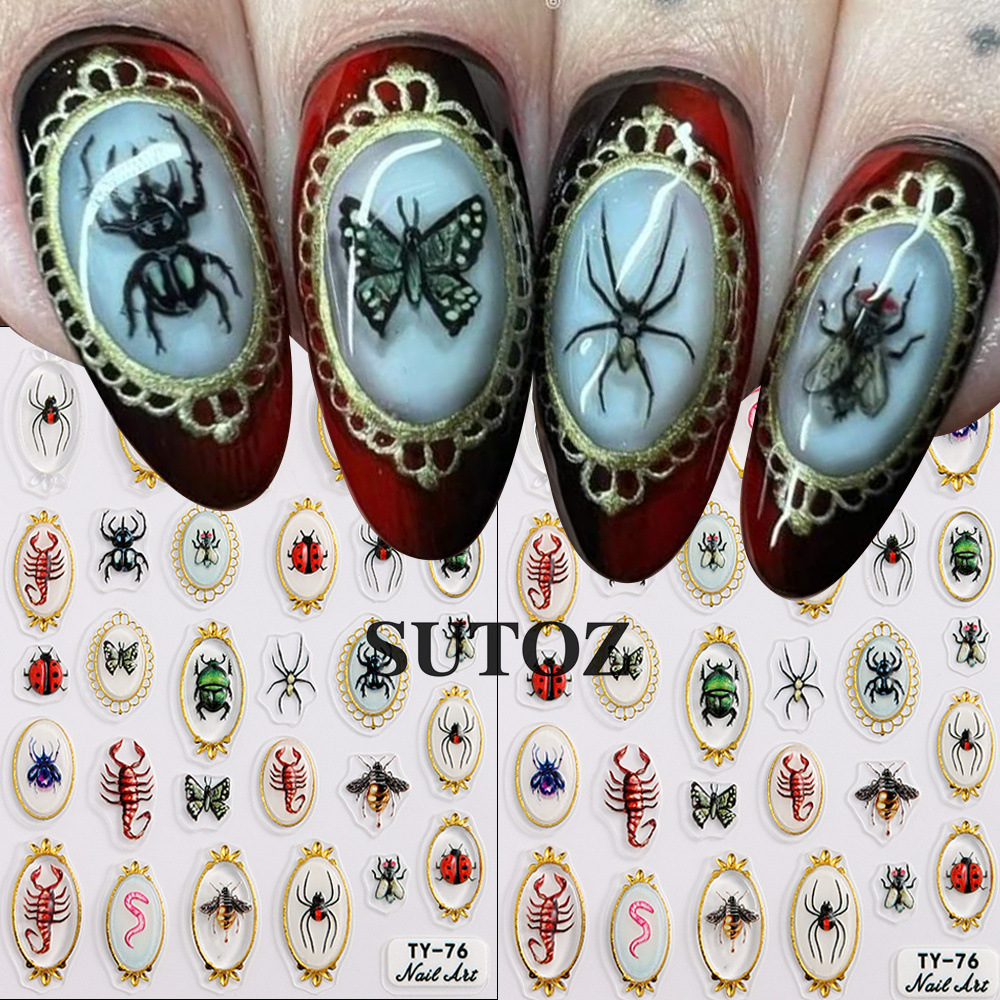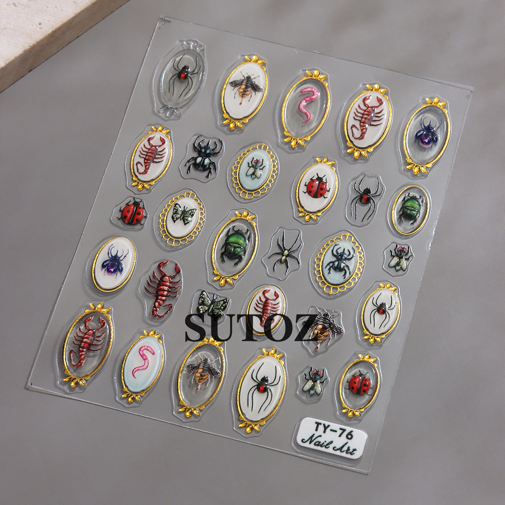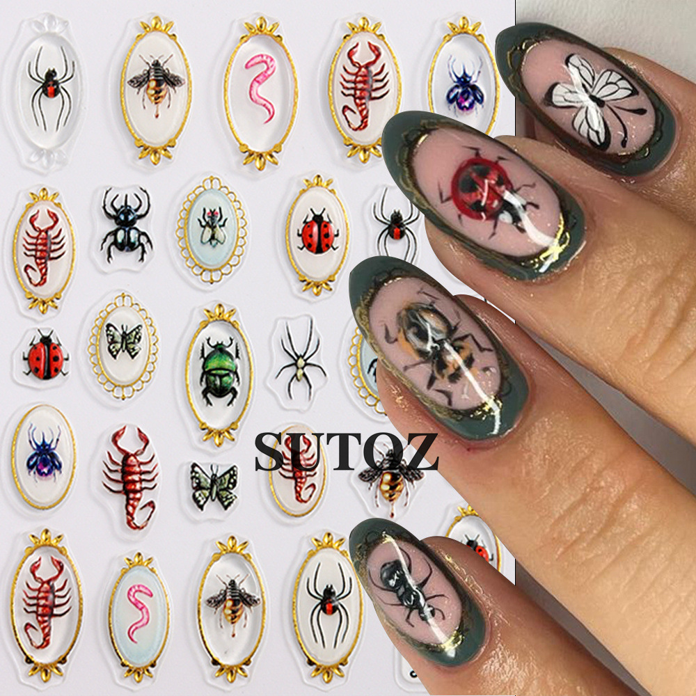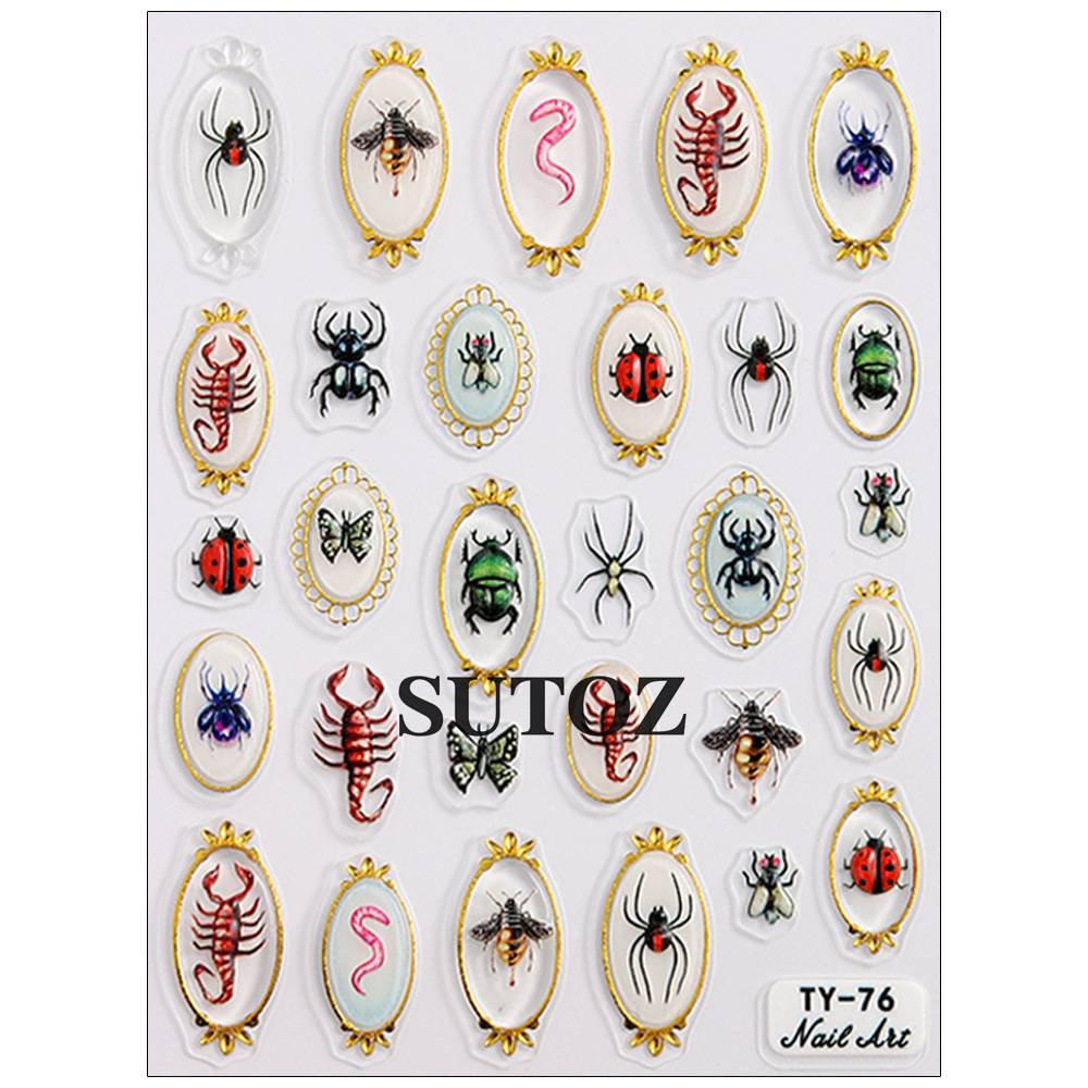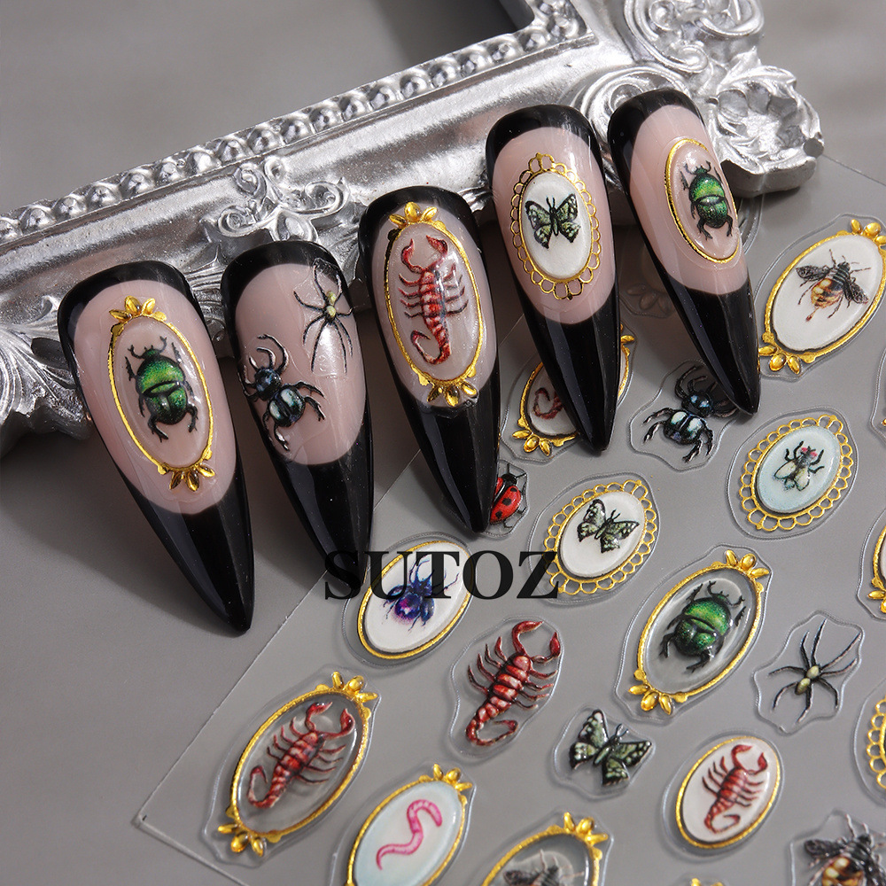 국경을 넘는 새로운 네일 아트 스티커 달콤하고 시원한 뜨거운 소녀 금테 곤충 시리즈 거미 무당벌레 랍스터 입체 접착 스티커스토어 가기