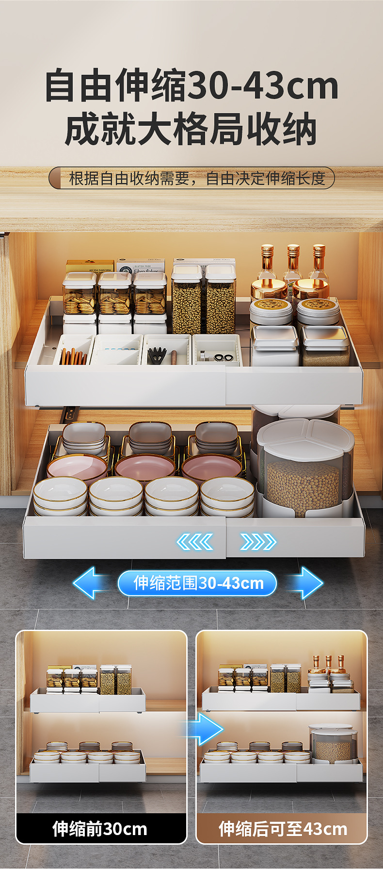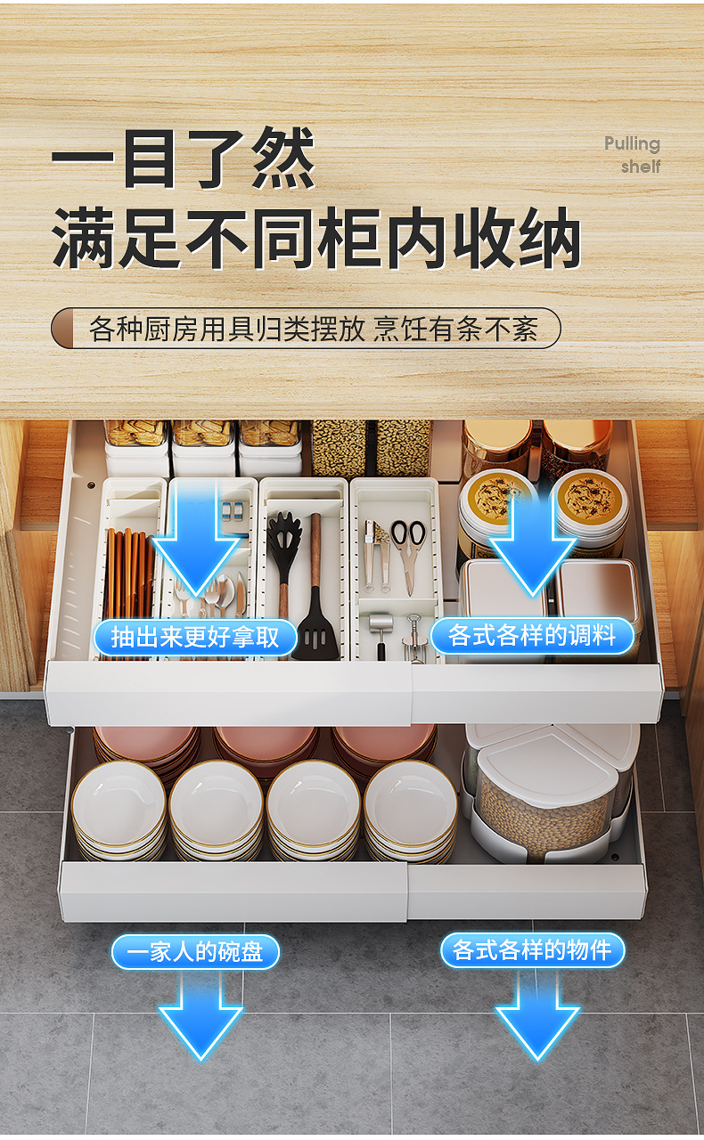 엄선된 캐비닛 서랍, 주방 수납 바구니, 계층형 조미료 접시, 싱크대 아래 수납함, 풀아웃 수납함