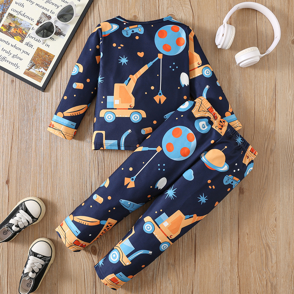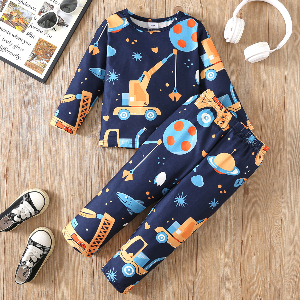 소년 홈웨어 잠옷 봄과 가을 따뜻한 양복 전체 인쇄 굴삭기 우주선 인쇄 긴팔 바지 세트스토어 가기
