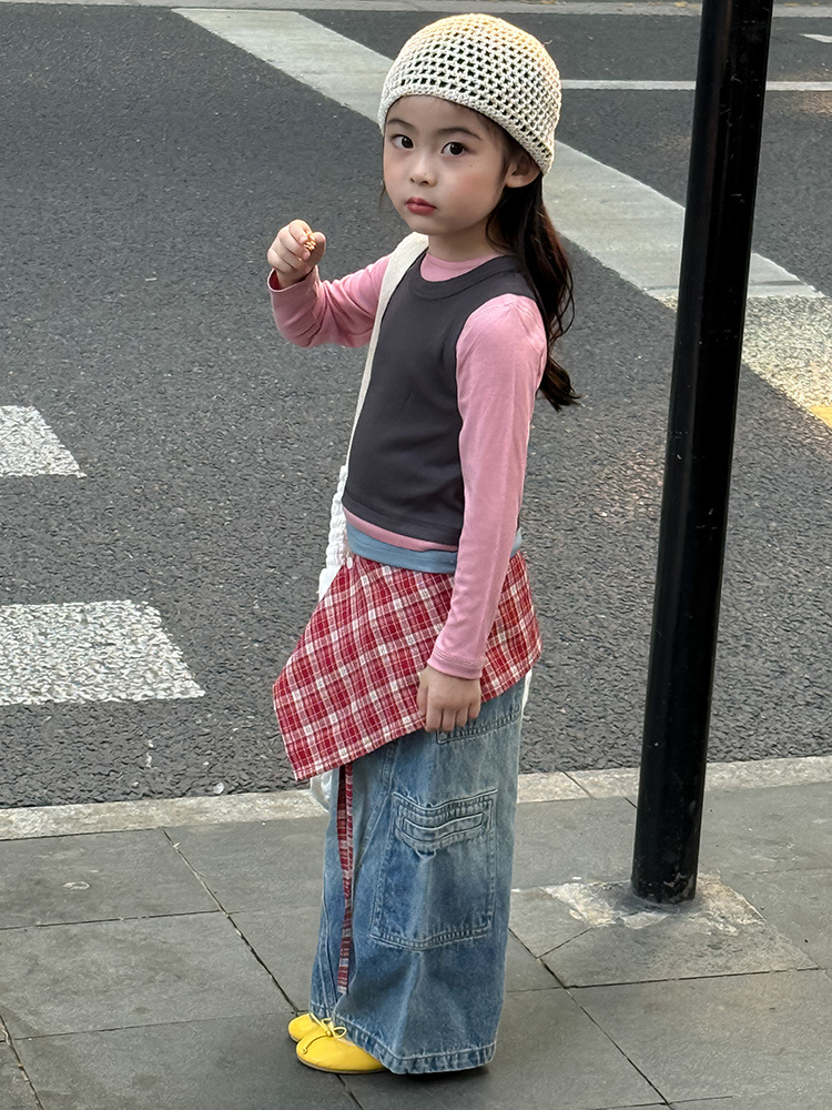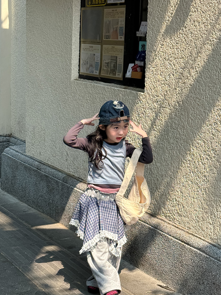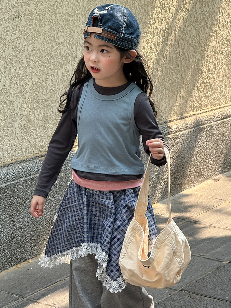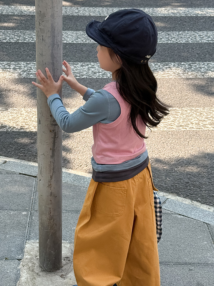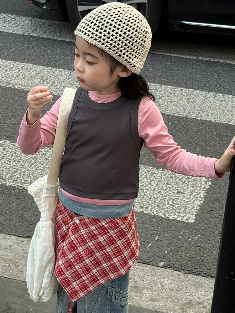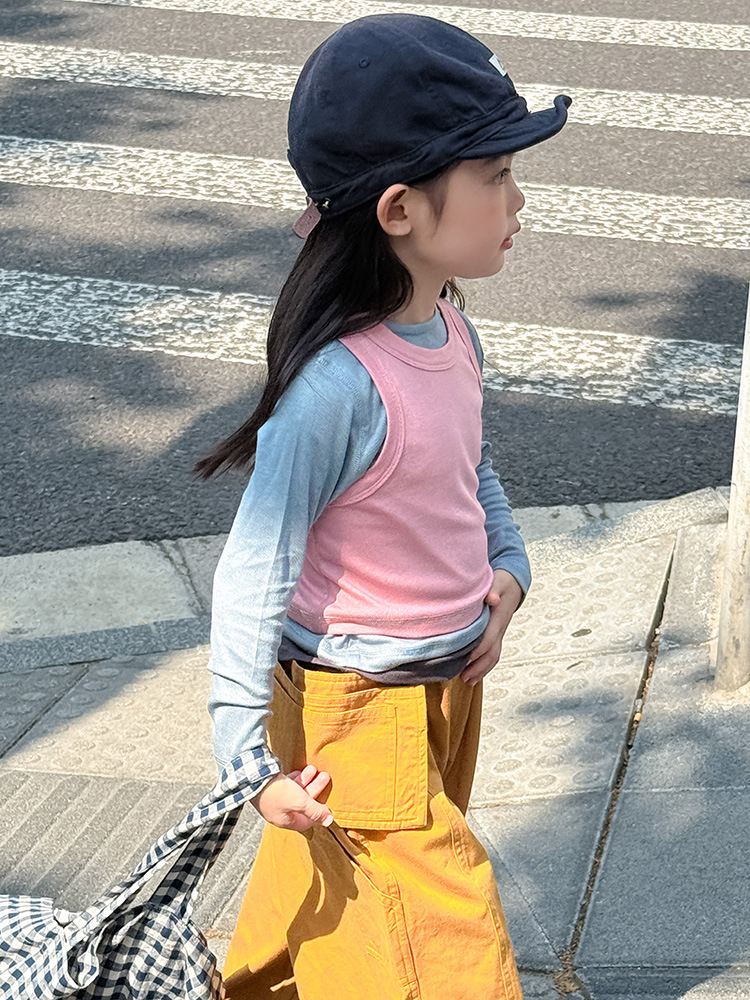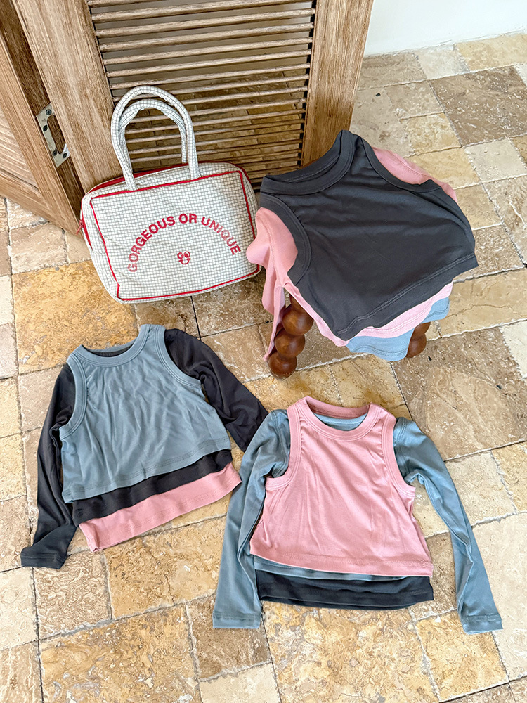 여아 가짜 3피스 대비색 바텀 셔츠 마스크 느낌 티셔츠 아동 레이어드 바텀 탑 가을 겨울 신작 한국어 버전스토어 가기