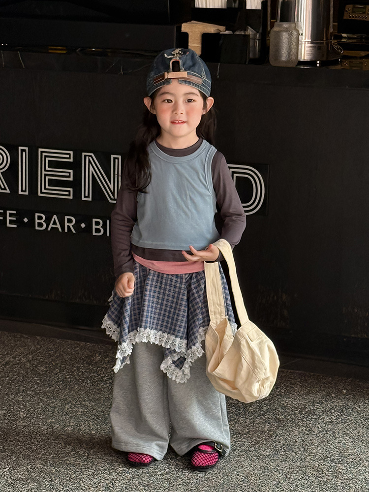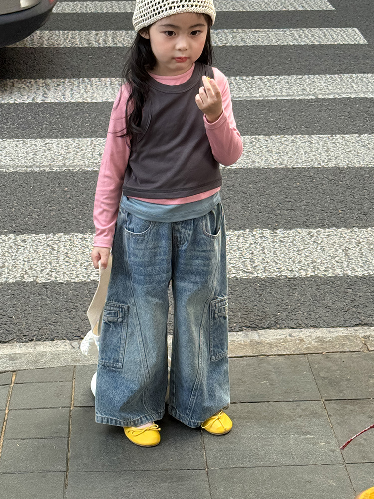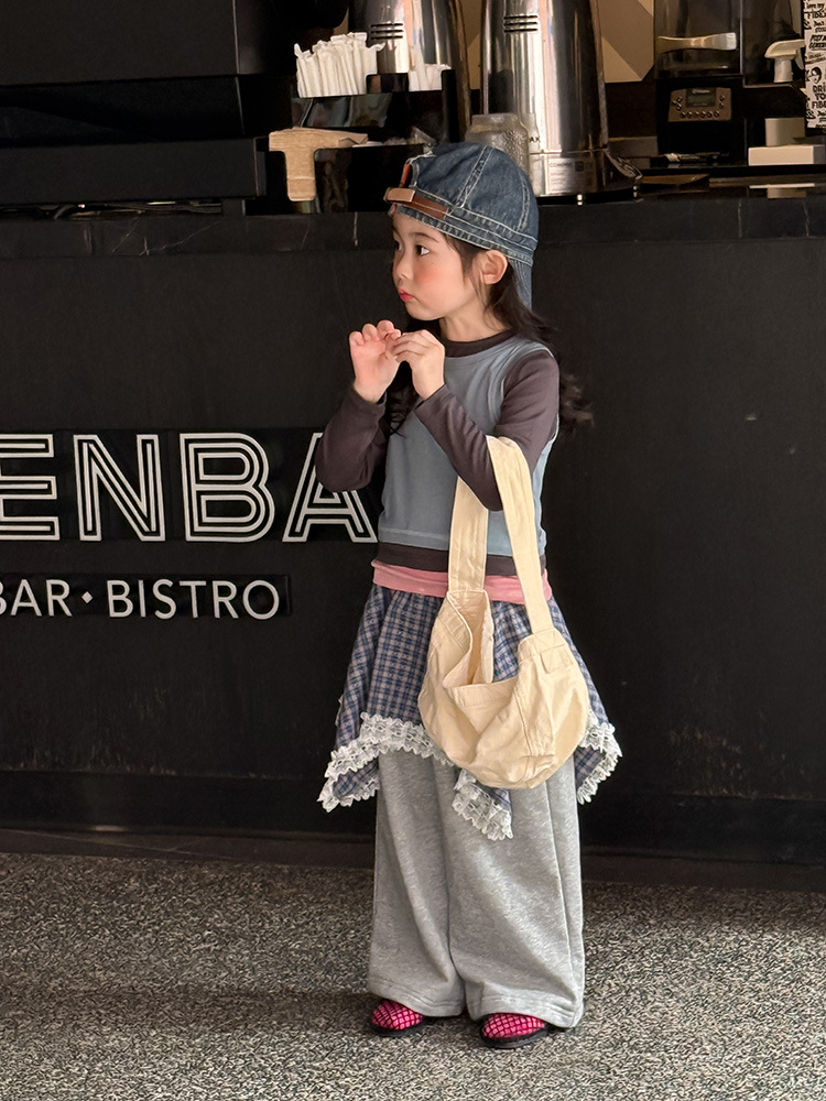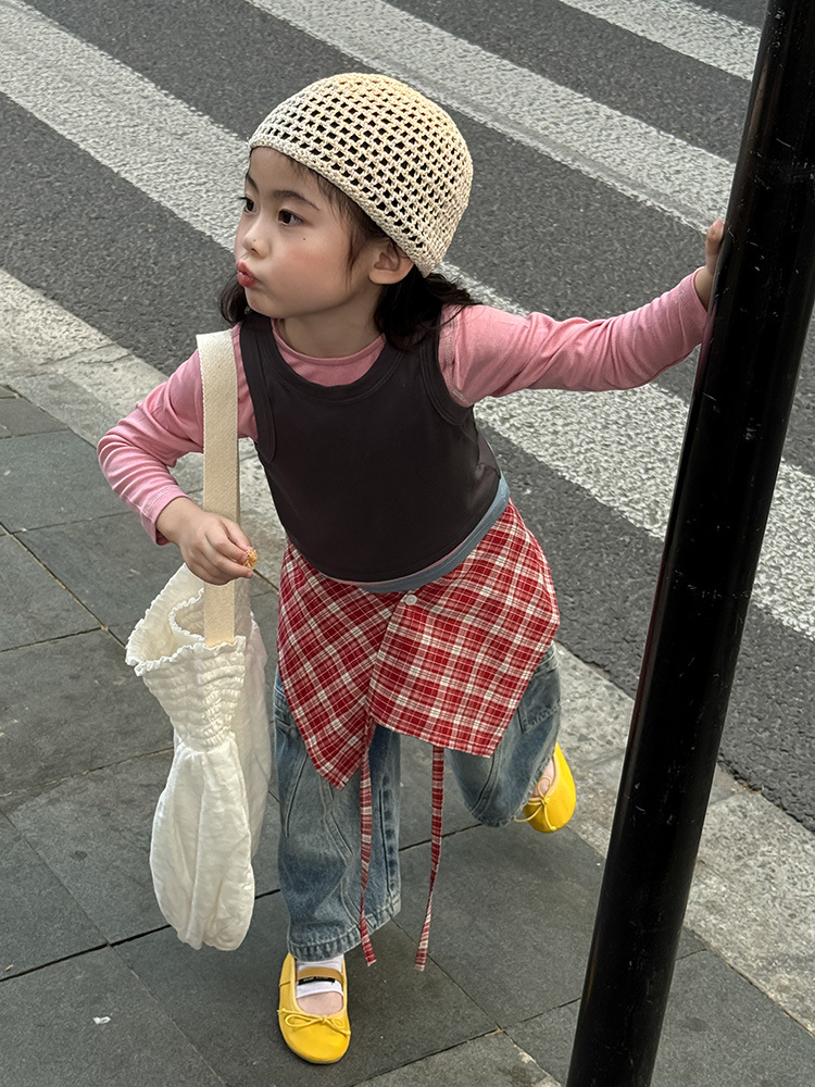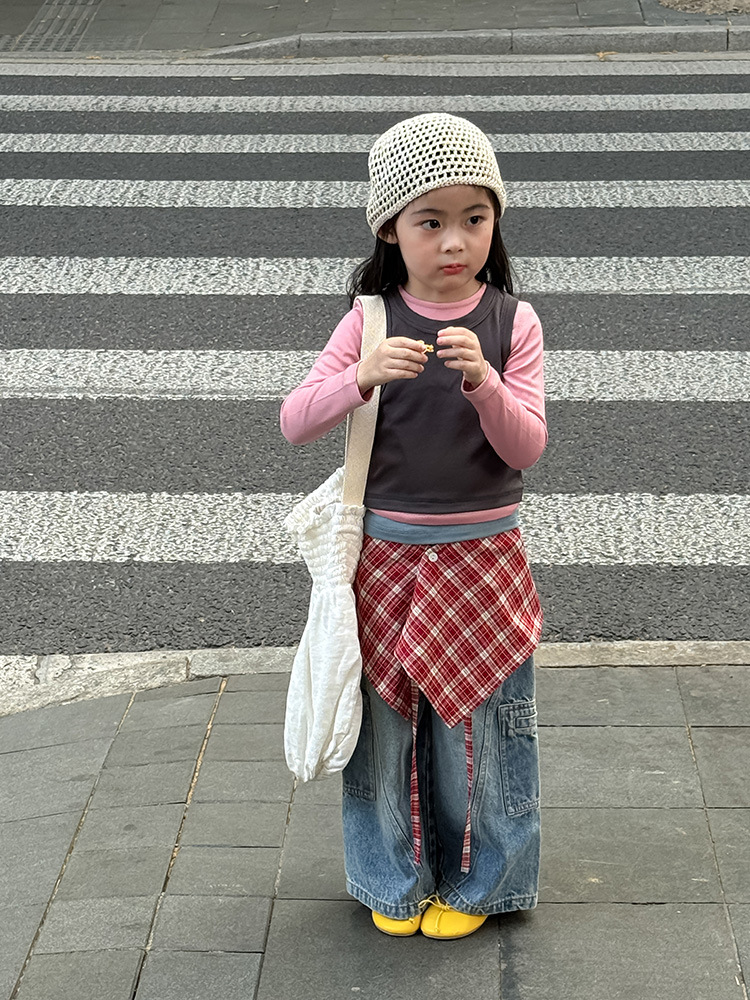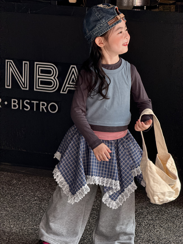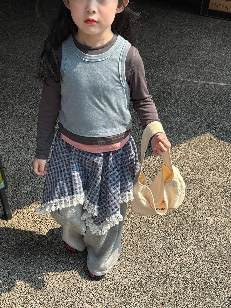 여아 가짜 3피스 대비색 바텀 셔츠 마스크 느낌 티셔츠 아동 레이어드 바텀 탑 가을 겨울 신작 한국어 버전스토어 가기
