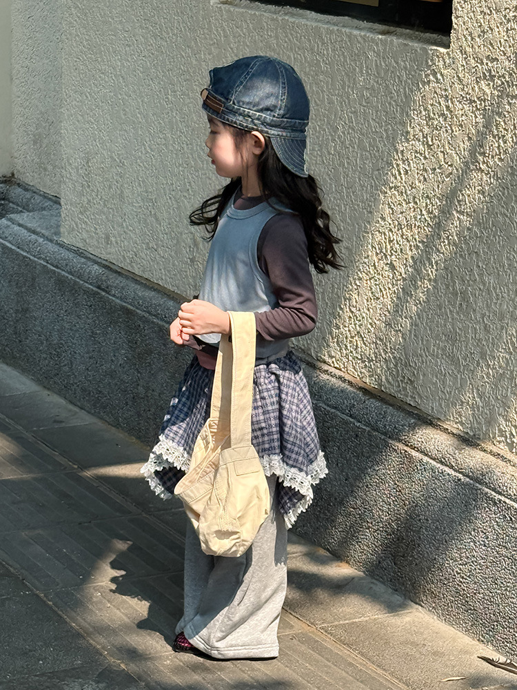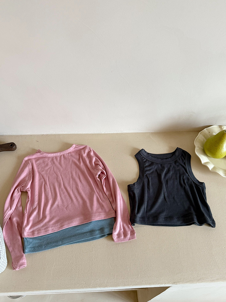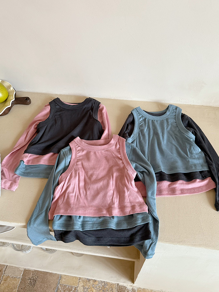 여아 가짜 3피스 대비색 바텀 셔츠 마스크 느낌 티셔츠 아동 레이어드 바텀 탑 가을 겨울 신작 한국어 버전