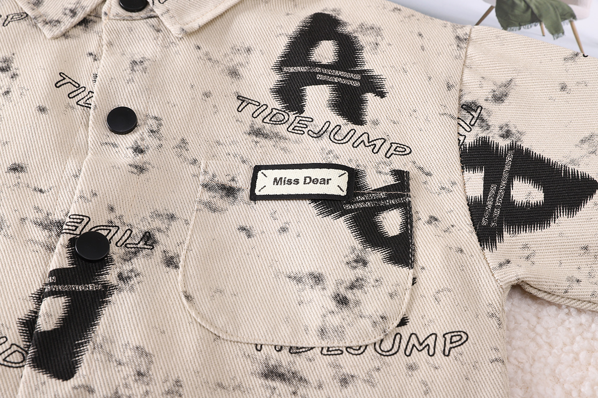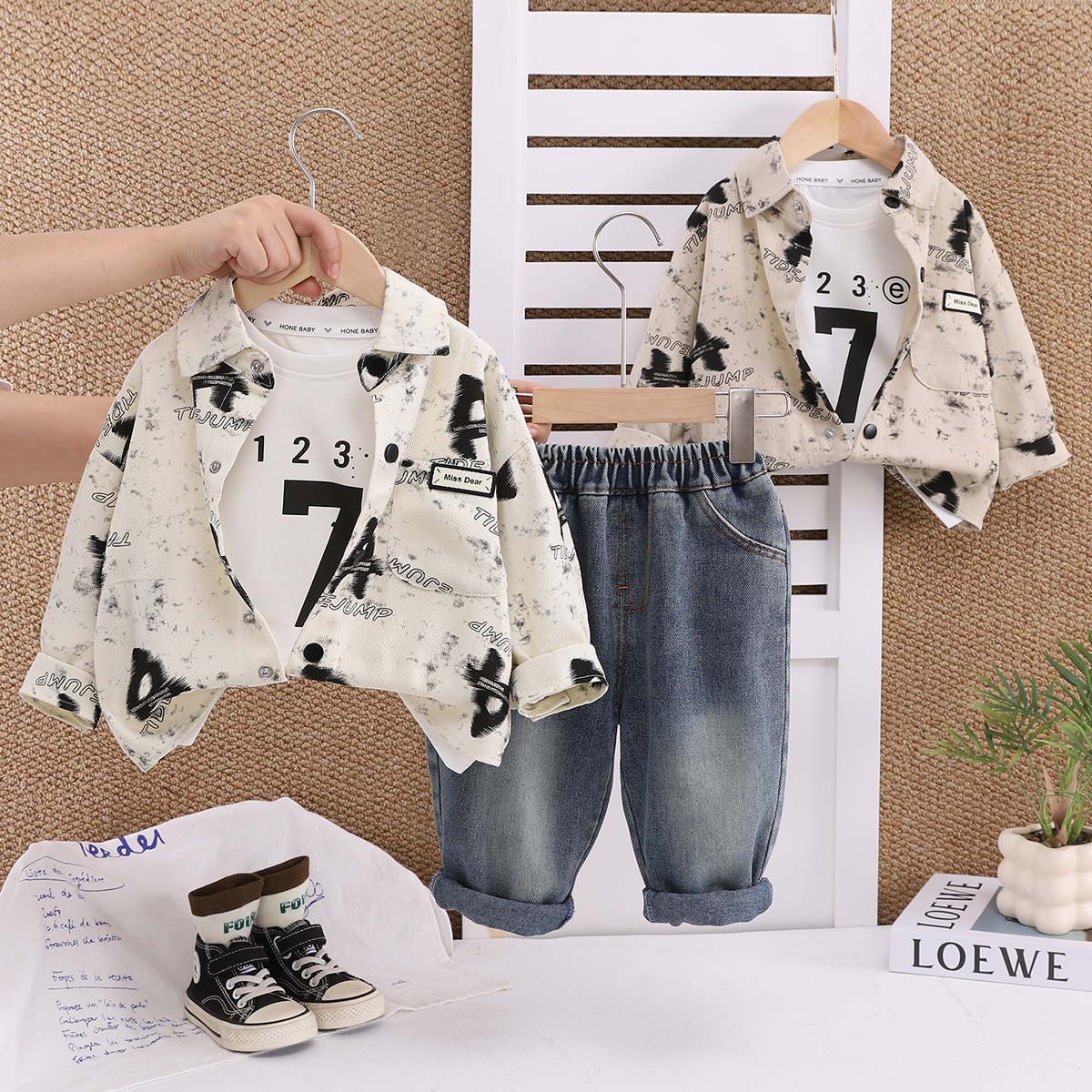 소년 의류 봄 의류 2025 가을 새로운 어린이 패션 전체 인쇄 문자 옷깃 재킷 셔츠 3 피스 양복 배치스토어 가기
