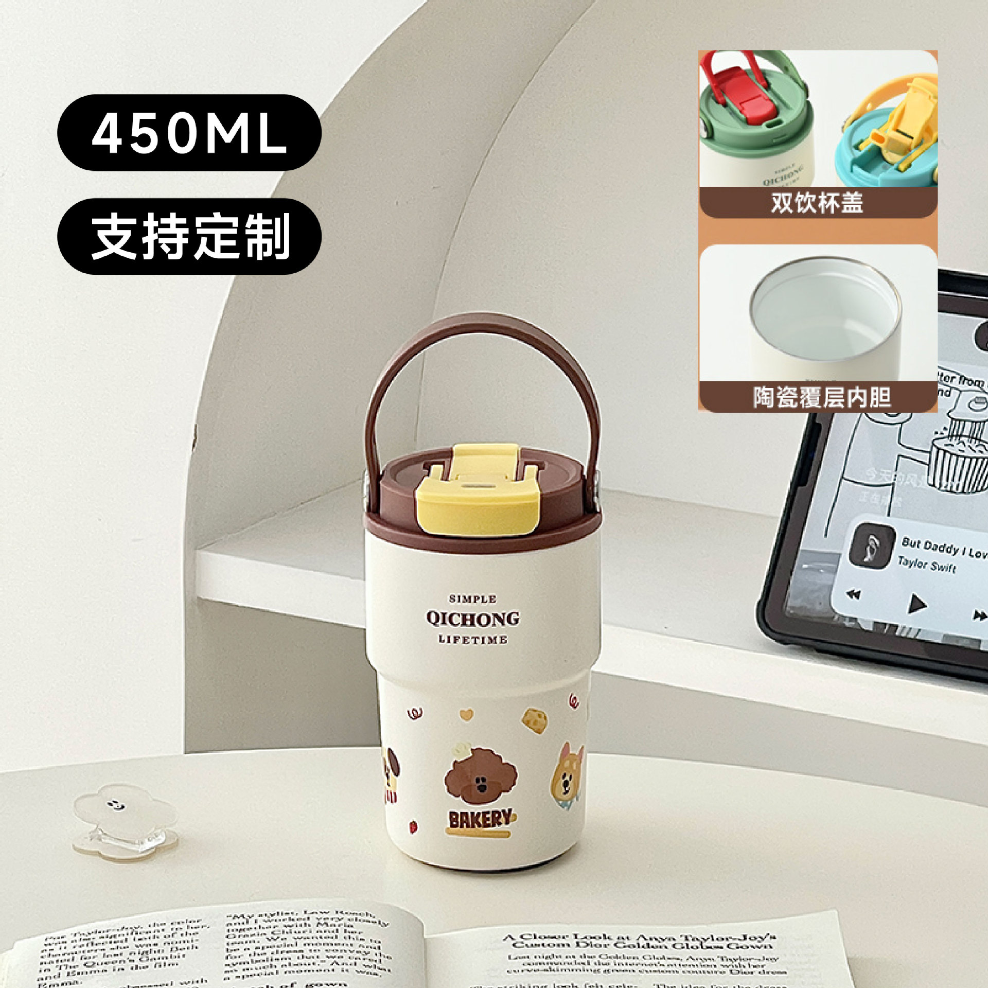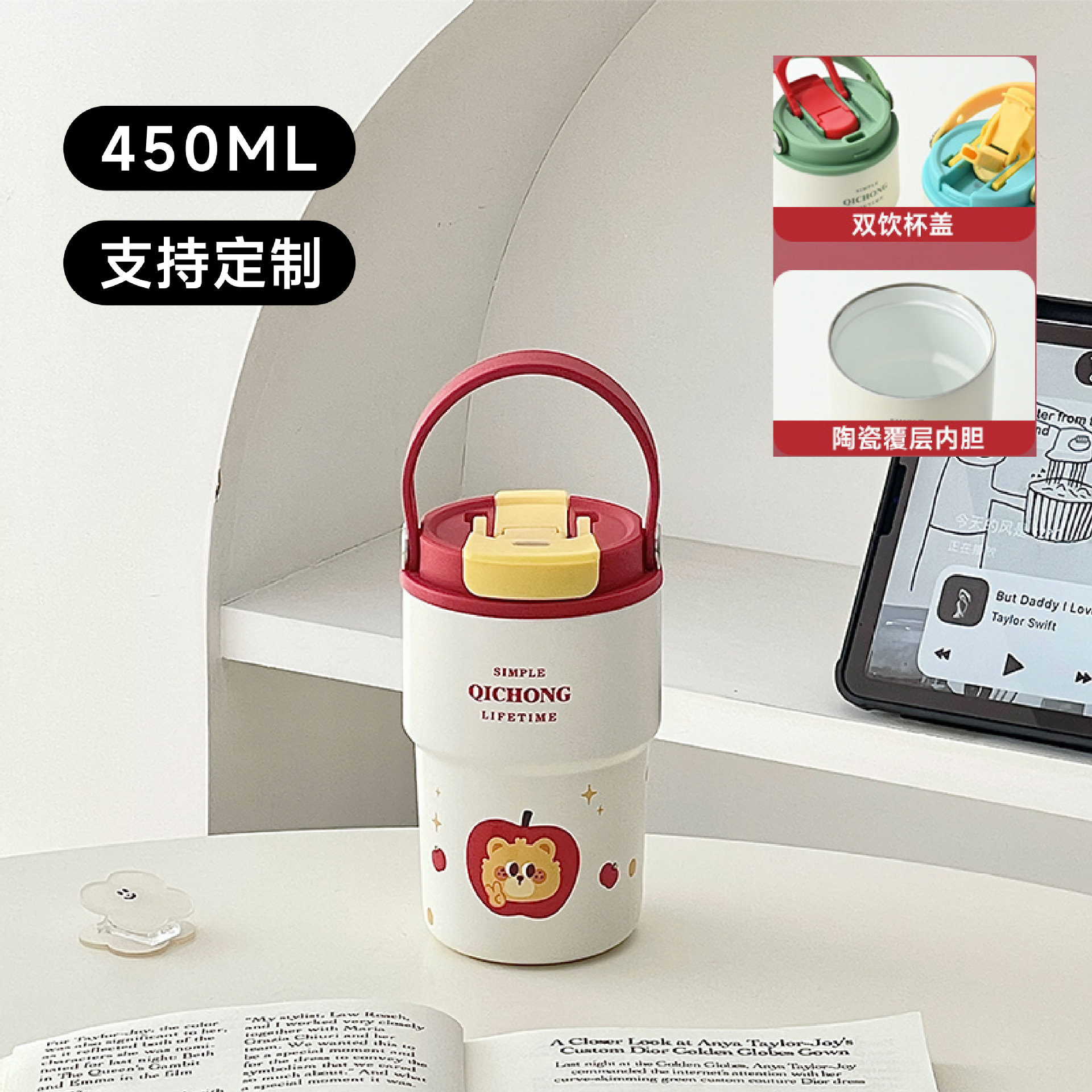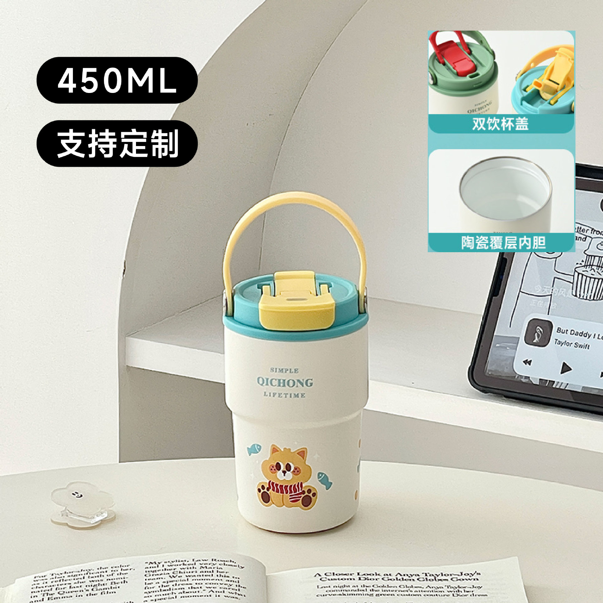 세라믹 라이너 보온병 컵 316 스테인레스 스틸 커피 컵 고급스러운 만화 패턴 더블 스트로 컵스토어 가기