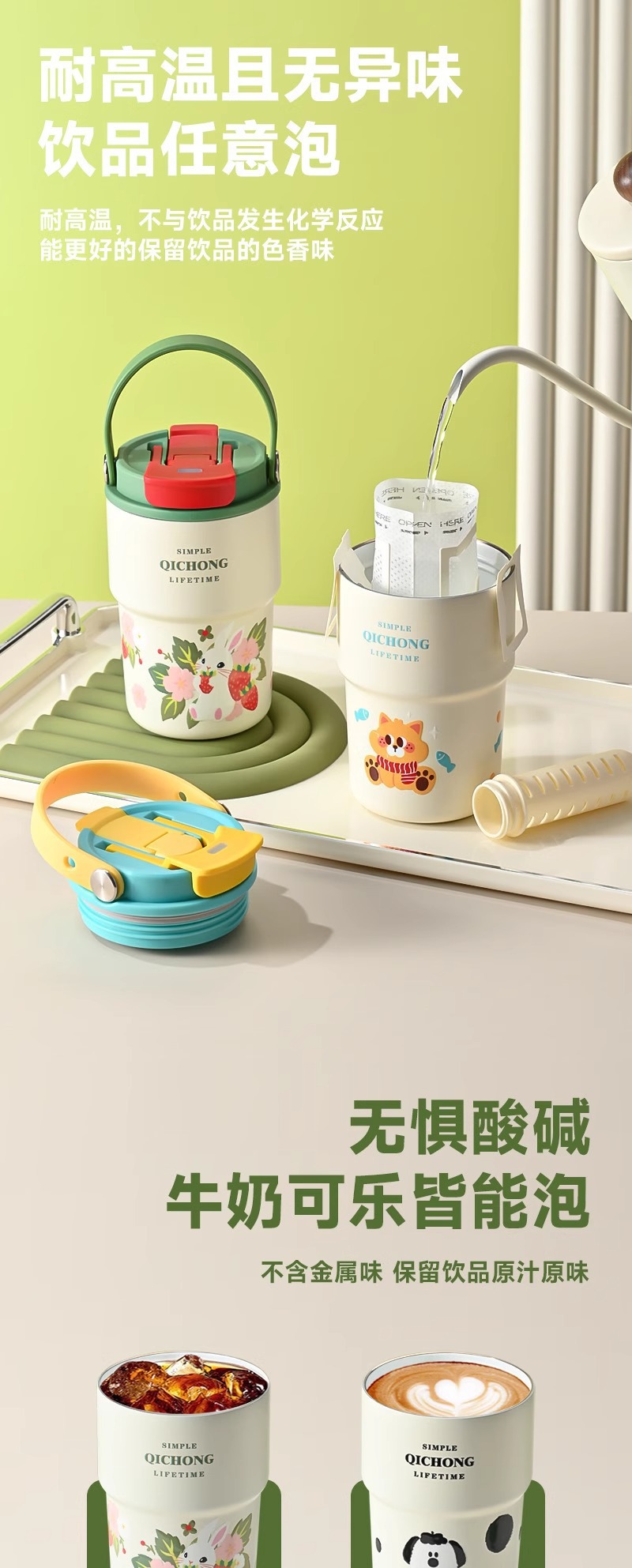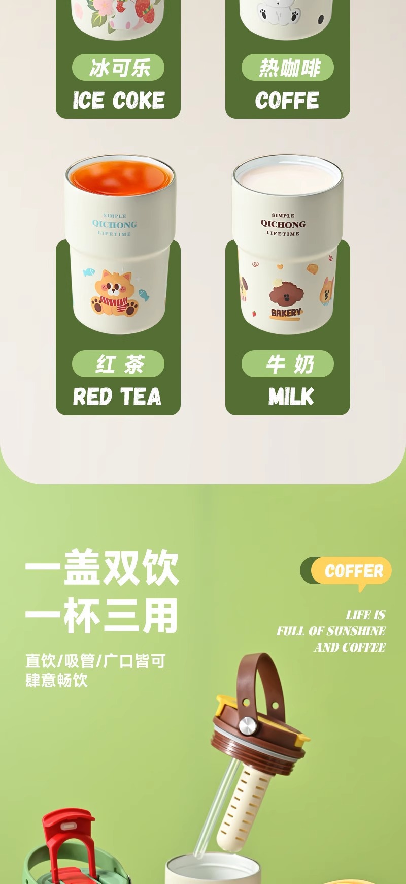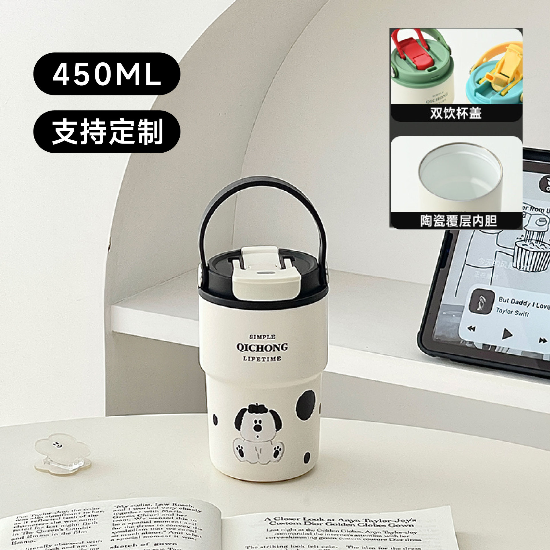 세라믹 라이너 보온병 컵 316 스테인레스 스틸 커피 컵 고급스러운 만화 패턴 더블 스트로 컵스토어 가기