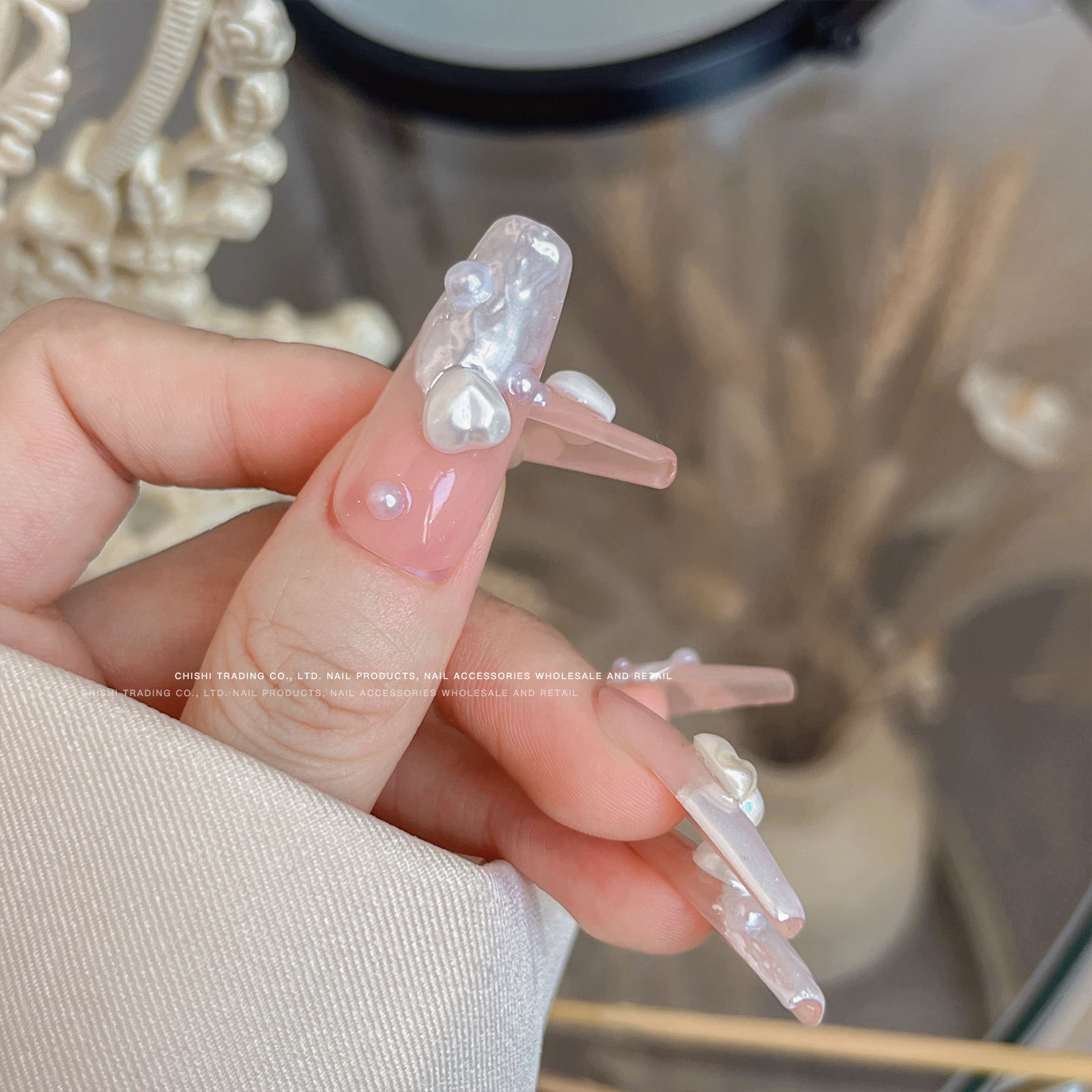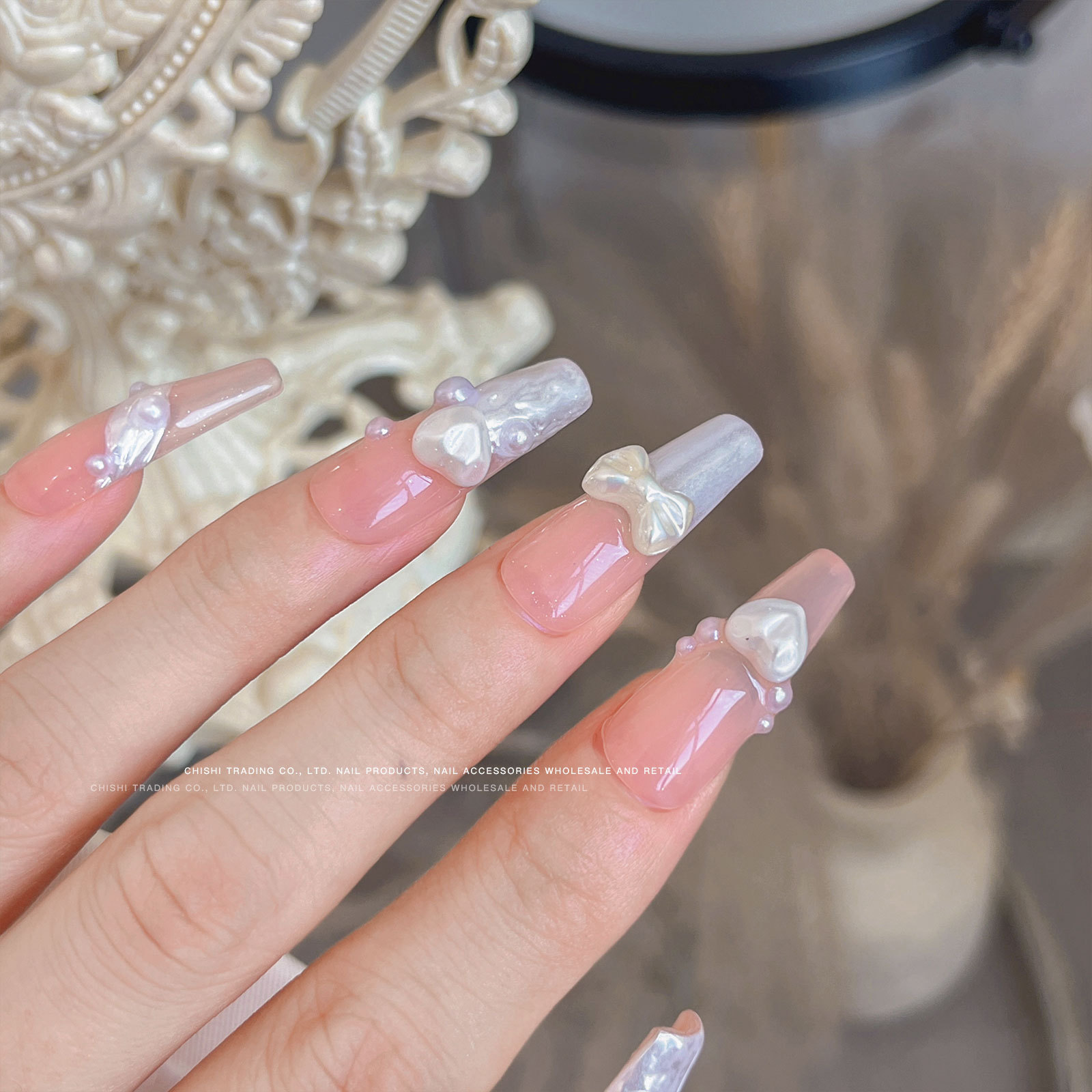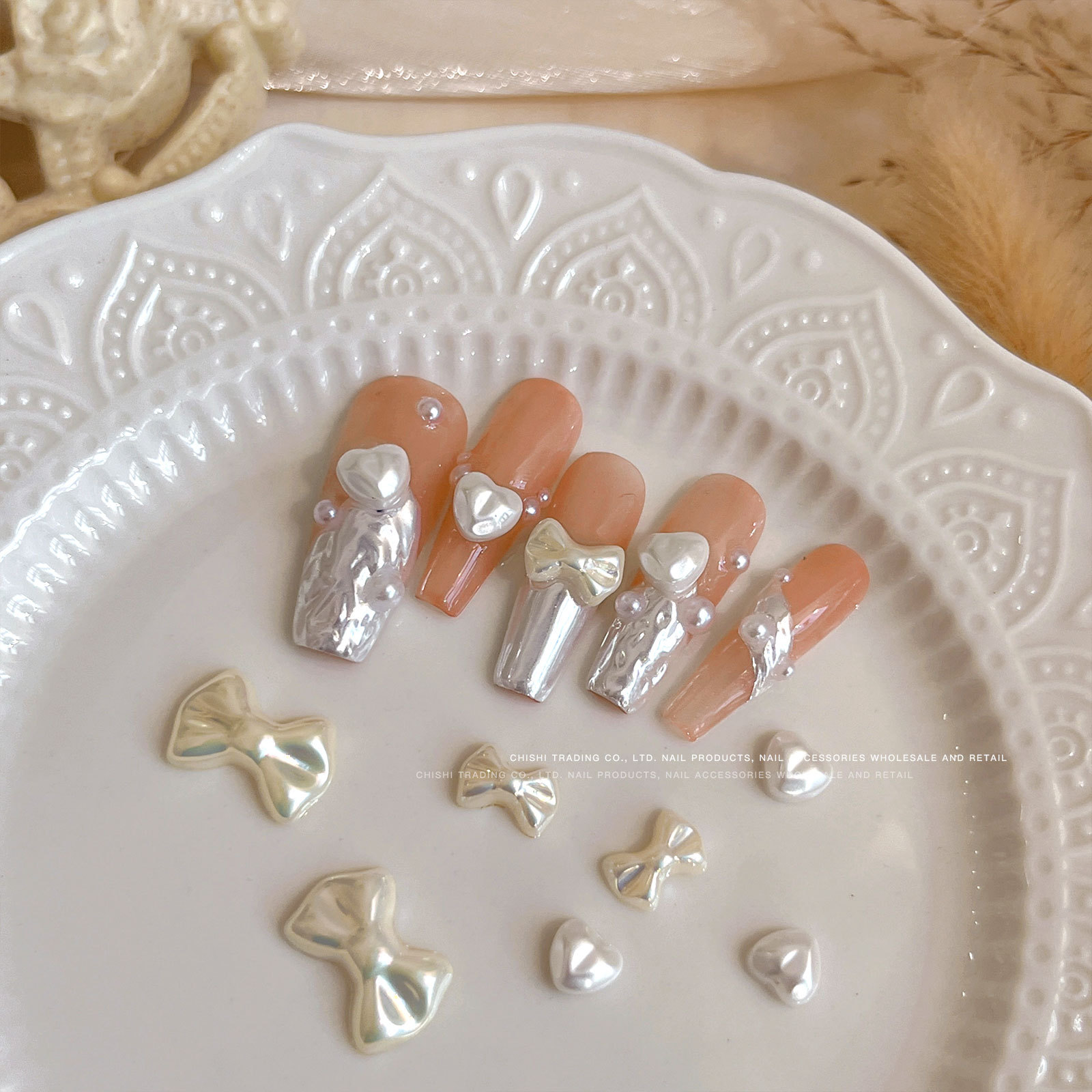진주 네일 아트 쥬얼리 2025 새로운 프랑스어 간단한 활 사랑 모조 쉘 플랫 네일 다이아몬드 장식 도매스토어 가기