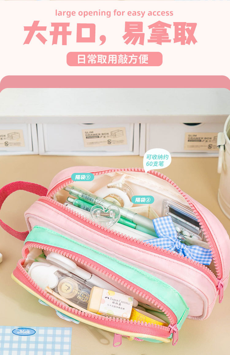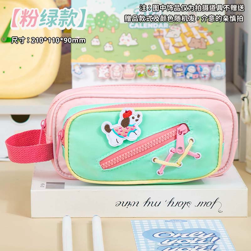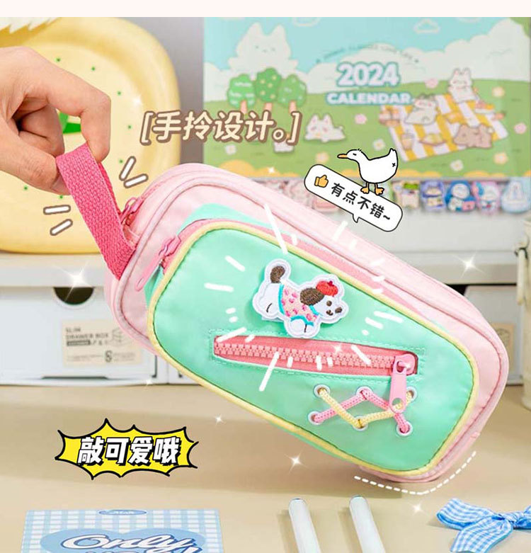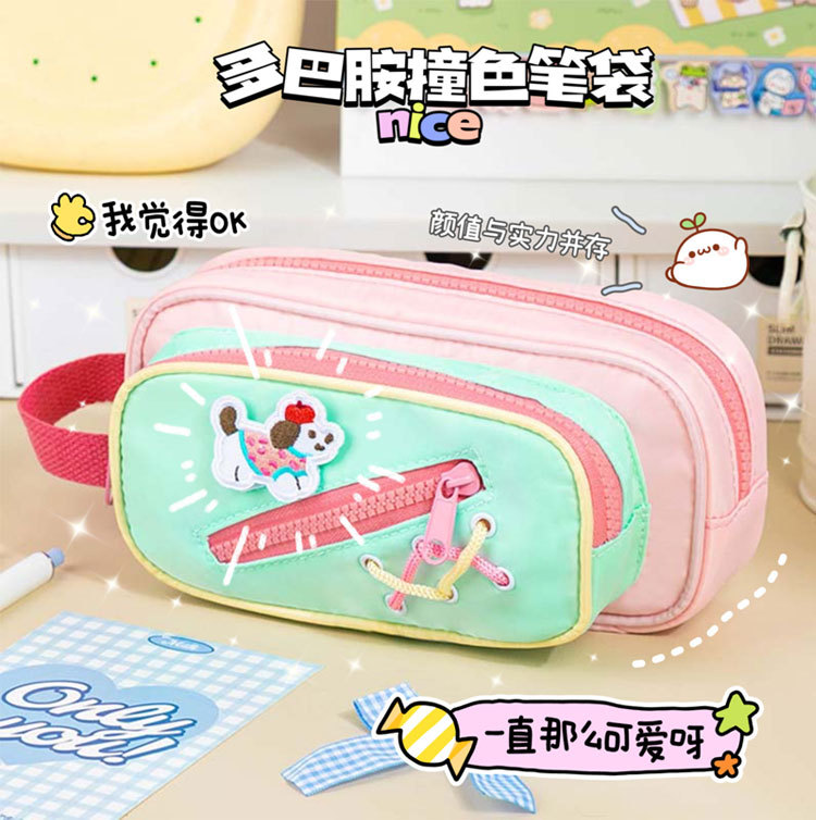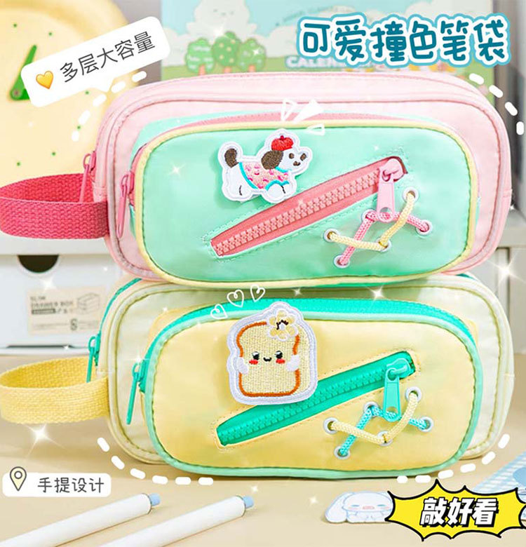 중학생을 위한 한국식 도파민 대비색 연필가방, 귀여운 대용량 보조 자수, 새로운 핸드헬드 스플라이스 문구류스토어 가기