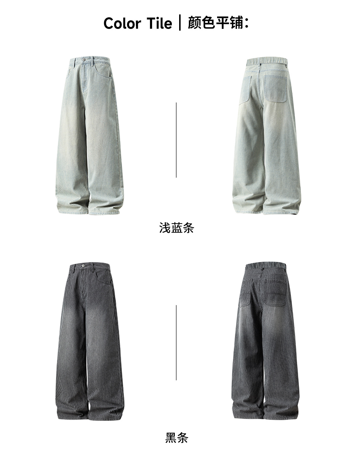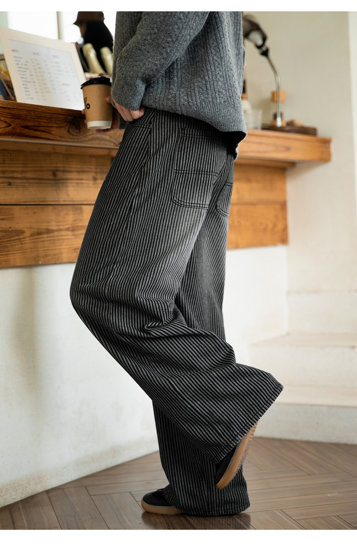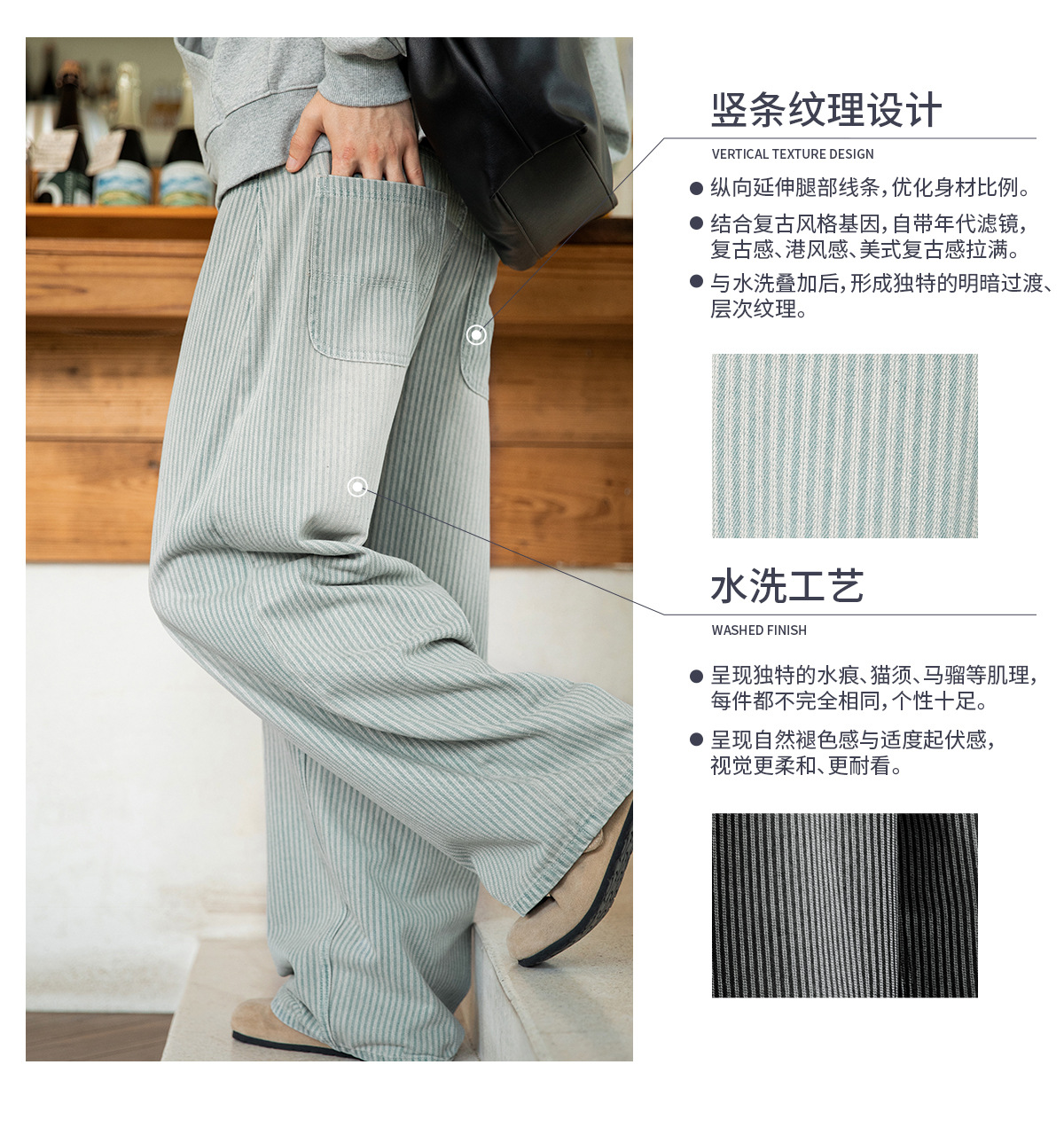 미국 레트로 스타일 세로 줄무늬 청바지 남성용 가을 모델 루즈핏 트렌디 브랜드 스트레이트 팬츠 워싱 빈티지 롱 팬츠