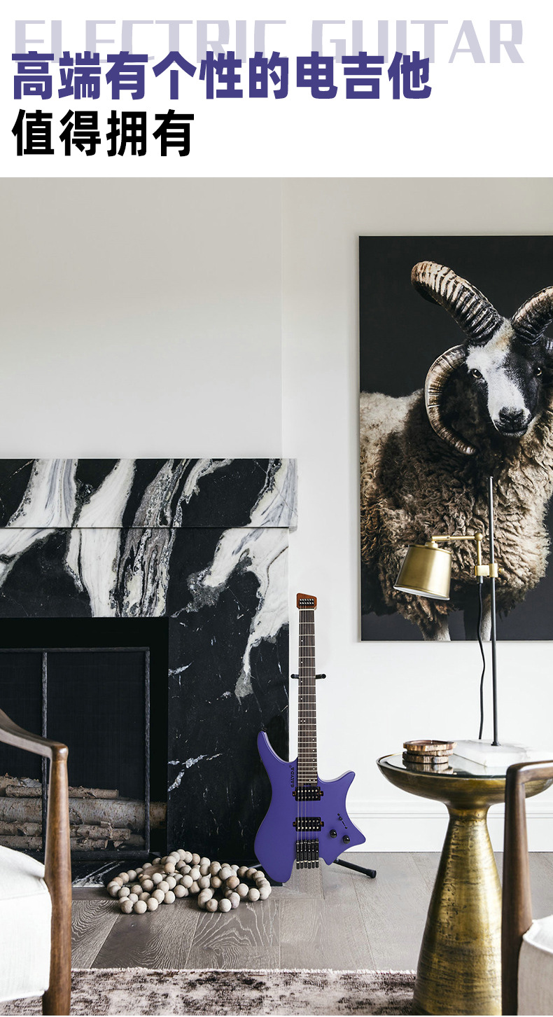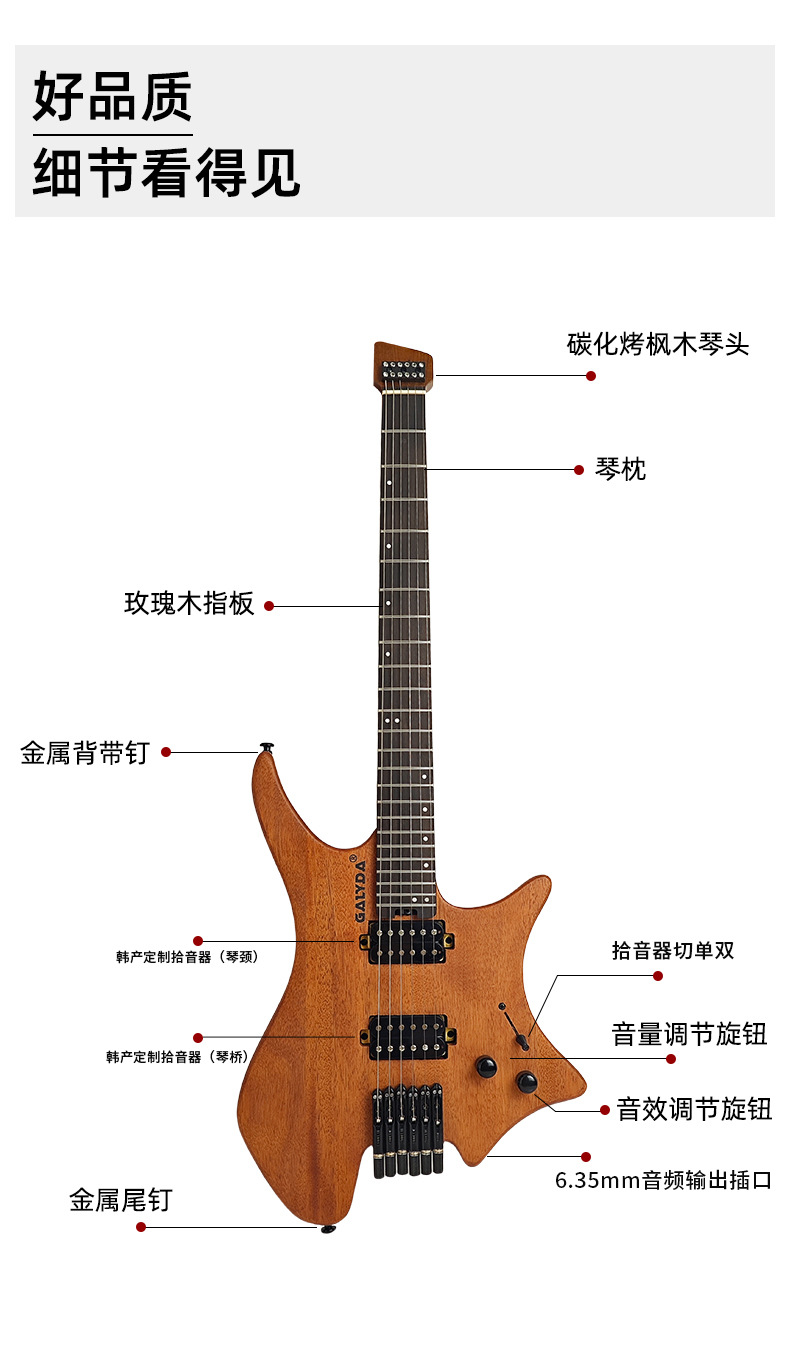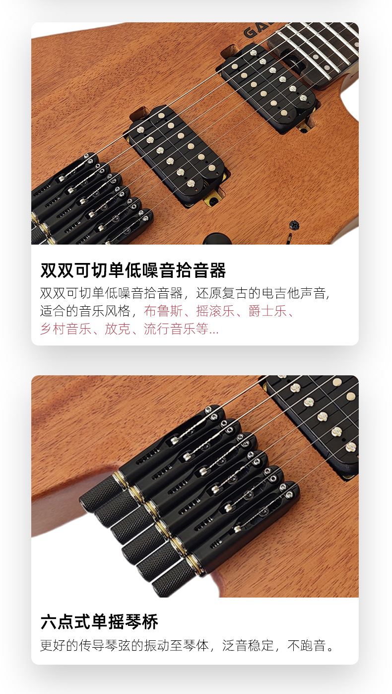 국경을 넘는 인기 모델 헤드리스 일렉트릭 기타 피치 월넛 여행용 록 보급형 기타 도매 고급 원목 일렉트릭 기타스토어 가기