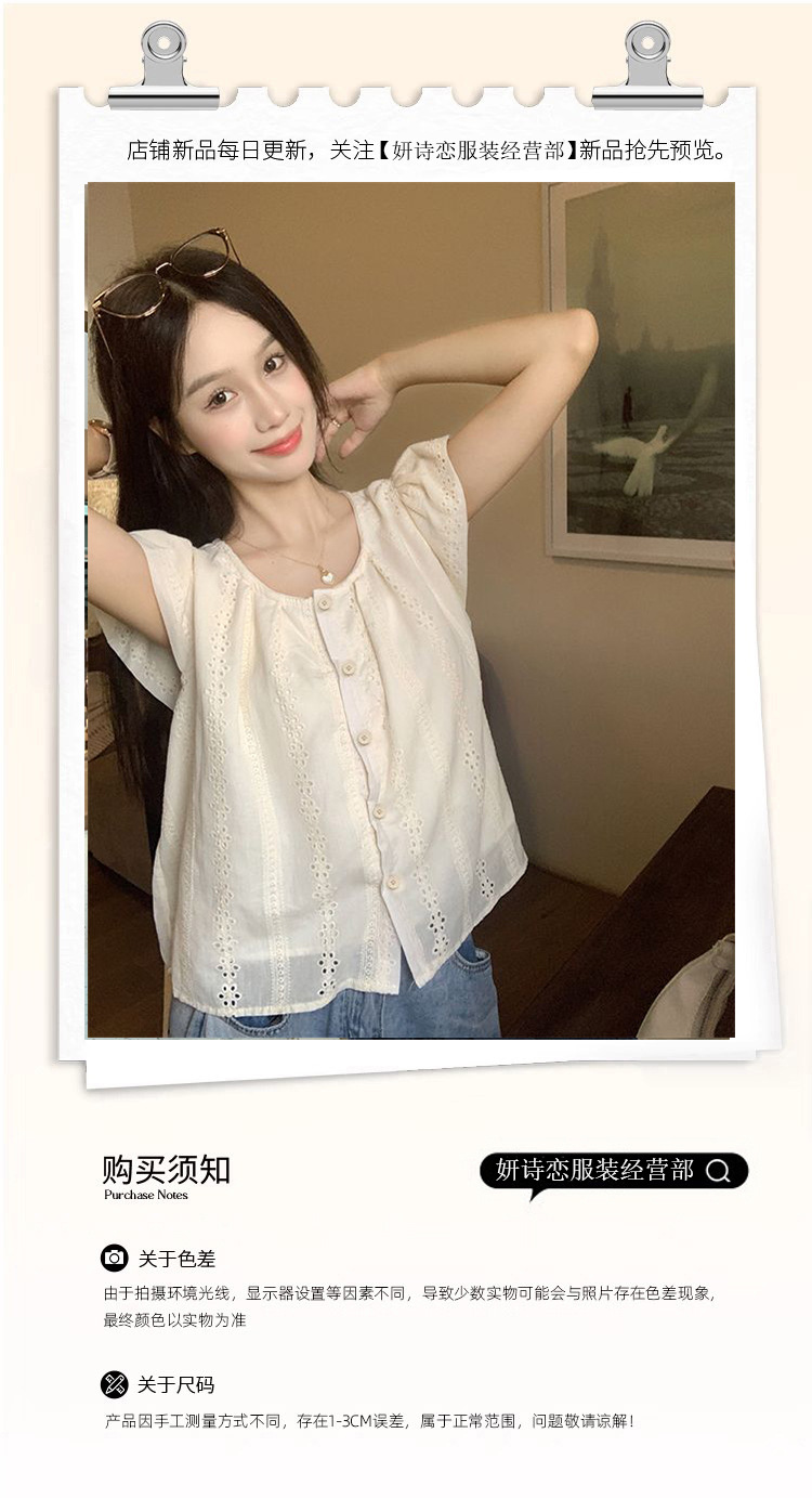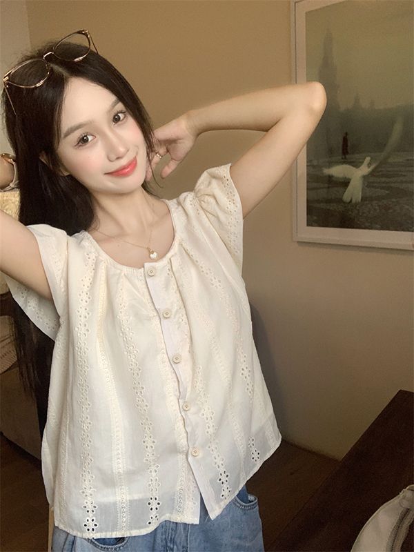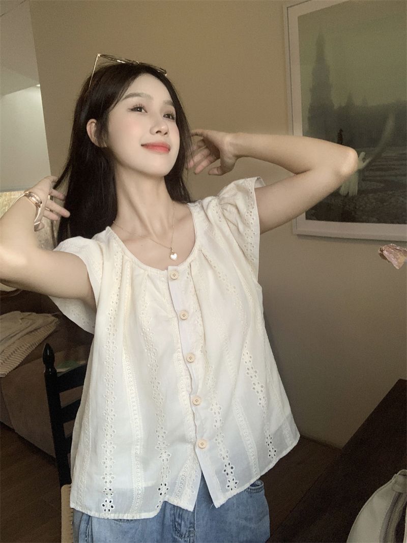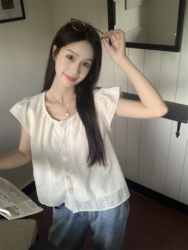 여성을위한 일본 복고풍 중공 작은 플라잉 슬리브 셔츠 여름 2025 새로운 디자인 인형 셔츠 오른쪽 어깨 반팔 탑스토어 가기