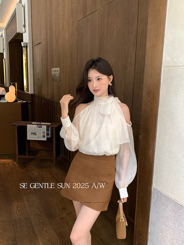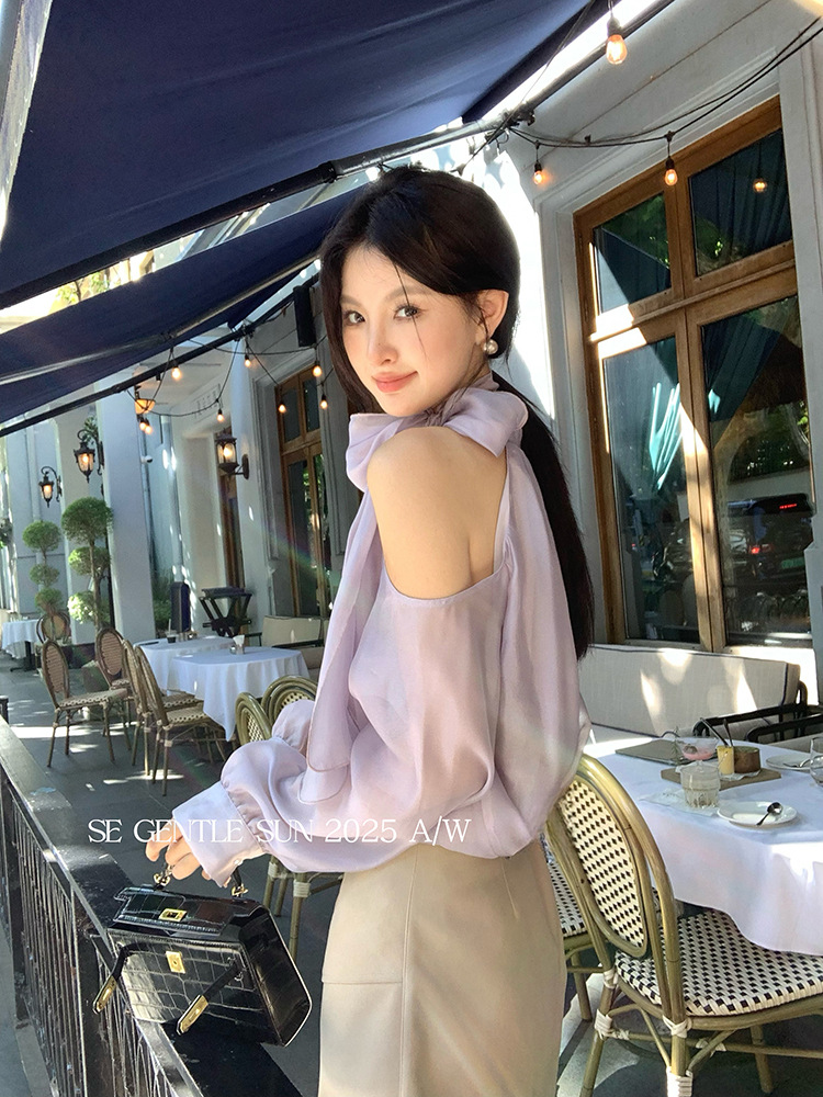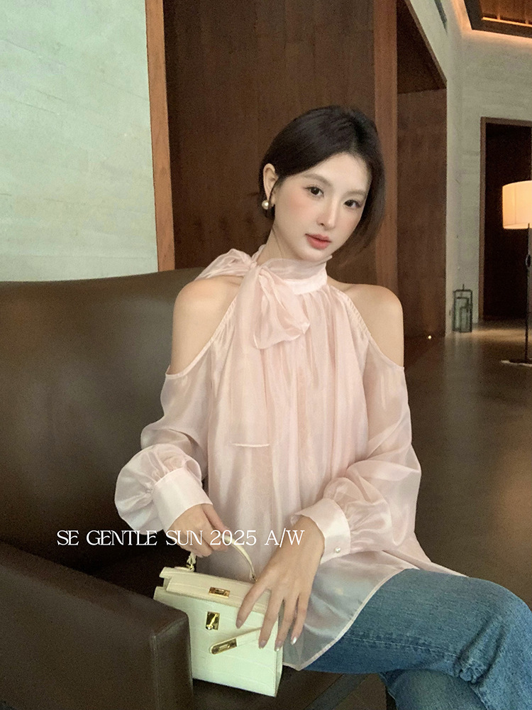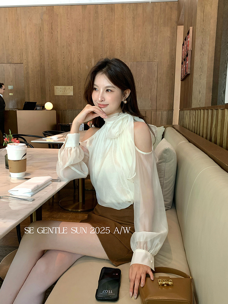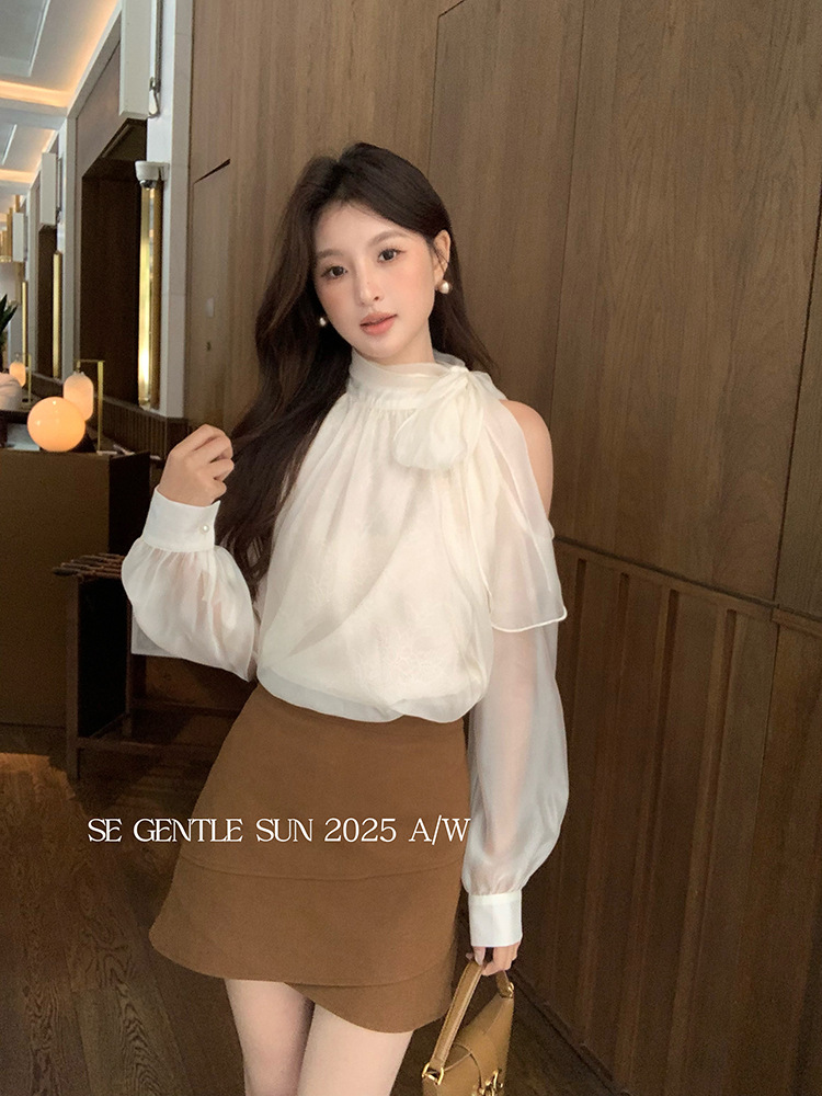 Xiuxixi 2025 가을 화이트 라벨 한국 스타일 다목적 기질 레이스 업 쉬폰 긴팔 셔츠 여성상의 89486