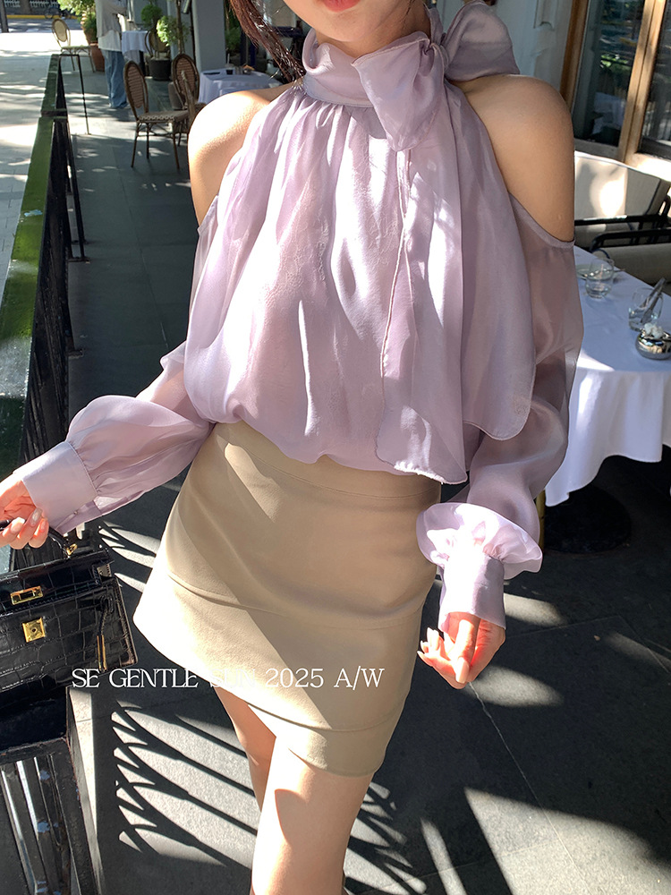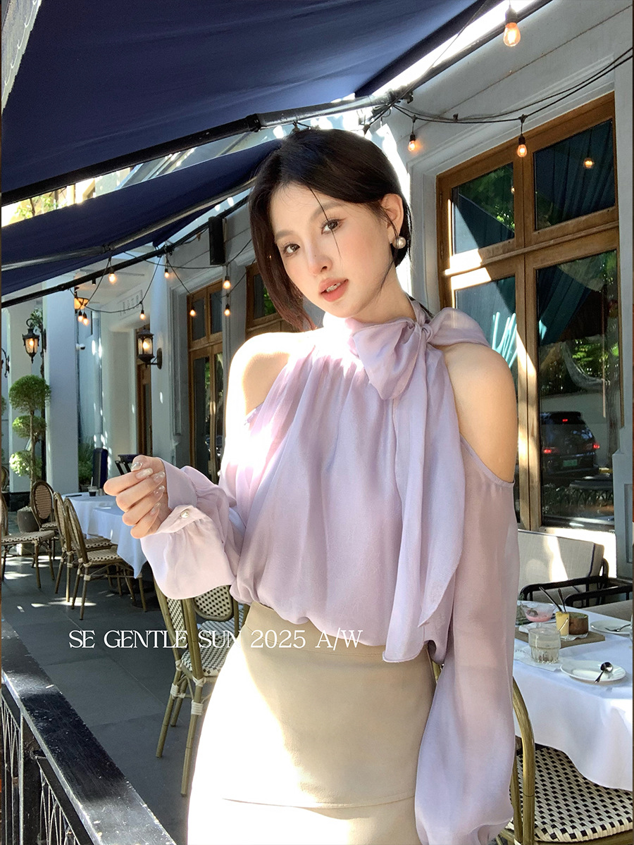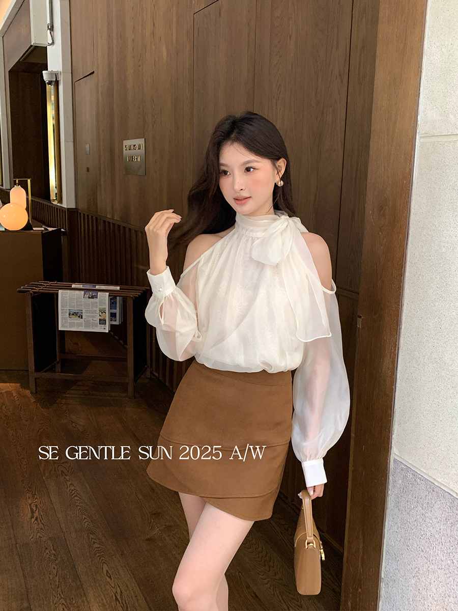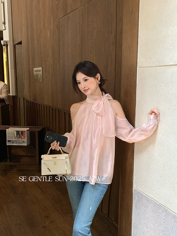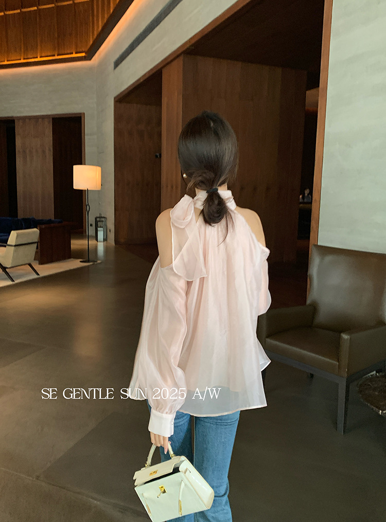 Xiuxixi 2025 가을 화이트 라벨 한국 스타일 다목적 기질 레이스 업 쉬폰 긴팔 셔츠 여성상의 89486