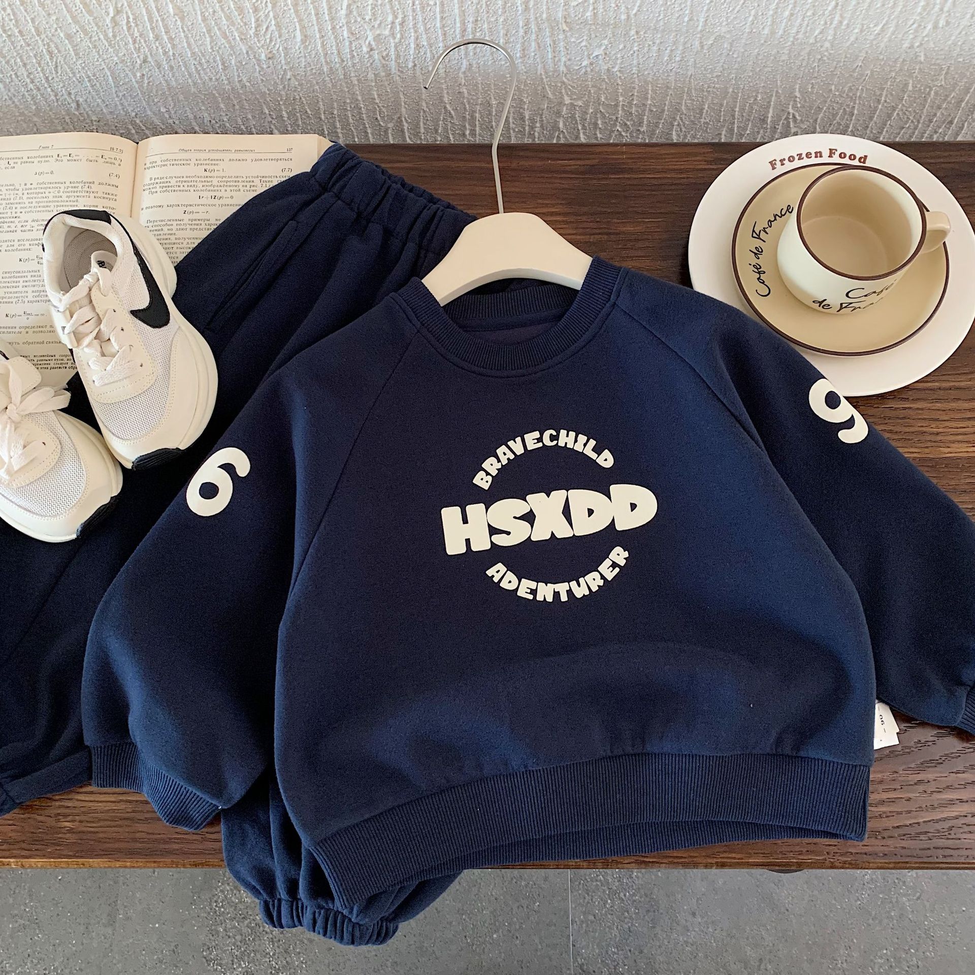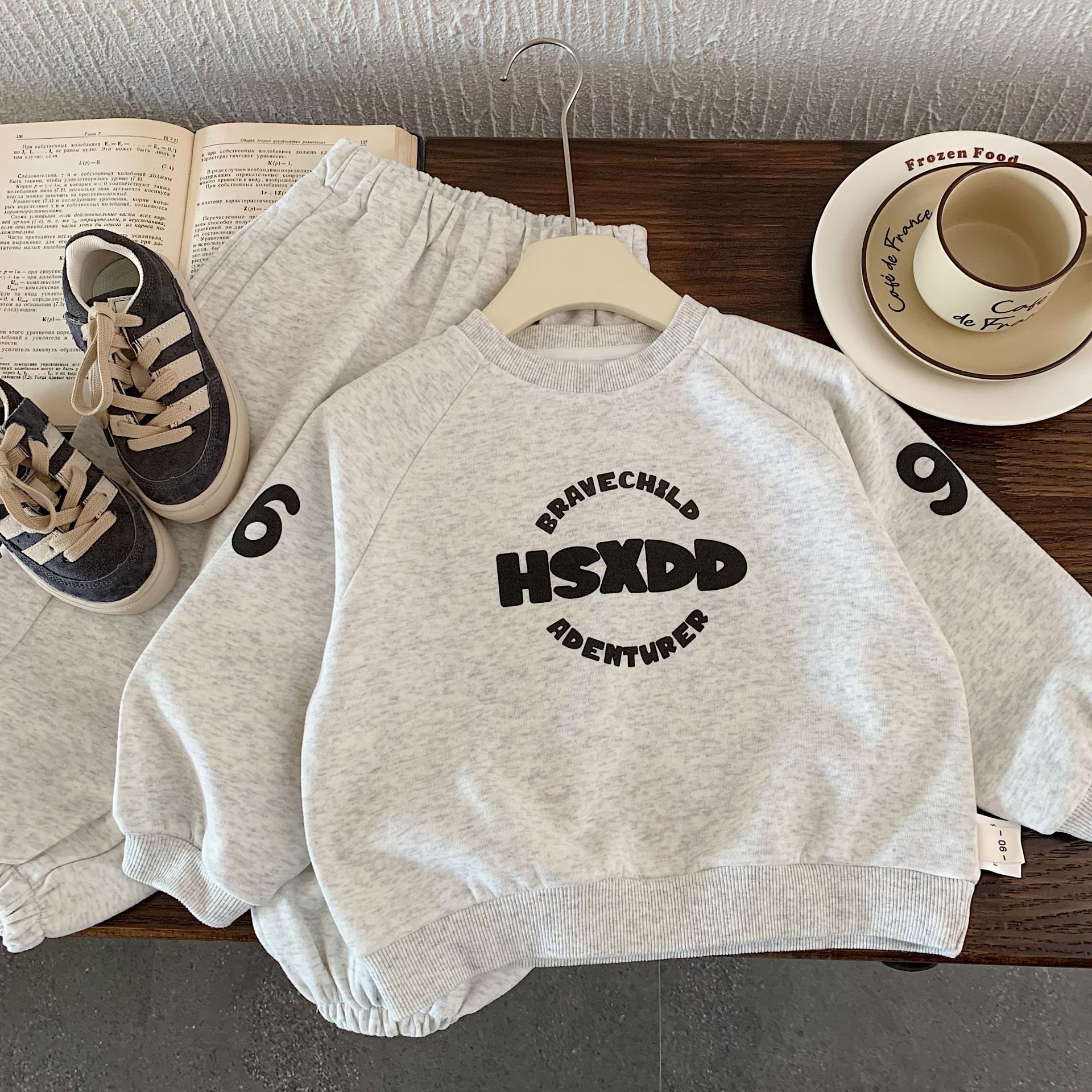 Bangcheng 아동복 2025 가을 새로운 한국어 버전 소년 편지 스포츠 투피스 세트 소년 가을 의류 유행 도매