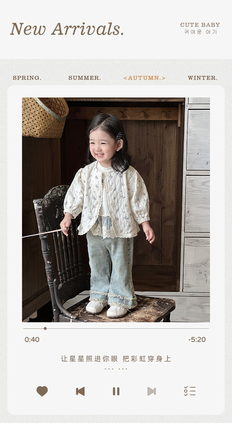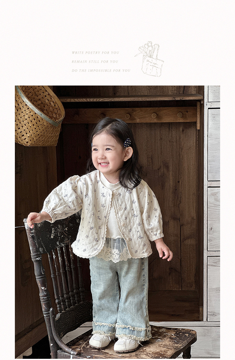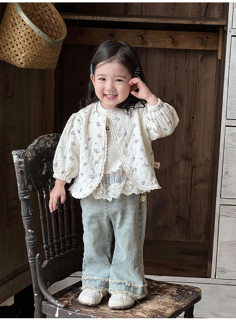 아기 소녀 한국 스타일 레이스 바닥 셔츠 유행 청바지 꽃 가디건 재킷 유아 및 어린이를위한 3 피스 세트 봄, 가을 스타일스토어 가기
