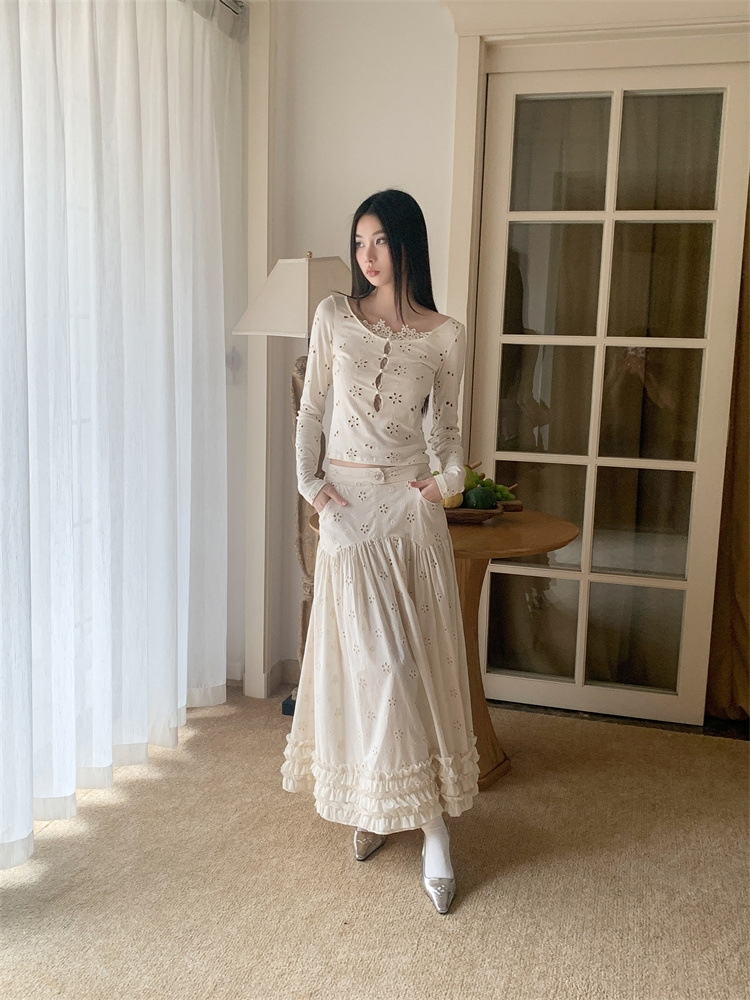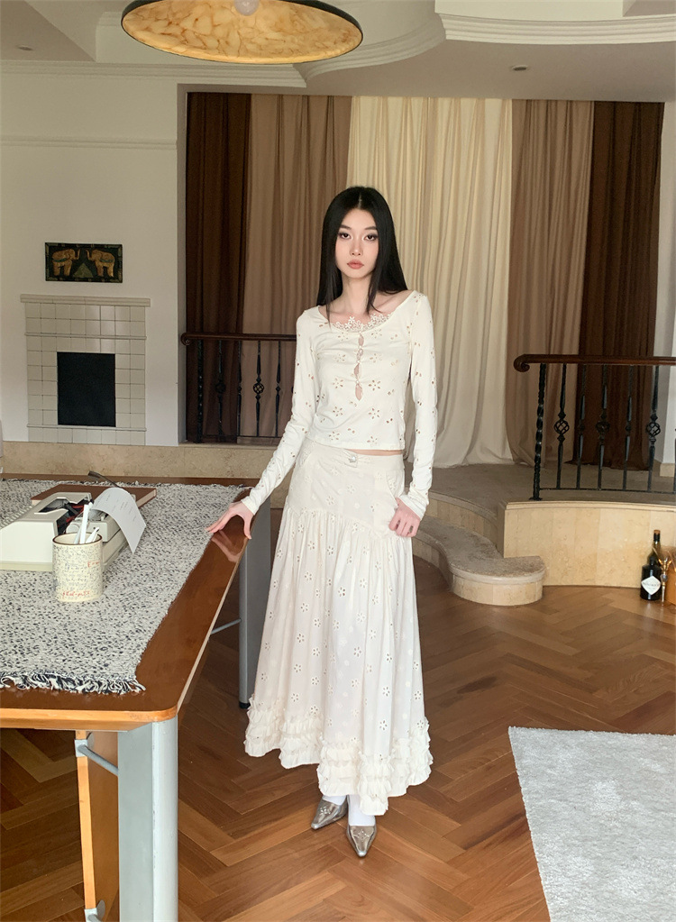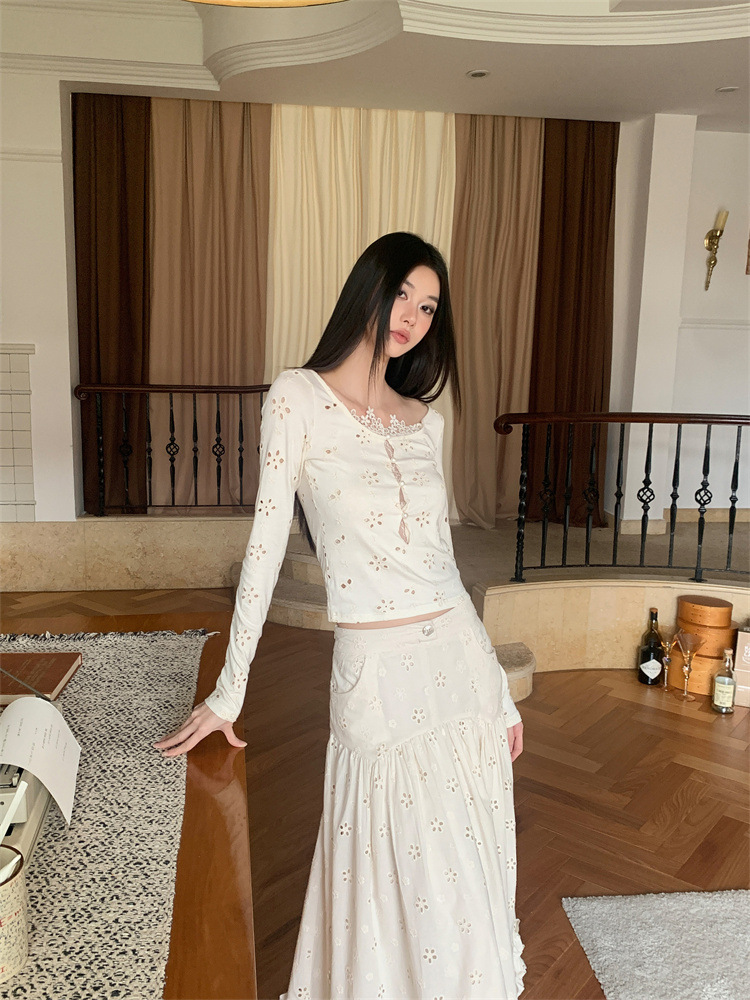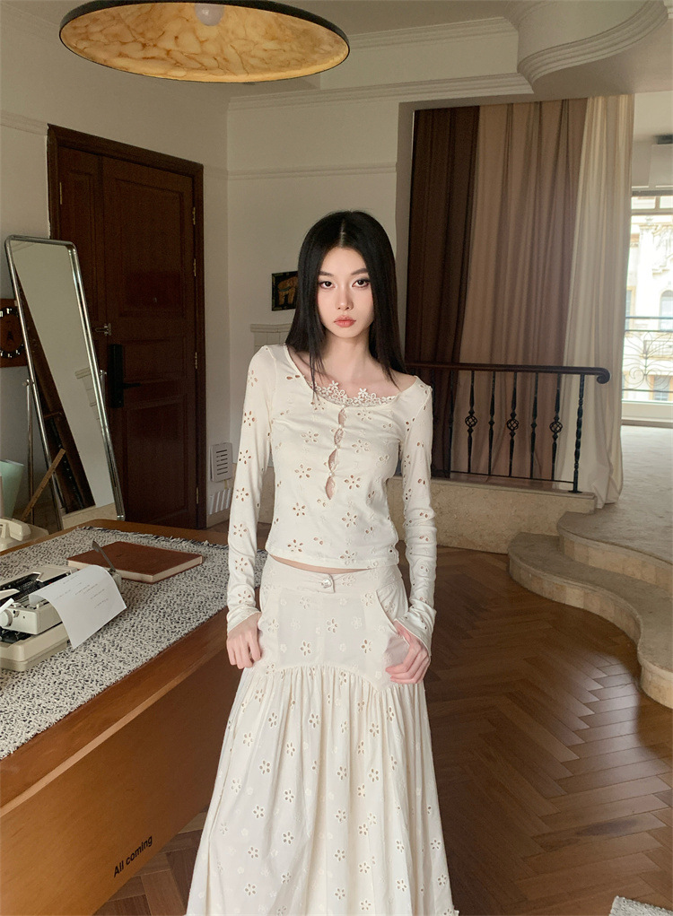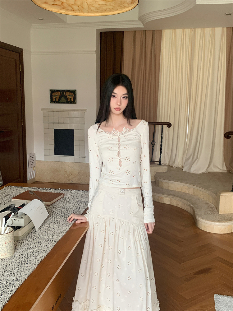 여성용 드레스 슈트, 틈새 레이스 스플라이싱 중공 셔츠 탑, 귀 스커트 투피스 세트스토어 가기