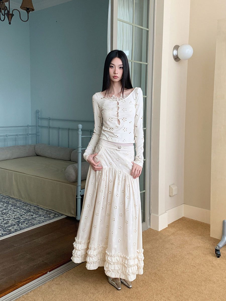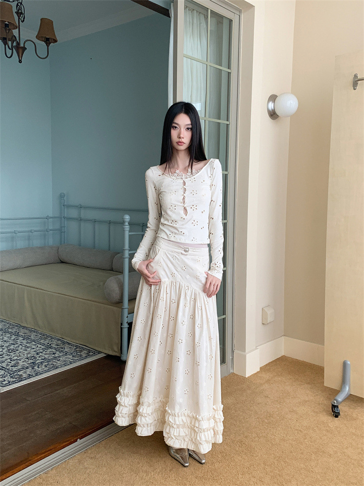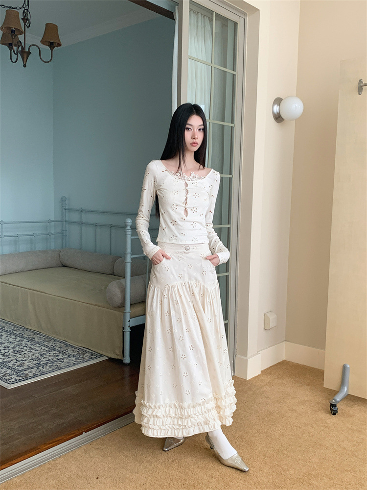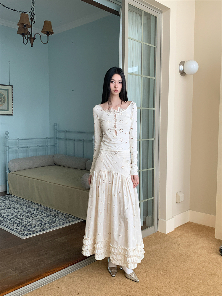 여성용 드레스 슈트, 틈새 레이스 스플라이싱 중공 셔츠 탑, 귀 스커트 투피스 세트스토어 가기