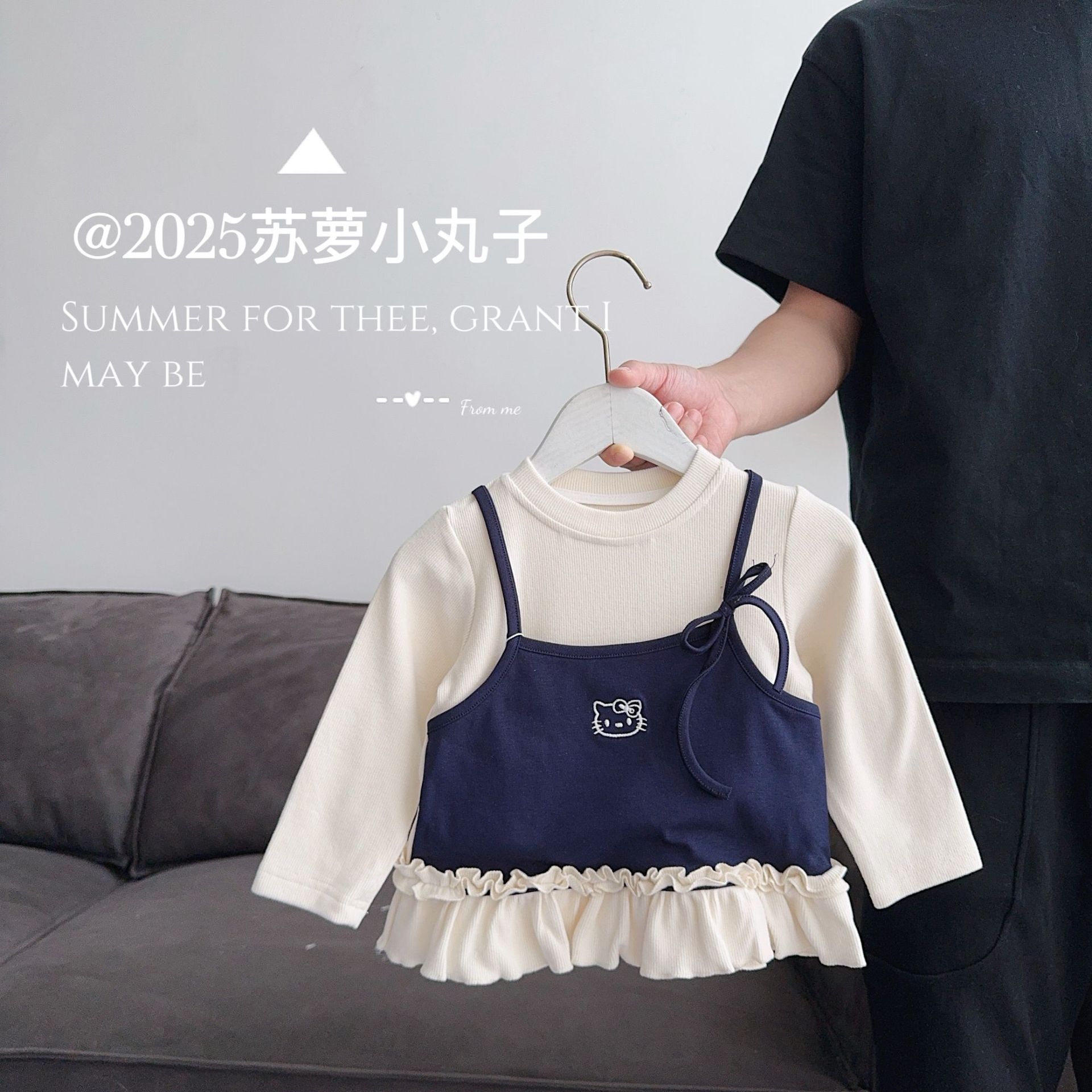 2025 가을 0-3 세 소녀, 유아 및 어린이 한국 스타일 만화 고양이 가짜 투피스 긴팔 셔츠 티셔츠 탑