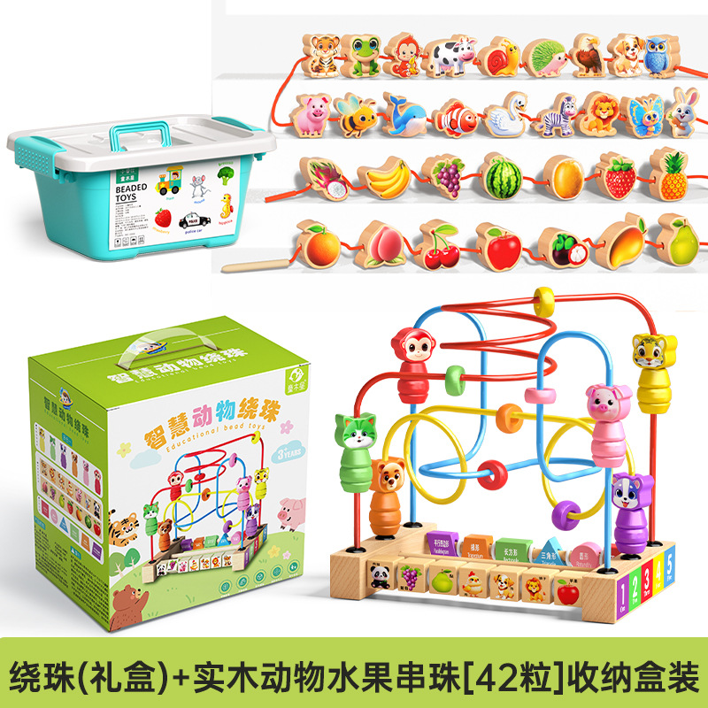 • 5인 1원목 조기교육용 구슬 [익스프레스 박스 + 수납 컬러박스] + 원목 동물과 과일 구슬 [42개 + 수납 컬러박스]