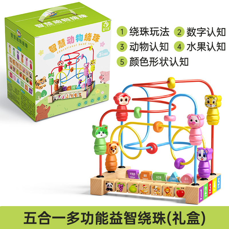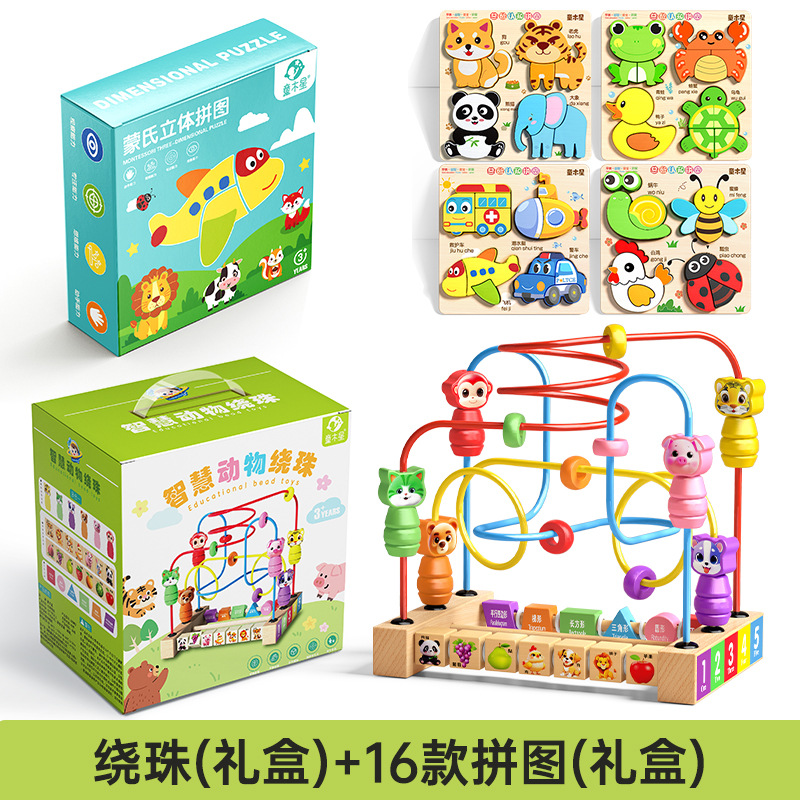 • 5-in-1 원목 유아 교육용 구슬 미로 [택배 상자 + 수납 컬러 박스] + 16종 원목 퍼즐 선물 세트