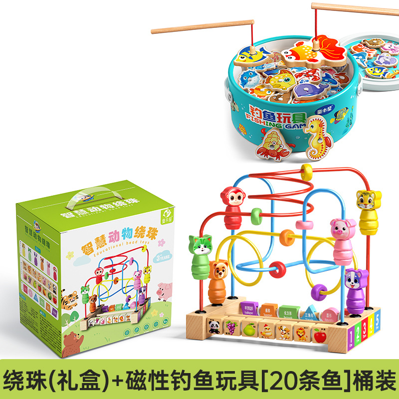 • 5-in-1 원목 유아 교육용 구슬 미로 [택배 상자 + 수납 컬러 박스] + 자석 낚시 놀이 장난감 [통에 물고기 20마리]