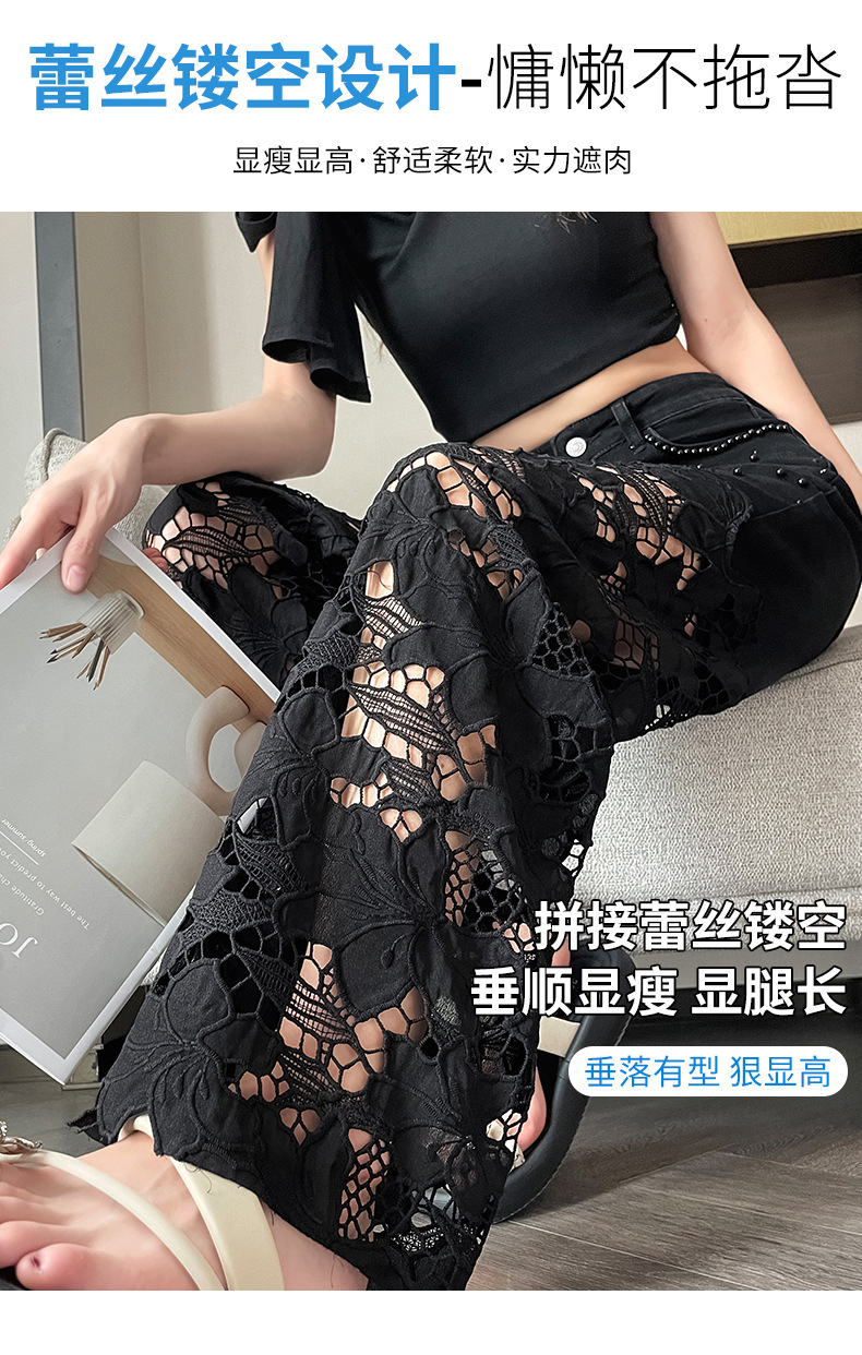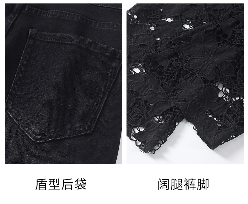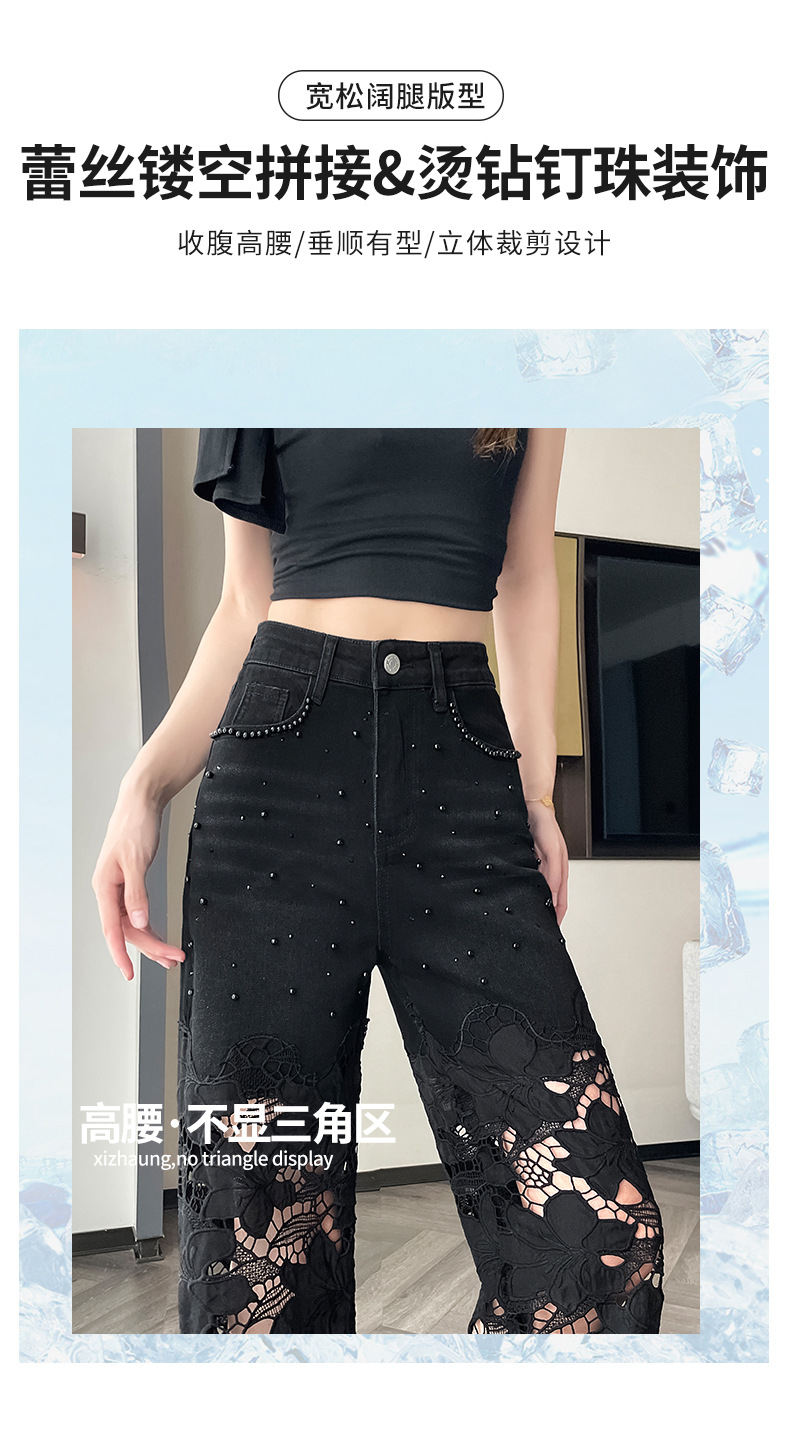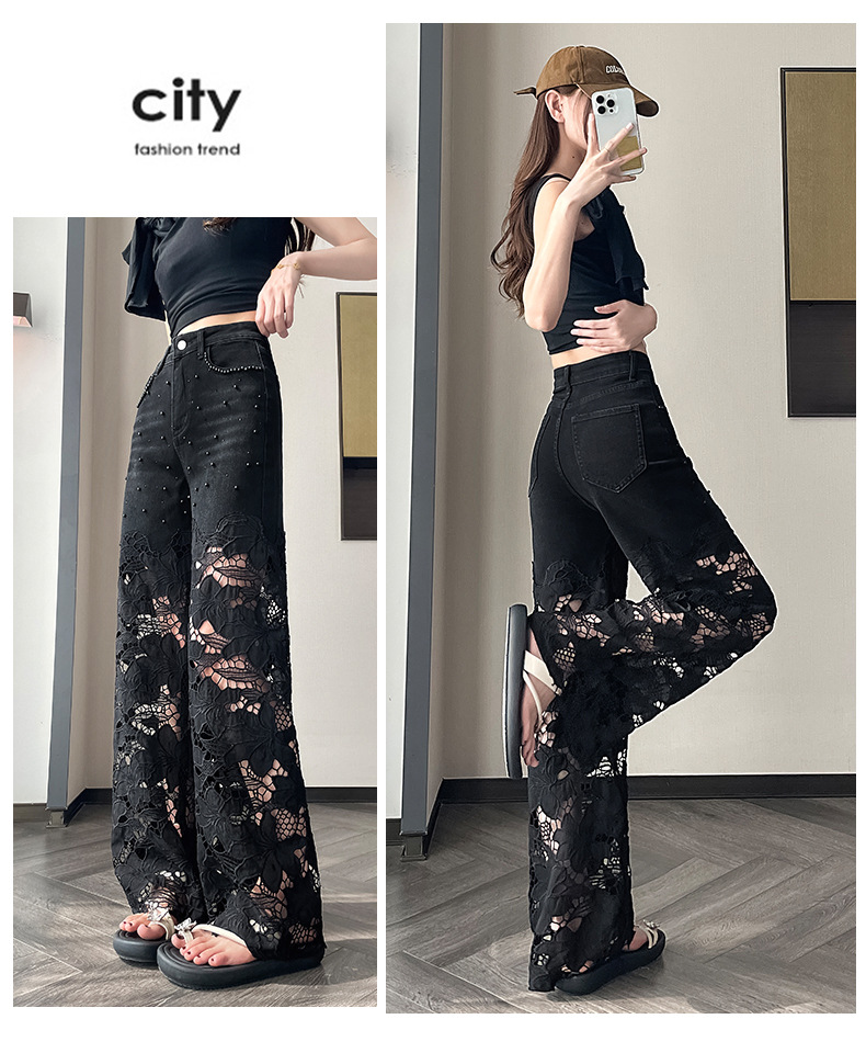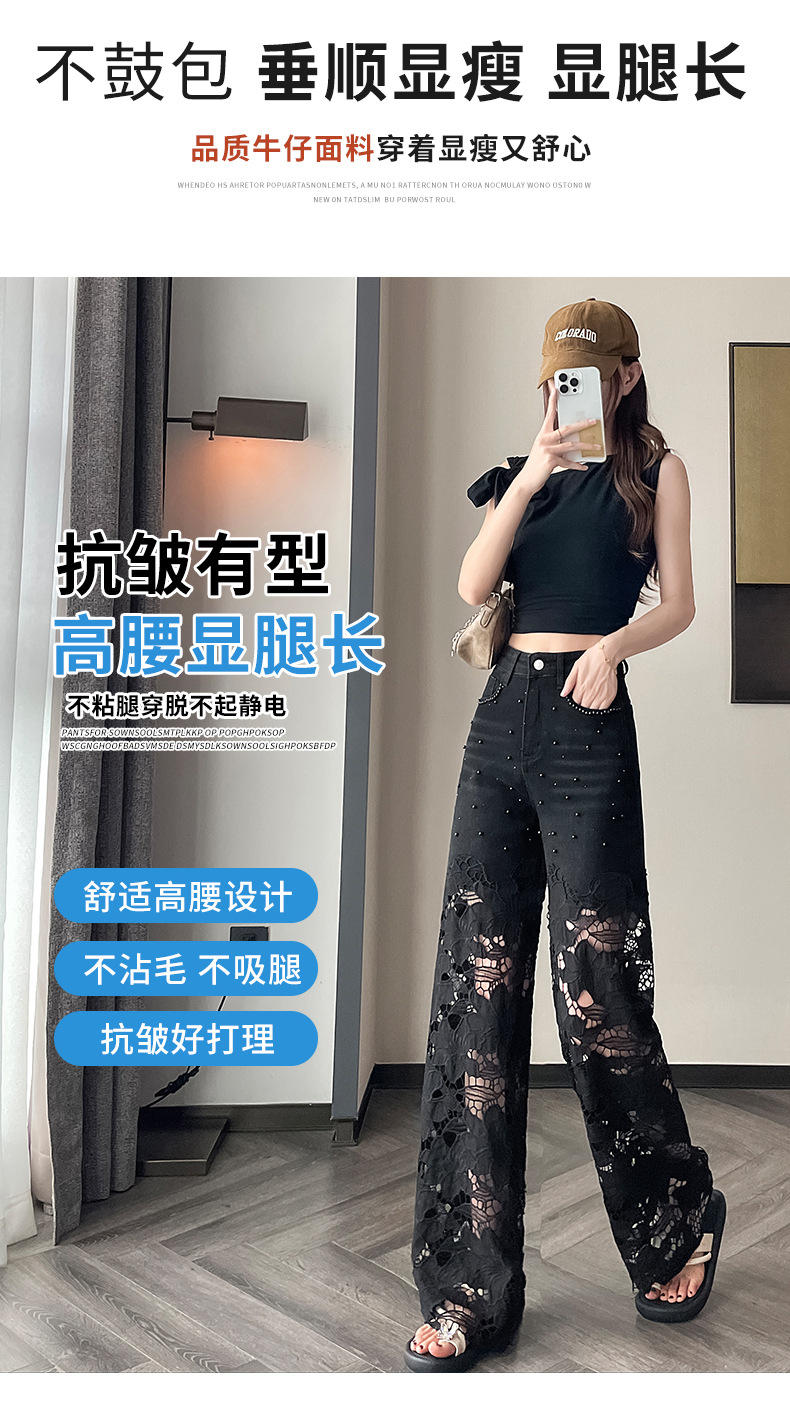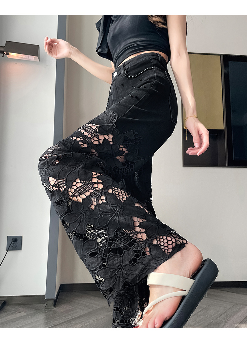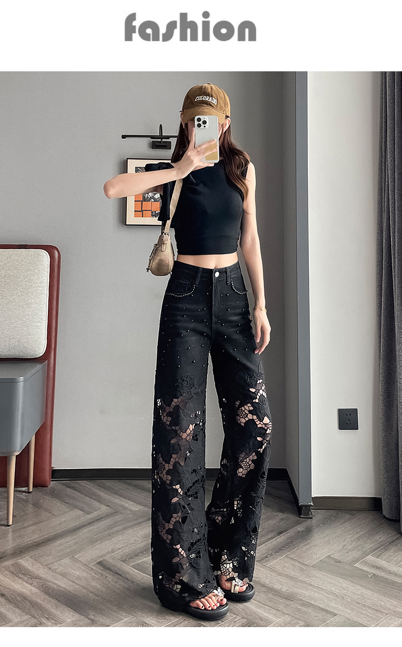 2539 # 블랙 스트레치 여름 스트레이트 팬츠 중공 패턴 패션 얇은 하이 웨이스트 찢어진 여성 청바지스토어 가기