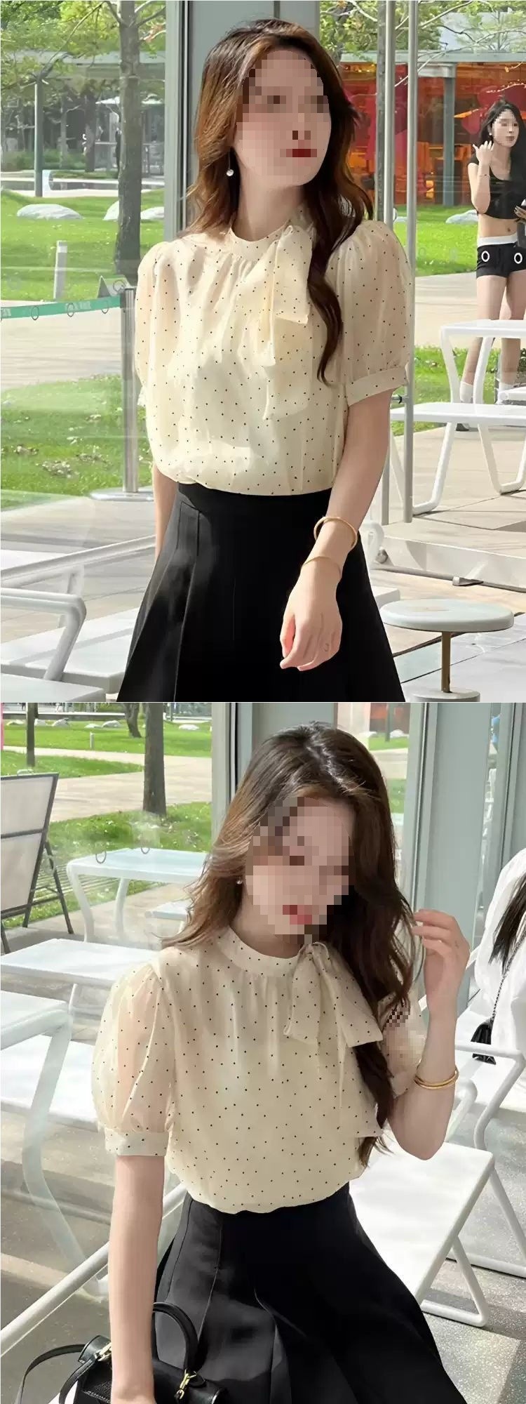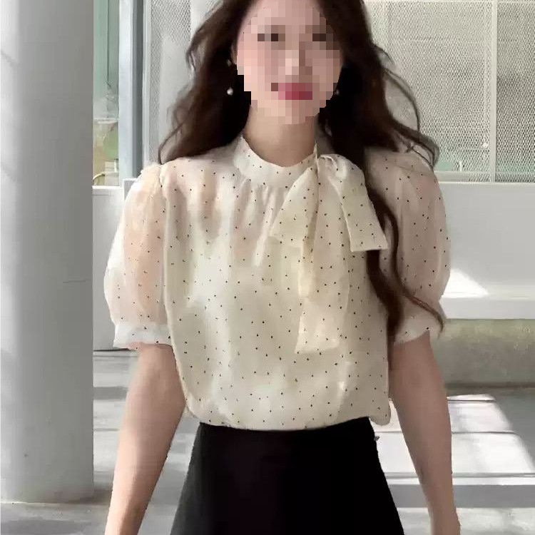 여름 여성을 위한 프렌치 스타일 보우 패셔너블 레이스업 반팔 셔츠 새로운 다용도 쉬폰 한국식 폴카 도트 탑